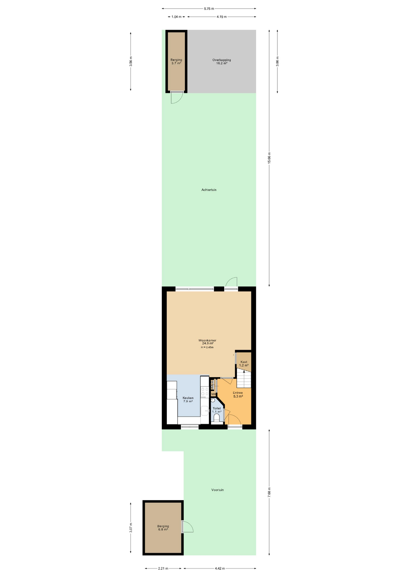 De voortuin is netjes aangelegd en biedt toegang tot de aangebouwde stenen berging. Deze berging is ideaal voor het stallen van fietsen en extra opslag.