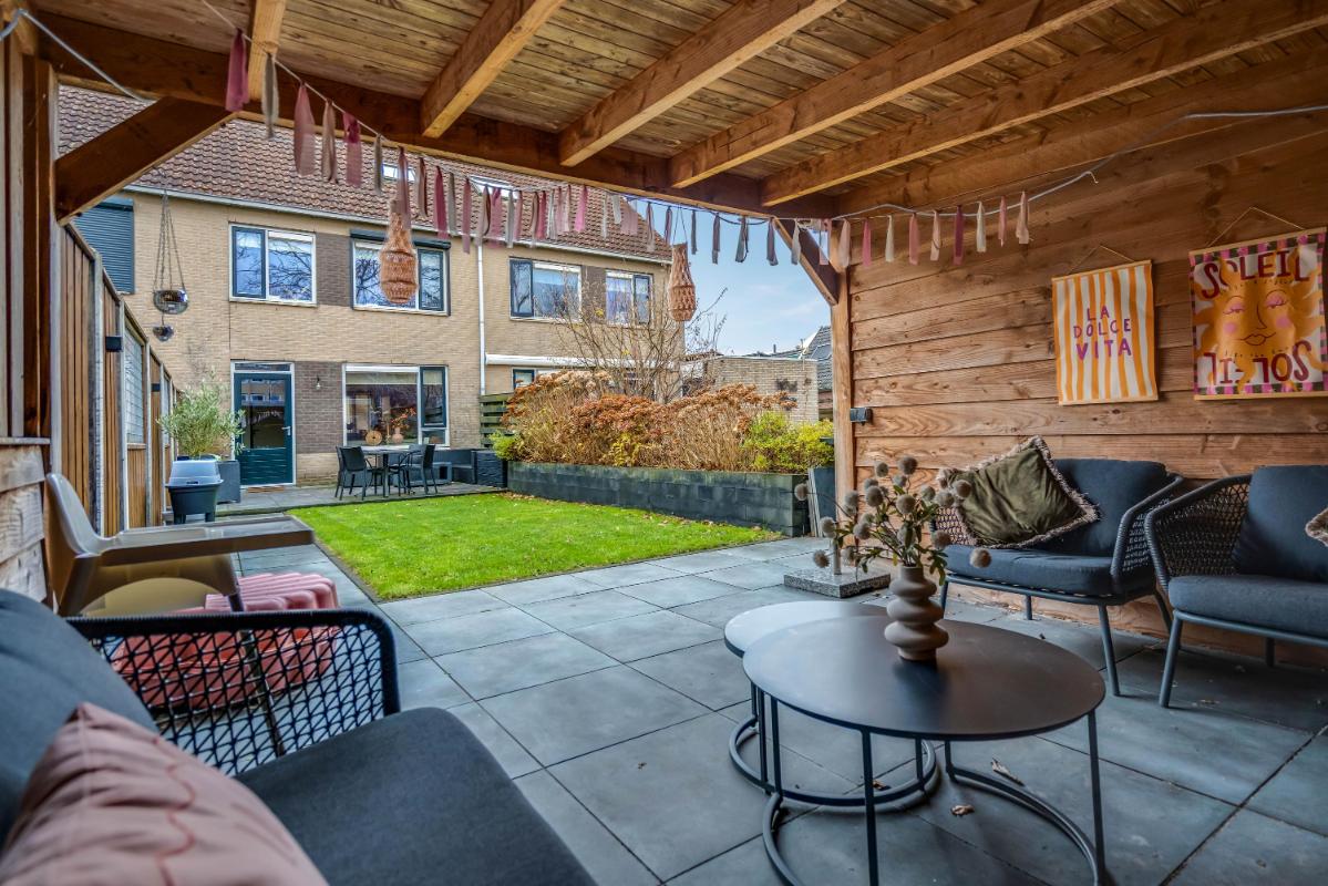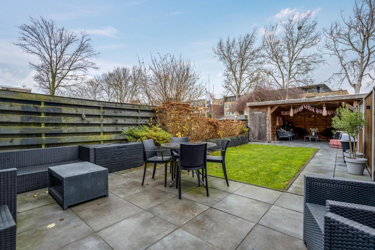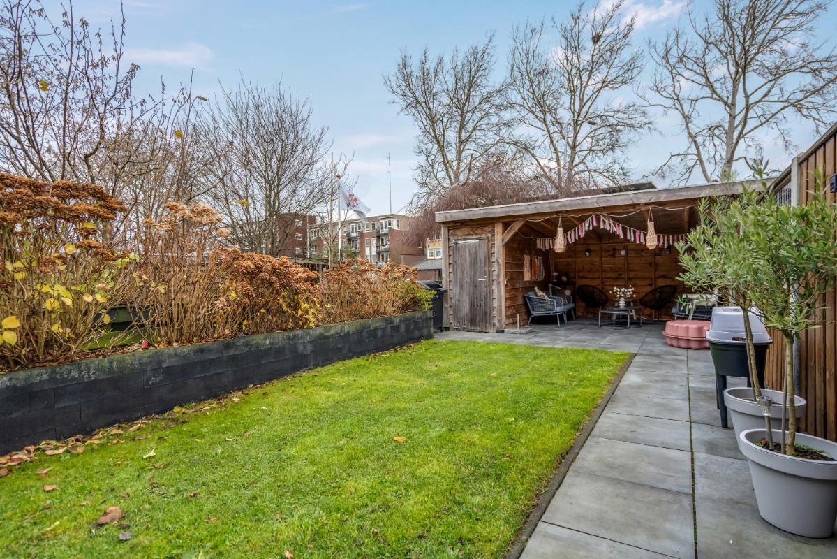 De achtertuin is diep en verzorgd aangelegd met bestrating en beplanting. Door de diepte van de tuin is er gedurende de dag een prettige afwisseling van zon en schaduw. Achterin bevindt zich een houten overkapping met daaraan een houten berging. Hierdoor is er zowel beschutte zitruimte als extra bergruimte aanwezig.