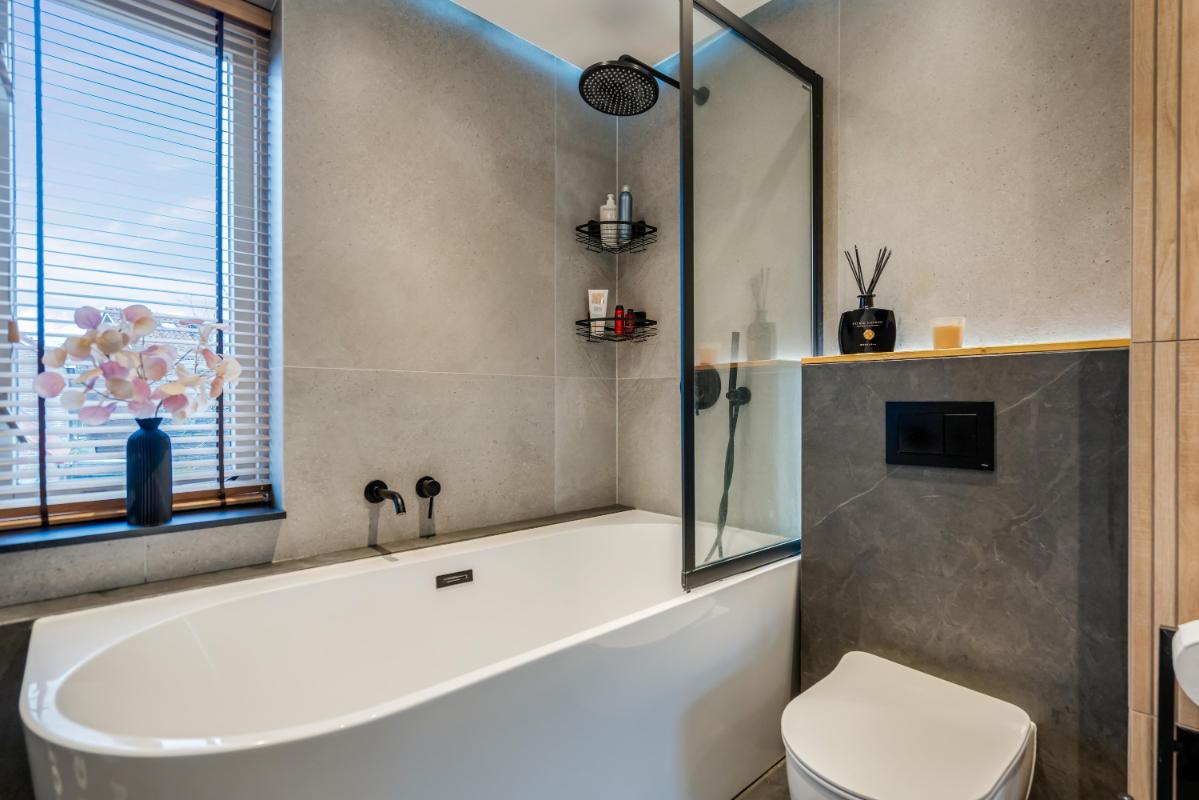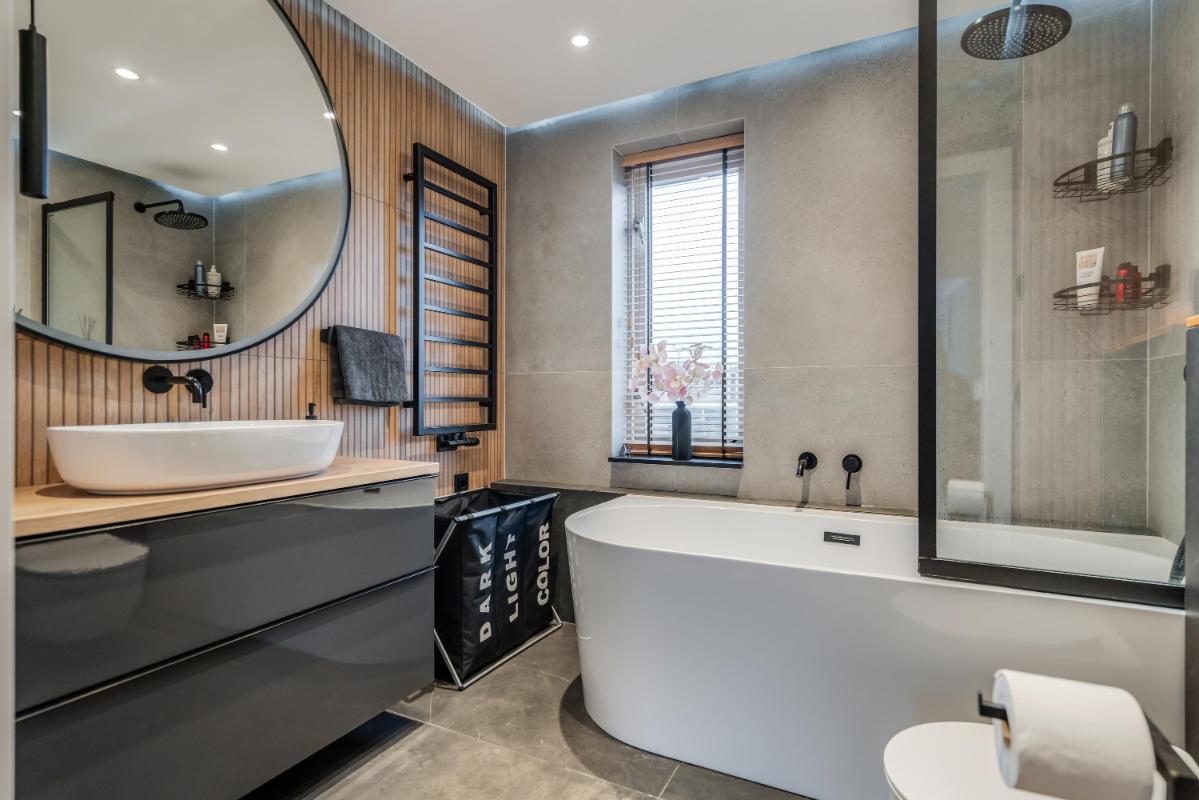 De badkamer is in 2022 vernieuwd en modern uitgevoerd. Hier vind je een ligbad met douchevoorziening, een wastafelmeubel en een tweede toilet. De afwerking is strak en eigentijds. De badkamer beschikt over elektrische vloerverwarming wat zorgt voor extra comfort.