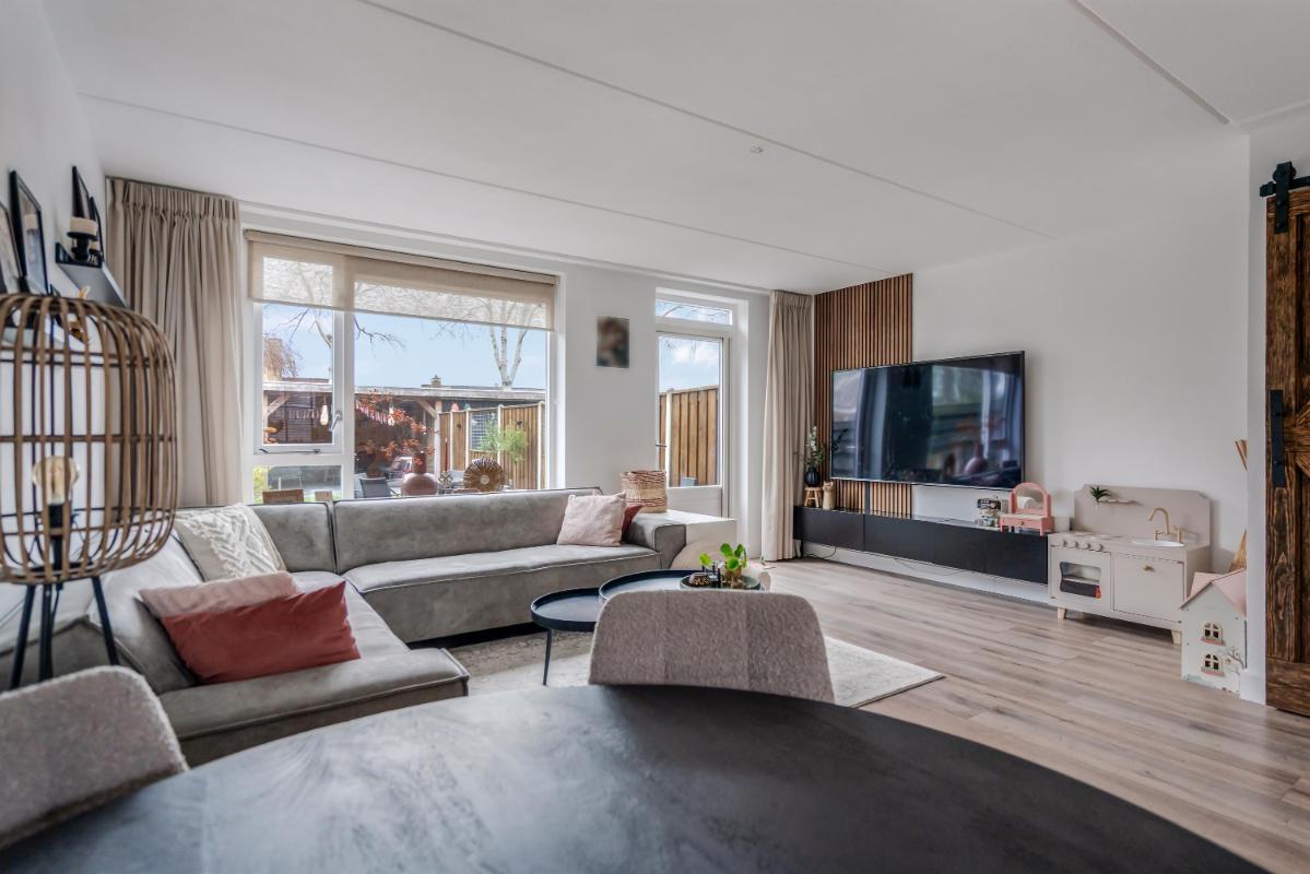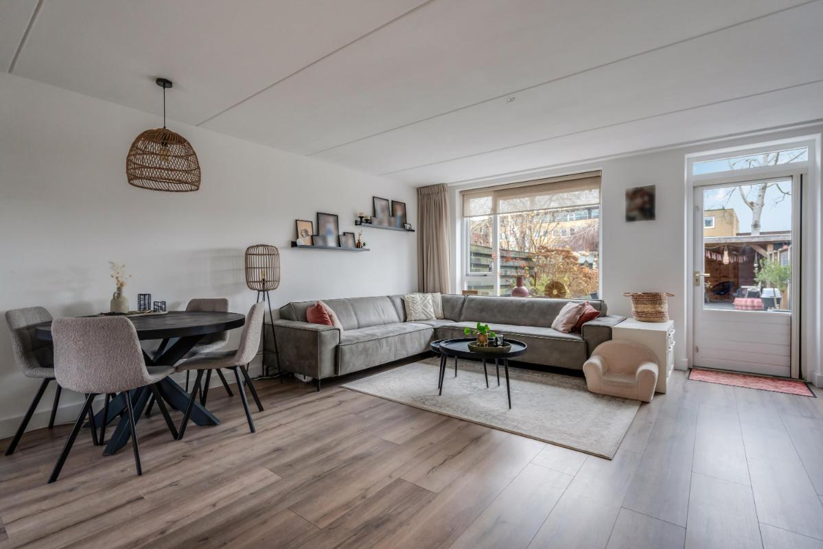 De woonkamer ligt aan de tuinzijde en is heerlijk licht dankzij de brede raampartij en de deur naar buiten. De ruimte is royaal opgezet en biedt gemakkelijk plaats aan een grote zithoek en een gezellige eethoek. De trapkast zorgt voor extra bergruimte.