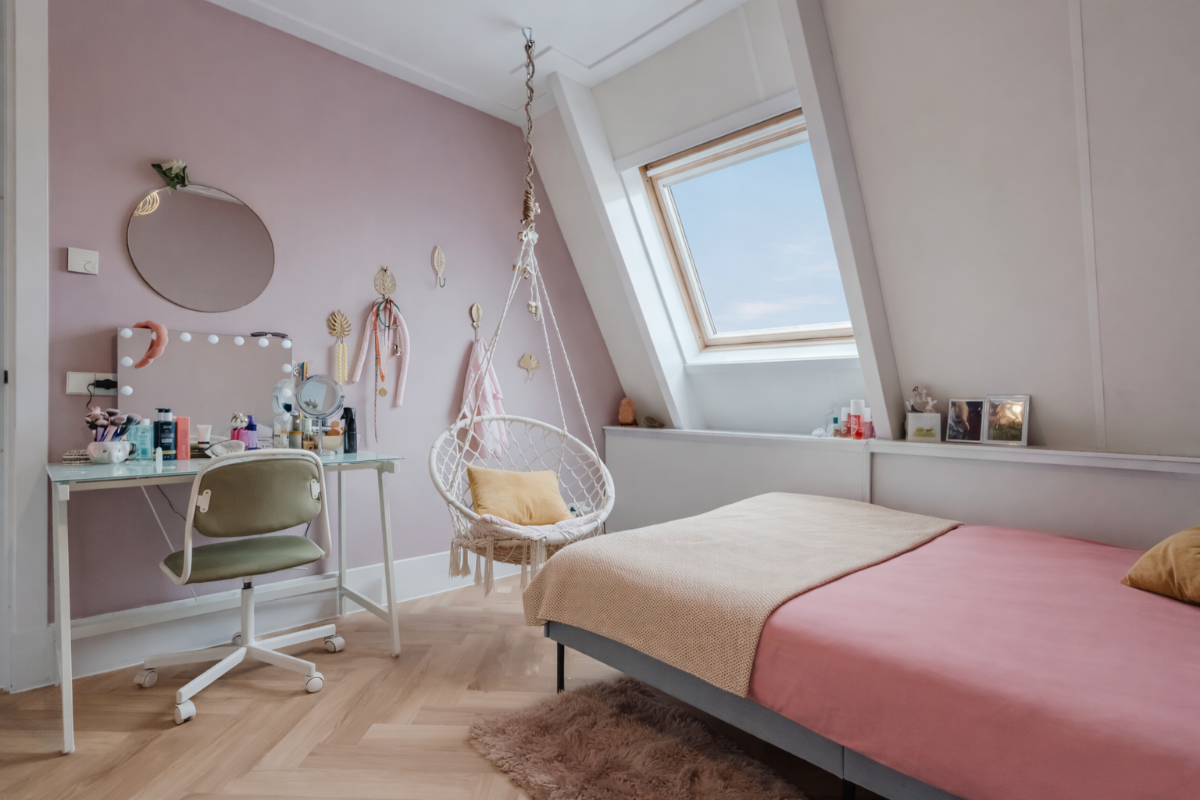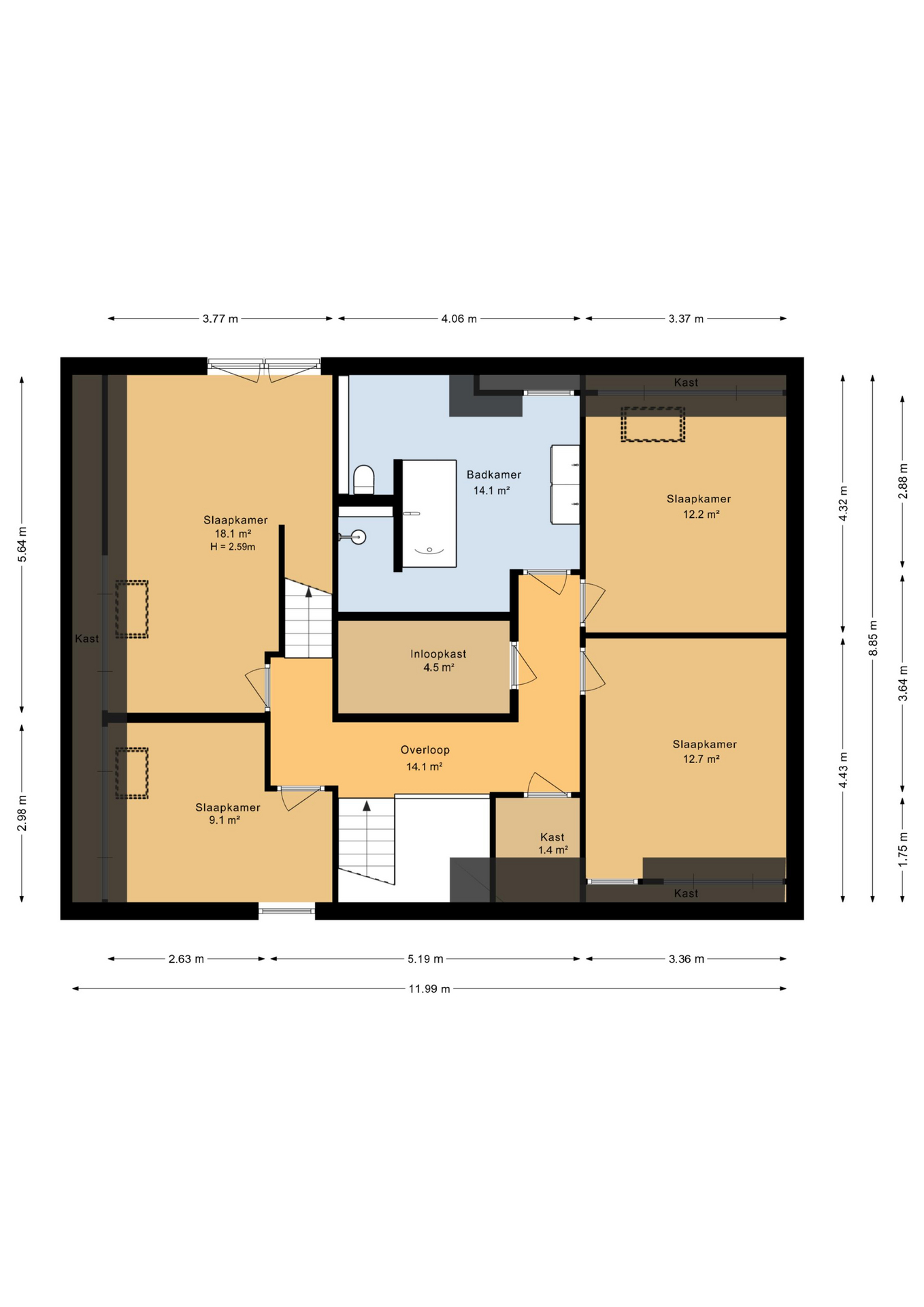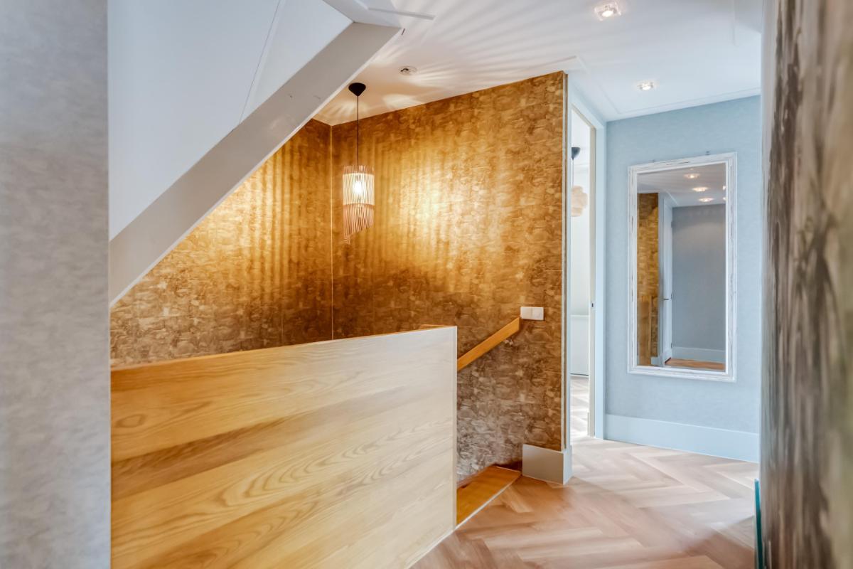 De ruime overloop geeft toegang tot vier slaapkamers en de badkamer. De kamers zijn praktisch ingedeeld en bieden volop mogelijkheden voor gezin, werk of hobby. De grootste slaapkamer beschikt over vaste kastruimte en daarnaast is er een aparte inloopkast aanwezig.