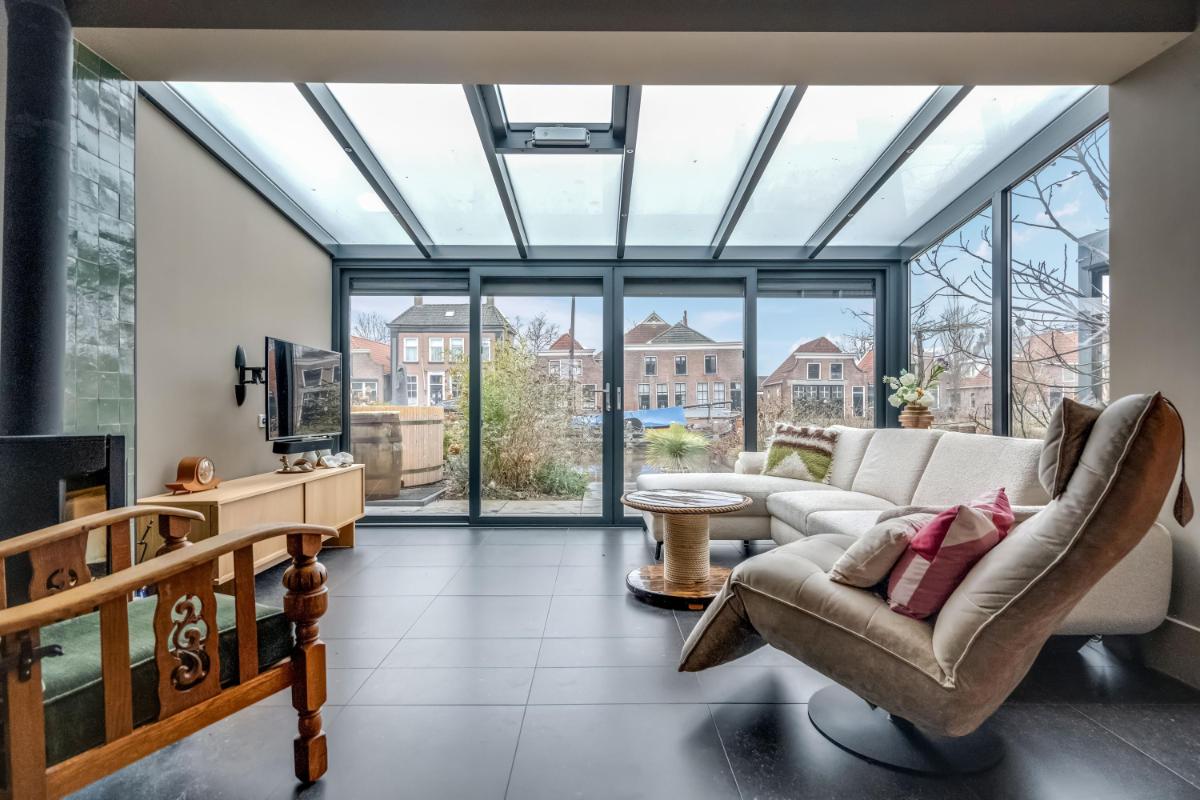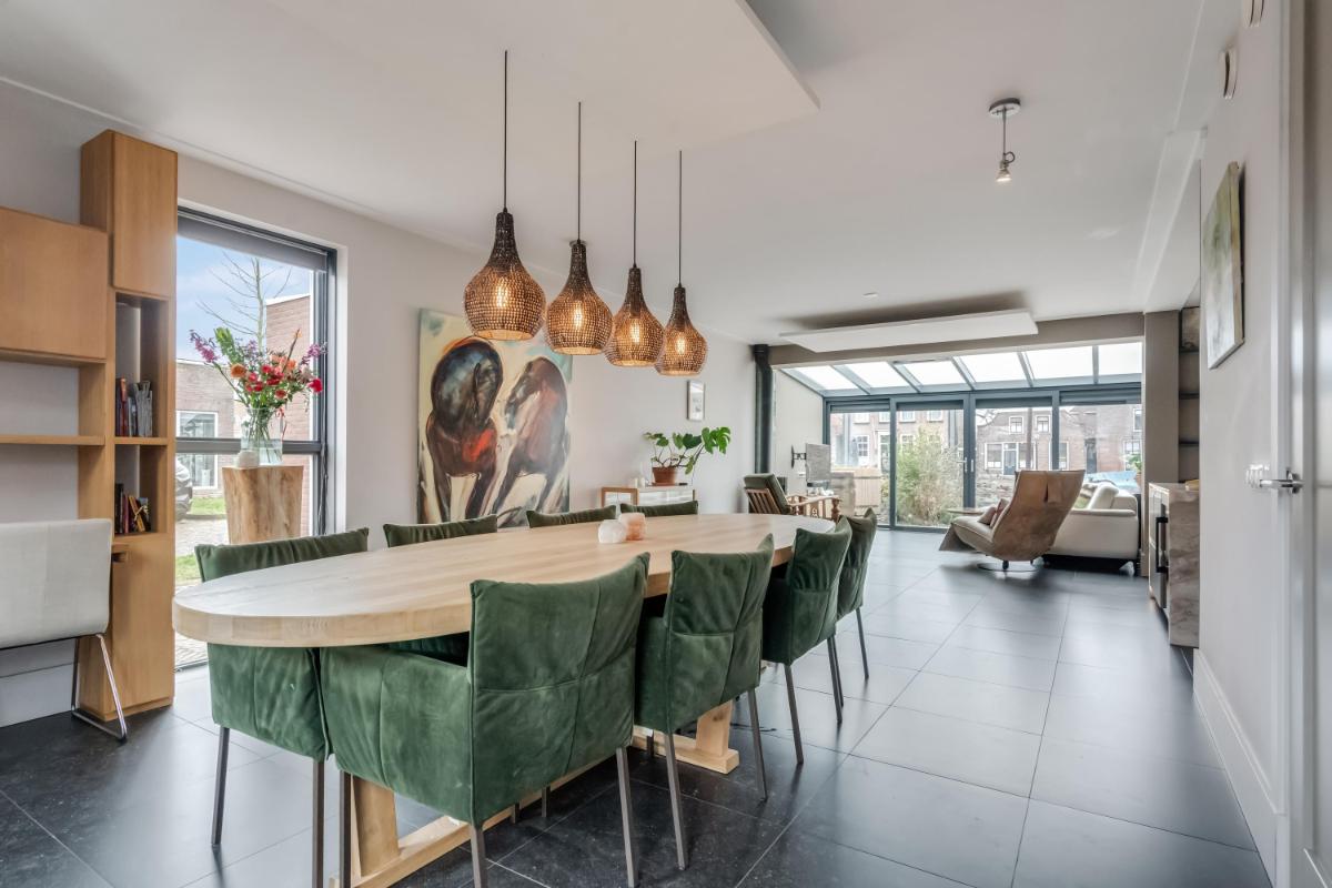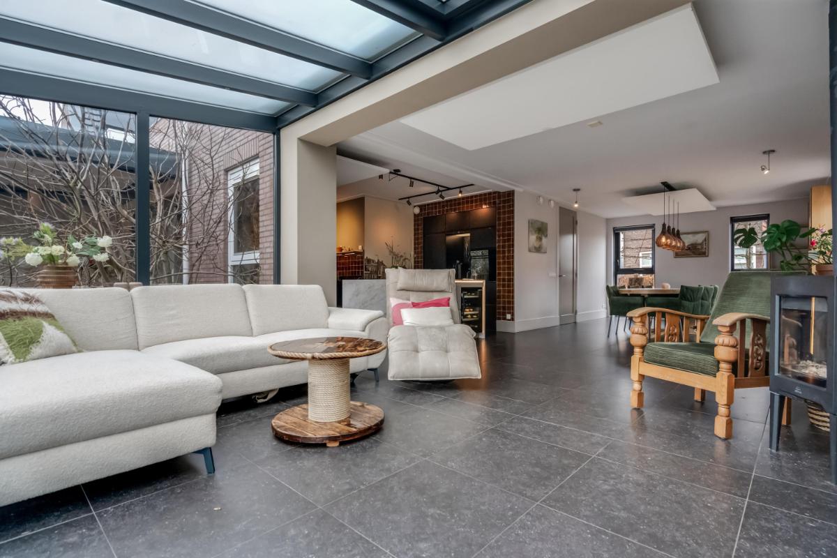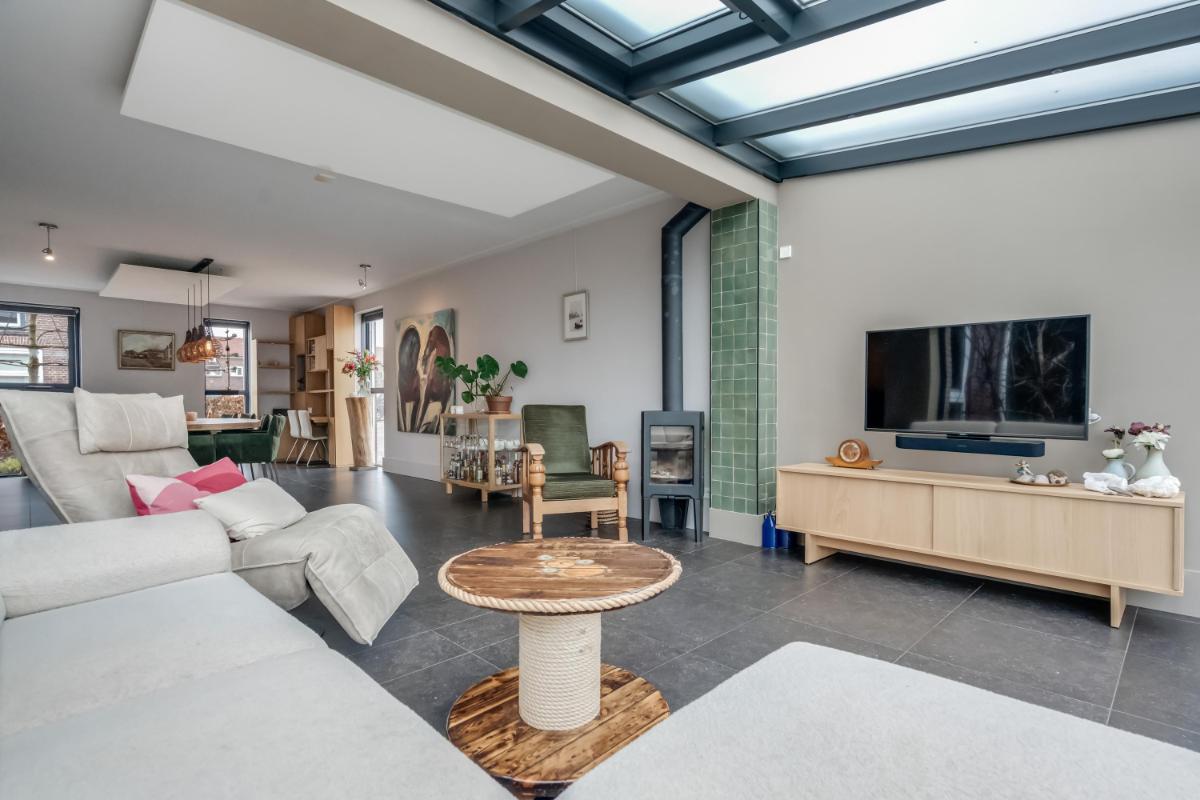 Vanuit de hal loopt u door naar de royale woonkamer die zich uitstrekt over de volle breedte van de woning. De grote raampartijen zorgen voor veel licht en een prettige verbinding met buiten.