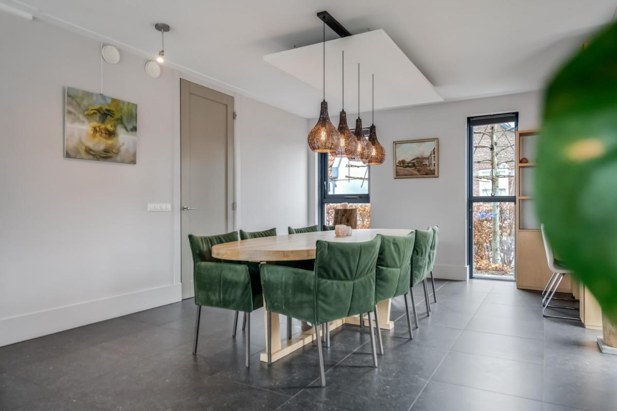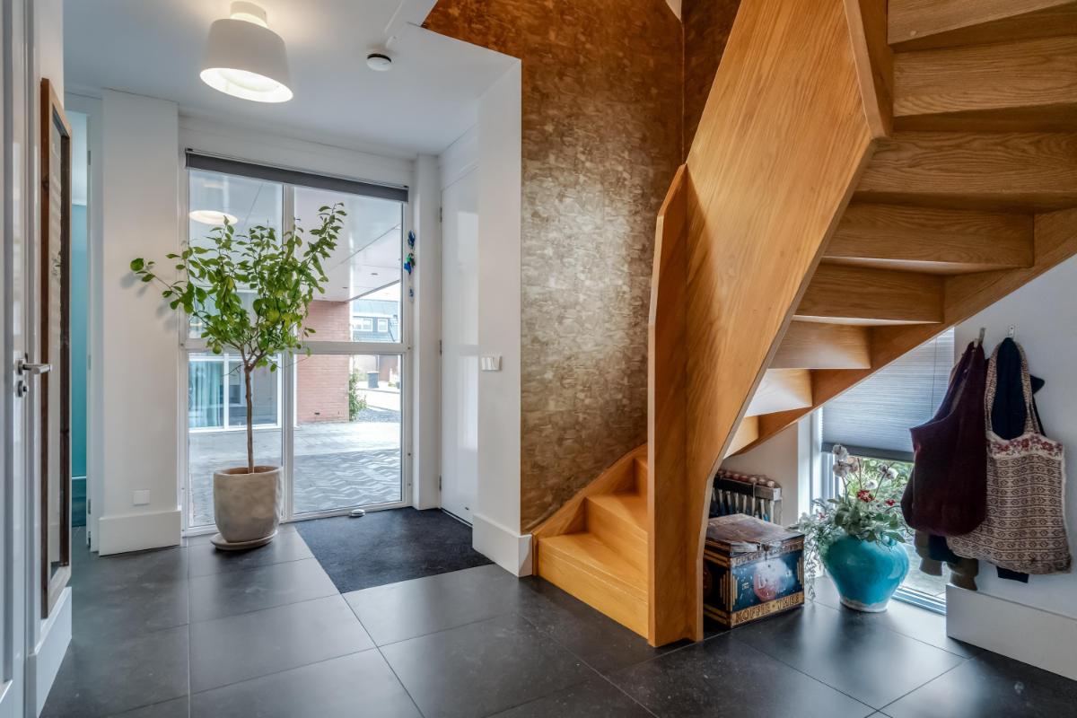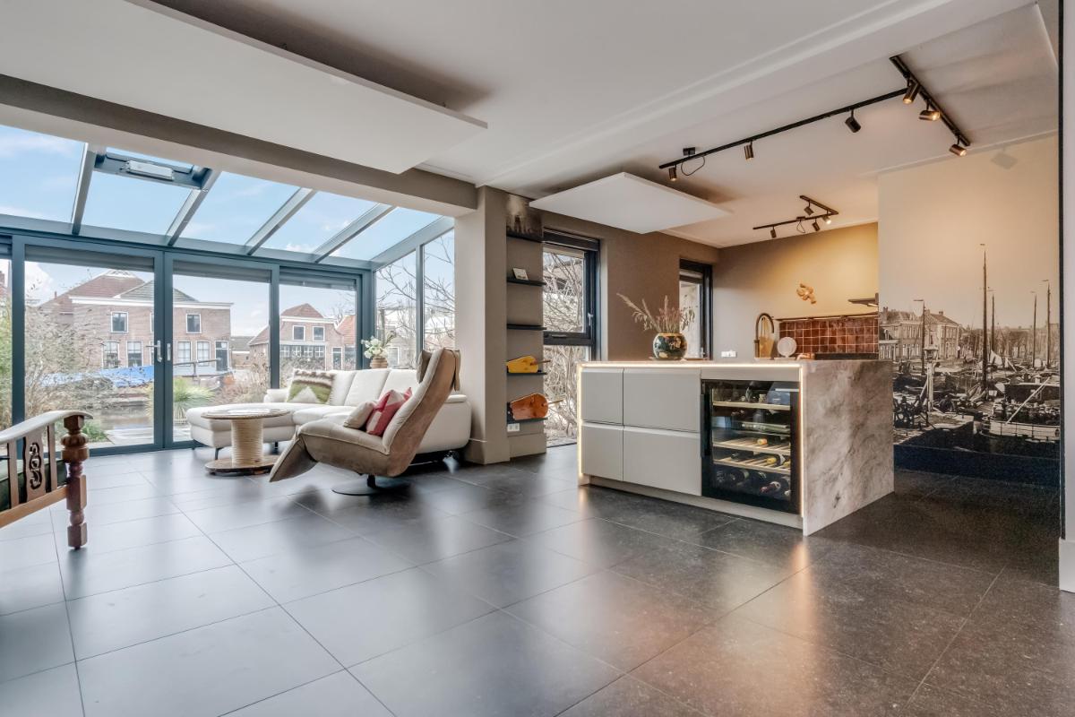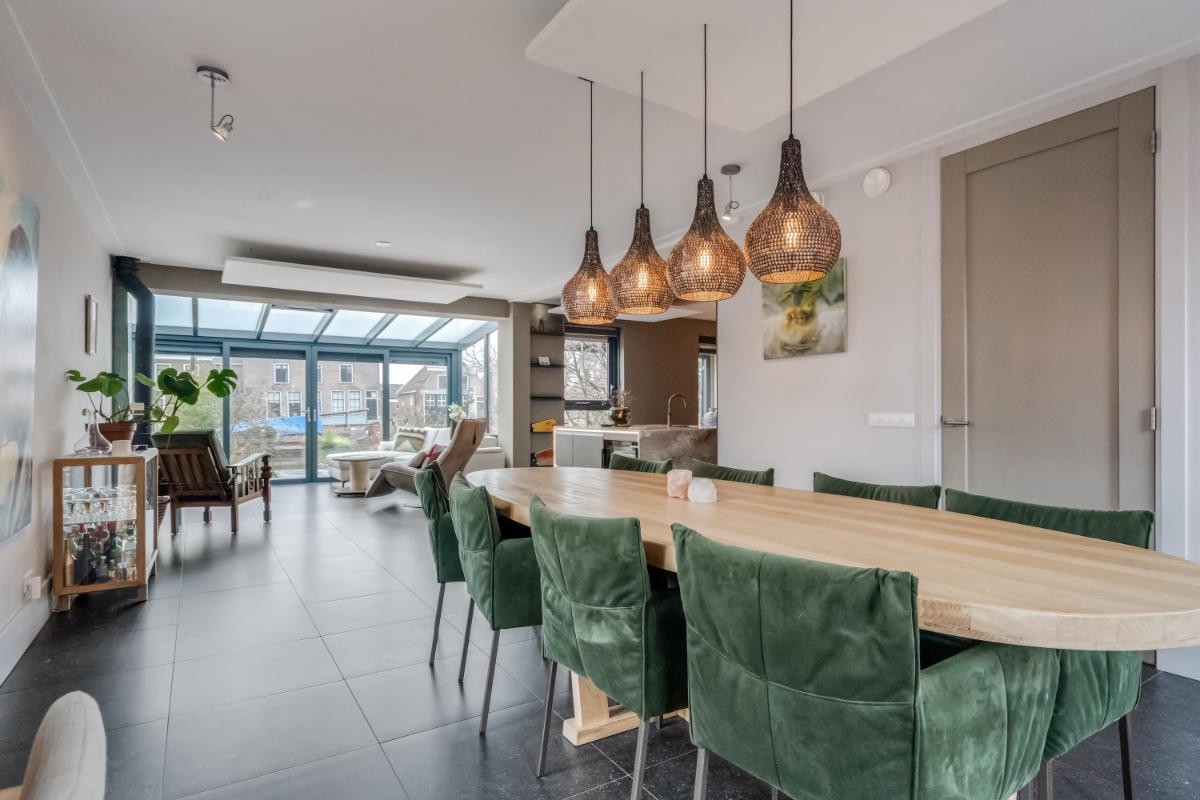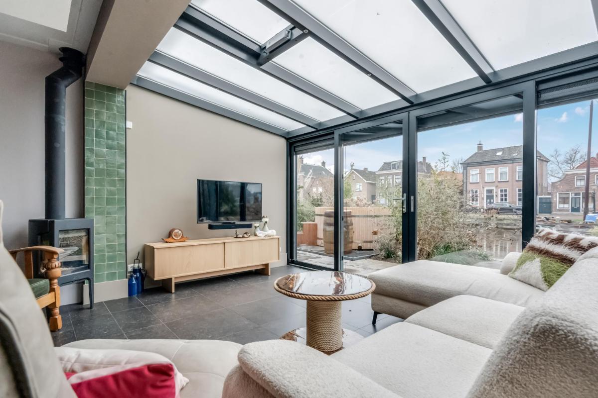 Vanuit de hal loopt u door naar de royale woonkamer die zich uitstrekt over de volle breedte van de woning. De grote raampartijen zorgen voor veel licht en een prettige verbinding met buiten.