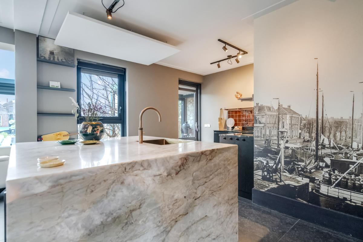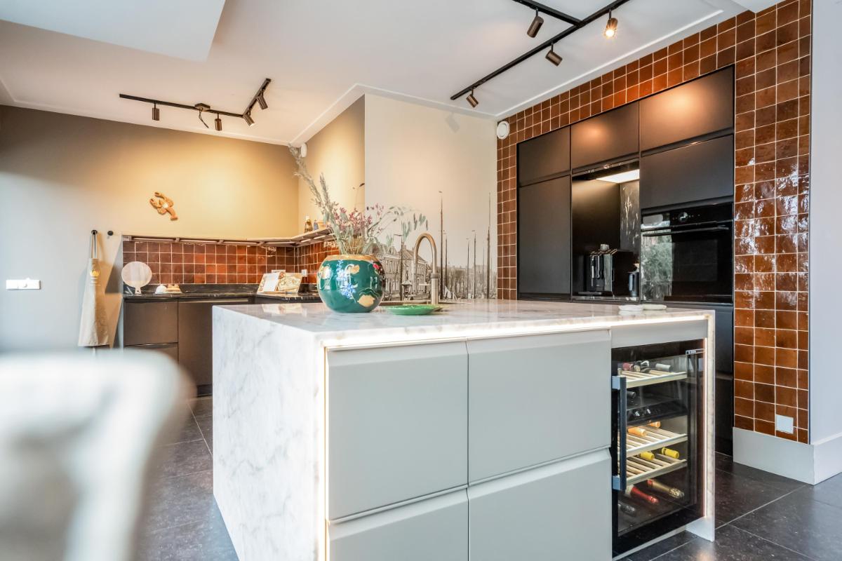 De in 2025 vernieuwde keuken is modern uitgevoerd met een kookeiland en diverse inbouwapparatuur, waaronder een oven, kookplaat, koelkast, vaatwasser en Quooker. Een fijne plek om samen te koken en te genieten.