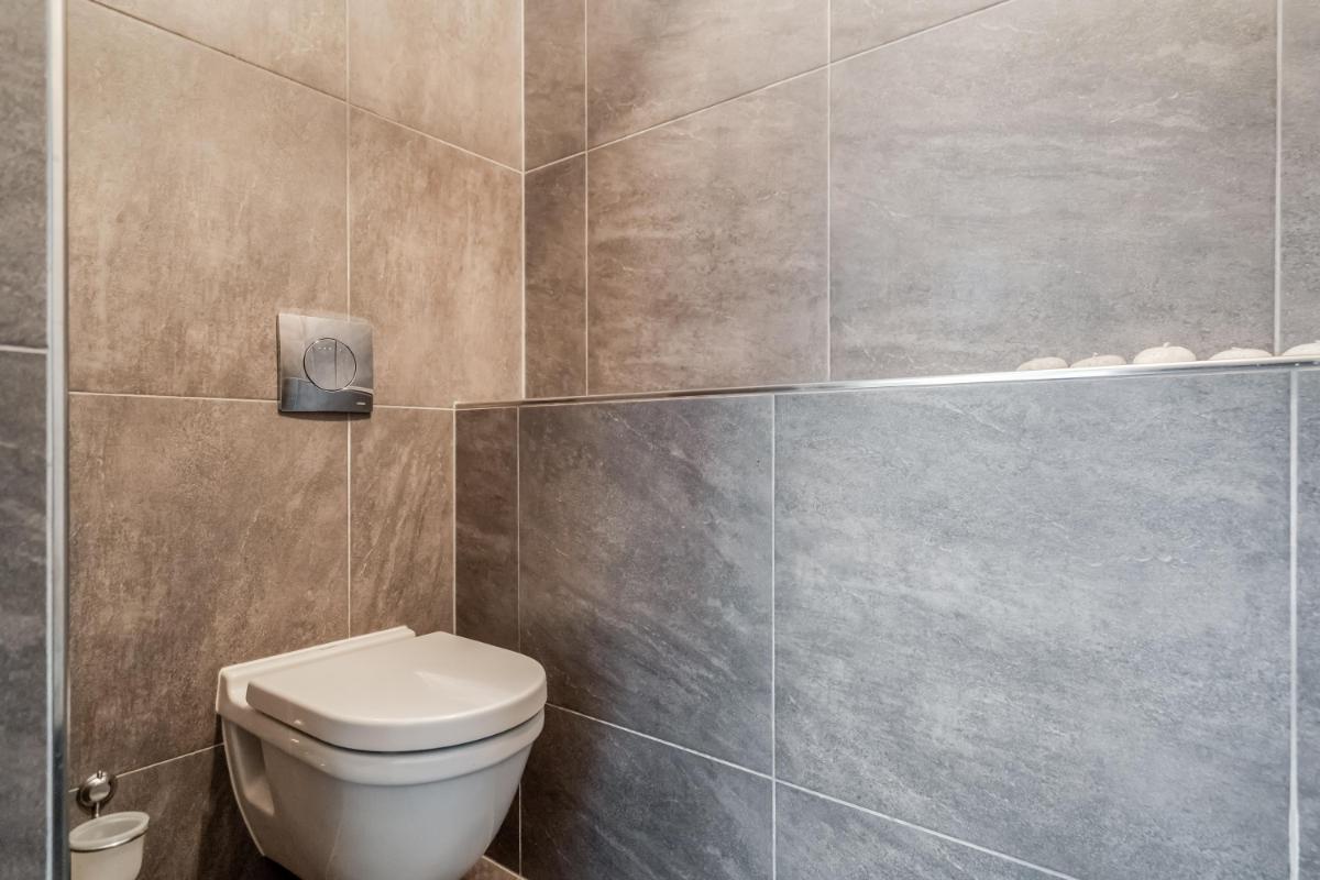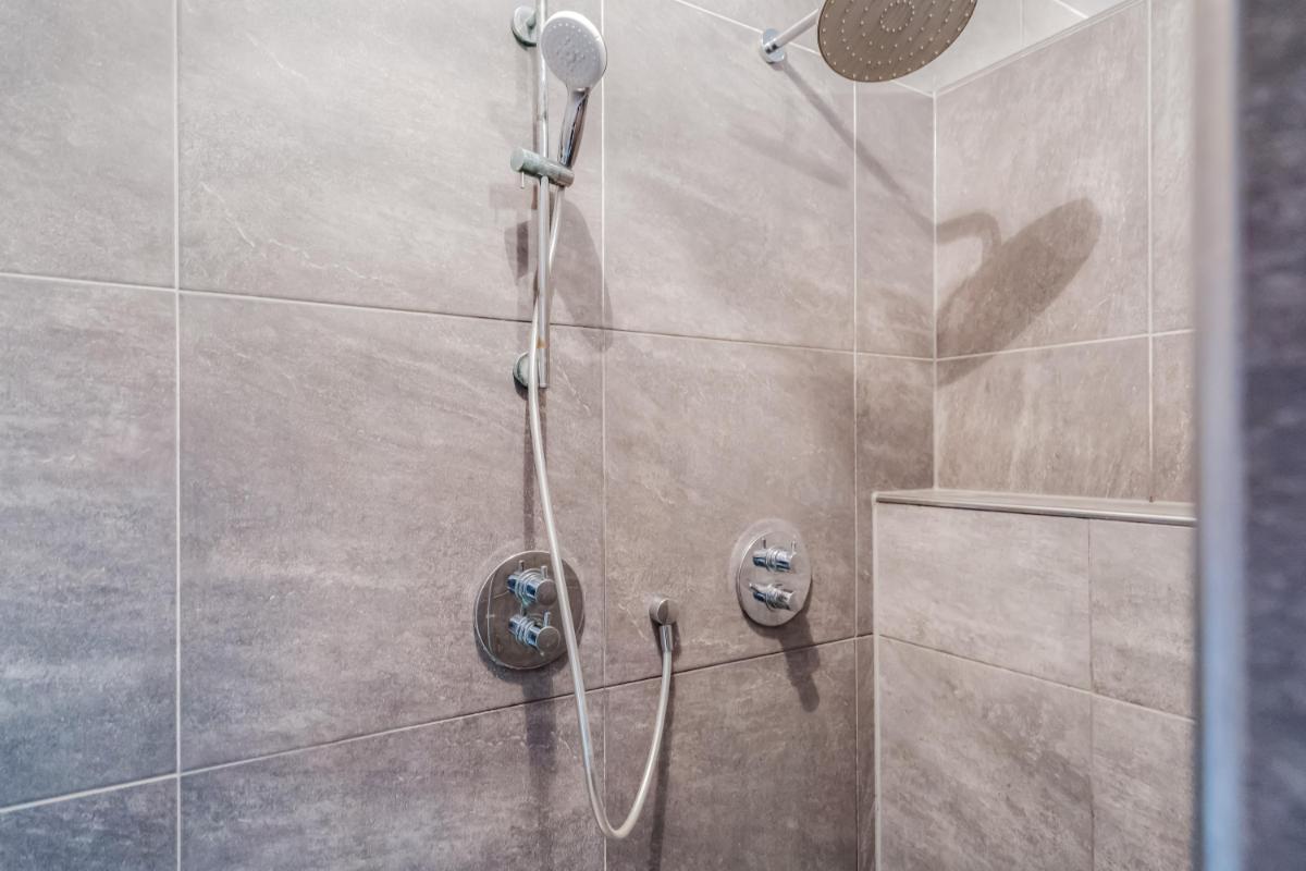 De badkamer is compleet uitgevoerd met ligbad, inloopdouche, dubbele wastafel en toilet.