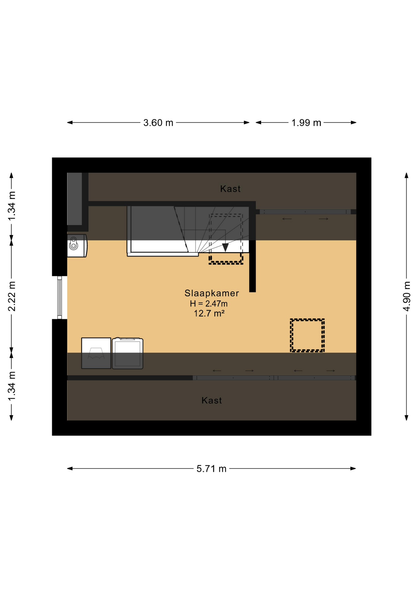 Tweede verdieping Via een vaste trap kom je op de zolderverdieping, waar een ruime vierde slaapkamer is gerealiseerd. Dankzij het dakraam komt er prettig daglicht binnen en de ruimte is netjes afgewerkt. Achter de knieschotten is extra bergruimte gecreëerd. Ideaal voor spullen die je niet dagelijks nodig hebt. Ook vind je hier de aansluitingen voor de wasmachine en droger.