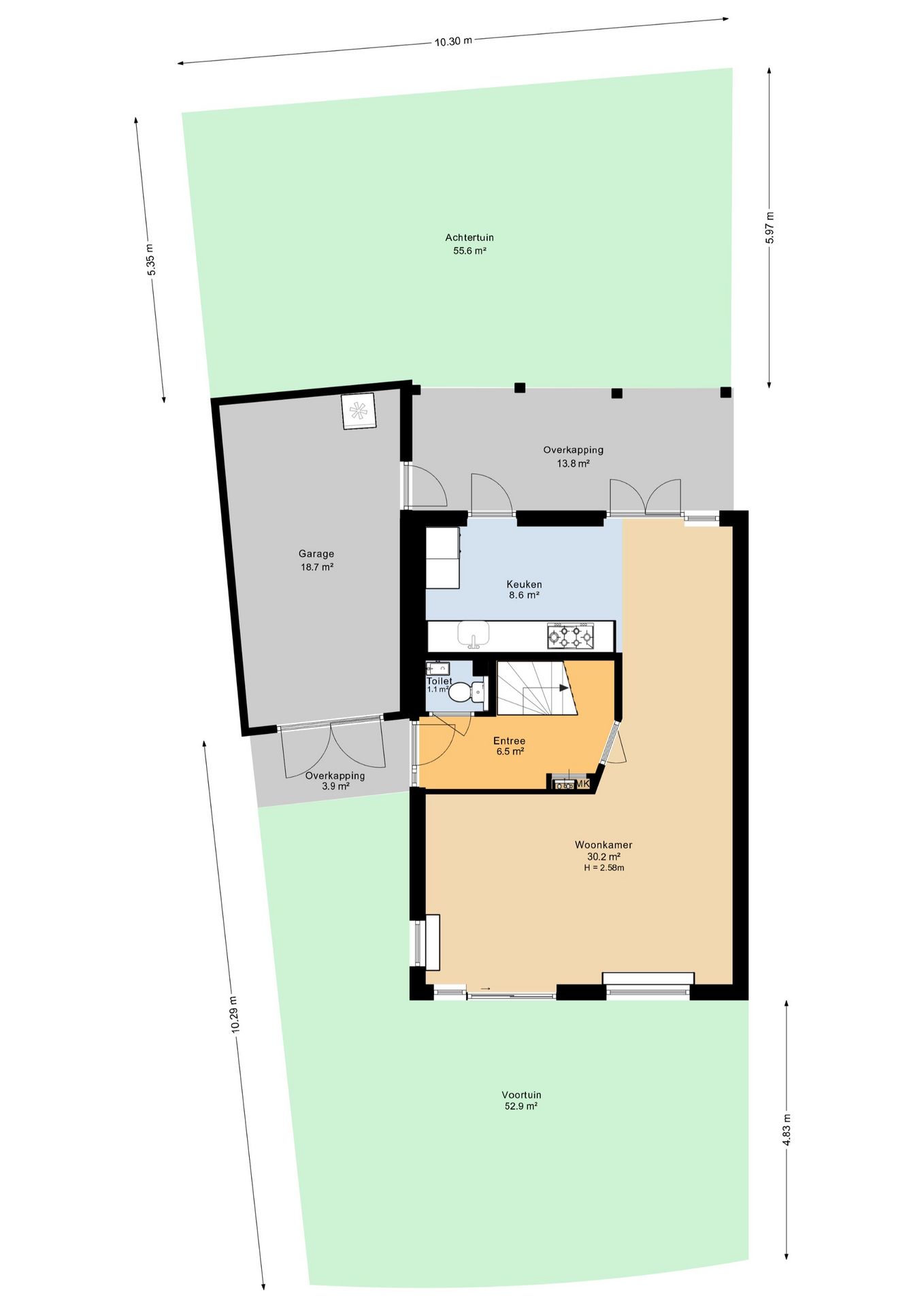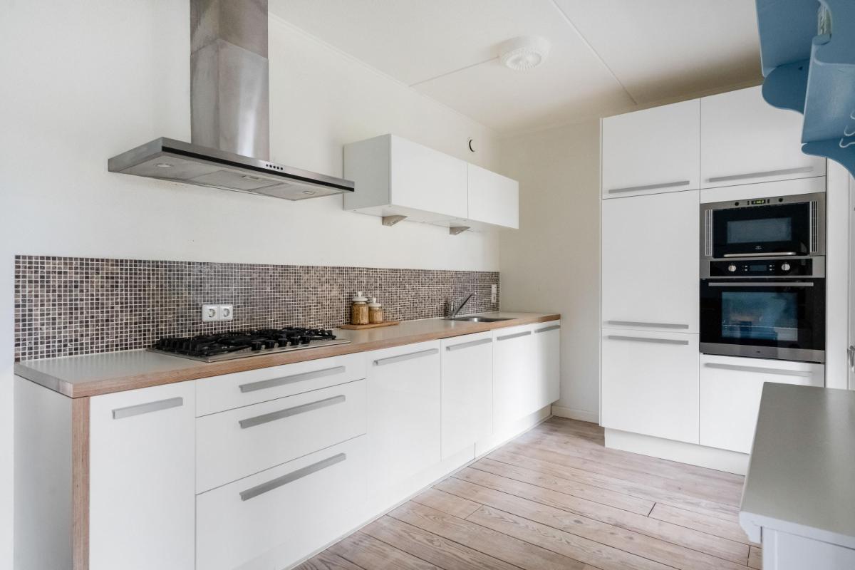 Begane grond Je komt binnen in de hal met trapopgang en een toilet. De ruime woonkamer is licht en overzichtelijk, met veel ruimte voor een zithoek en eettafel. Grote raampartijen zorgen voor een prettige sfeer. Aan de achterzijde ligt de open keuken, voorzien van inbouwapparatuur zoals een oven, magnetron, gaskookplaat, koelkast, vaatwasser en afzuigkap. Vanuit de keuken loop je via openslaande tuindeuren zó de overkapping in, maar er is ook nog een extra loopdeur naar buiten. Handig!