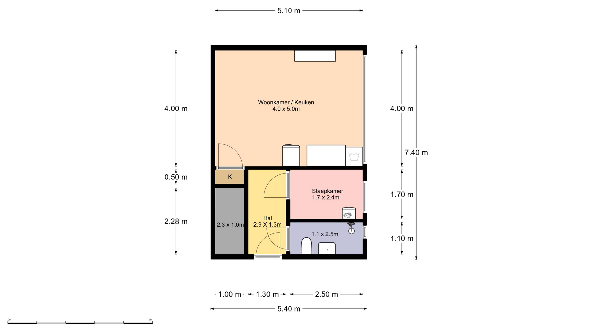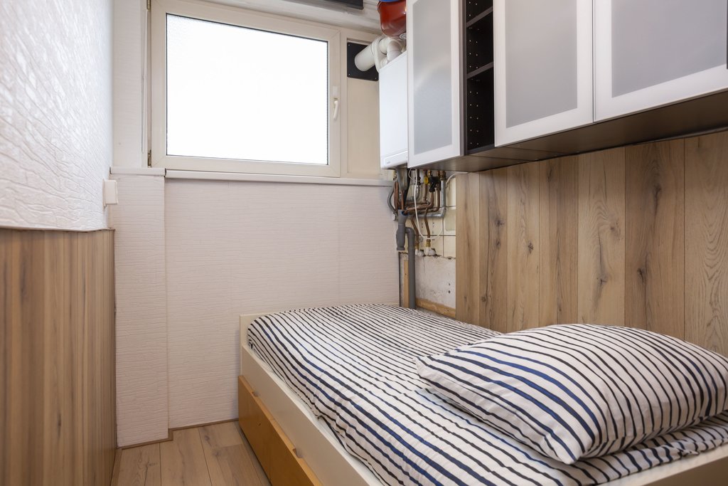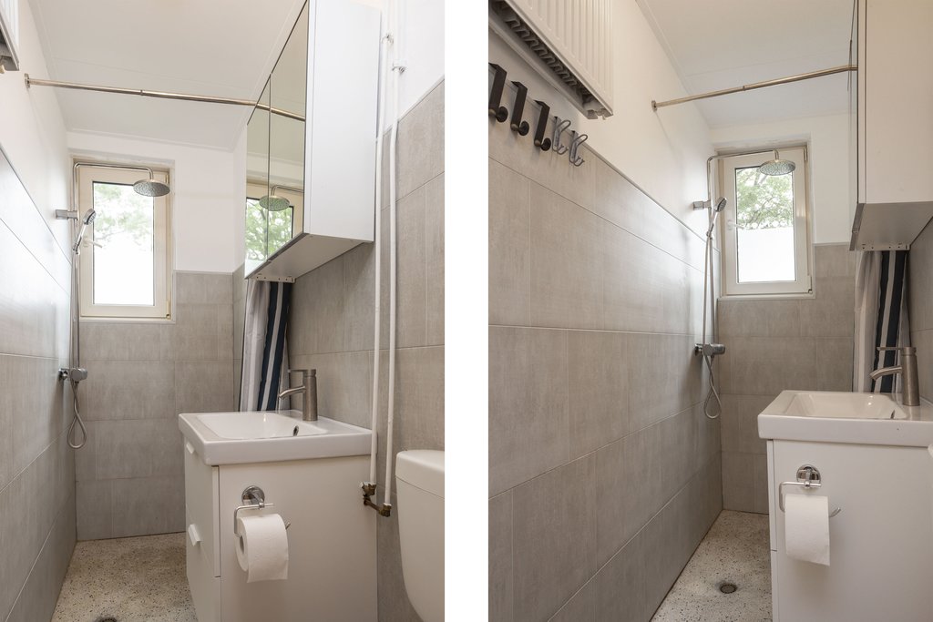 De woning heeft ook een aparte slaapkamer, waar de cv-ketel (Intergas HR, 2016) is geïnstalleerd. De badkamer is praktisch en voorzien van een regendouche, een aparte handdouche, wastafel, spiegelkast, kunststof wanden en een toilet.
