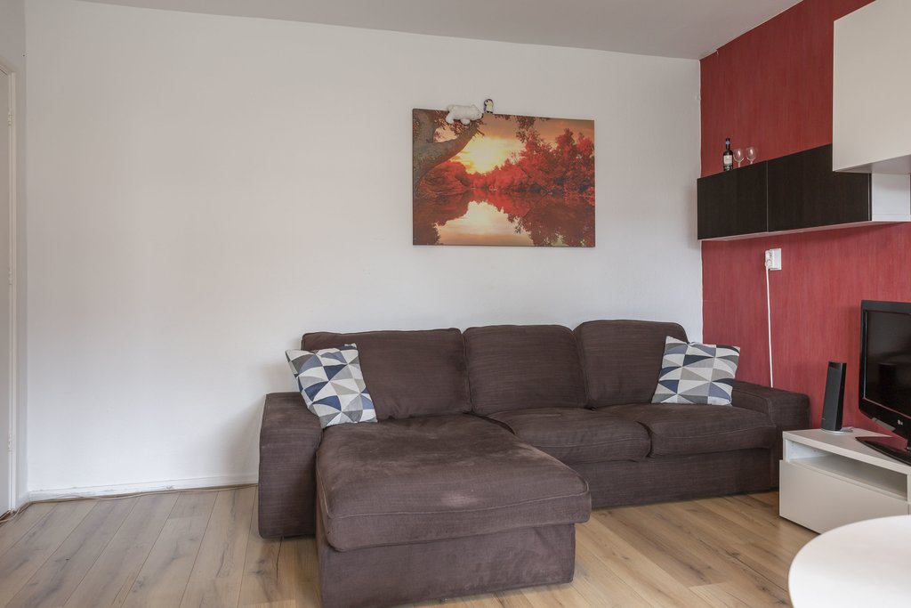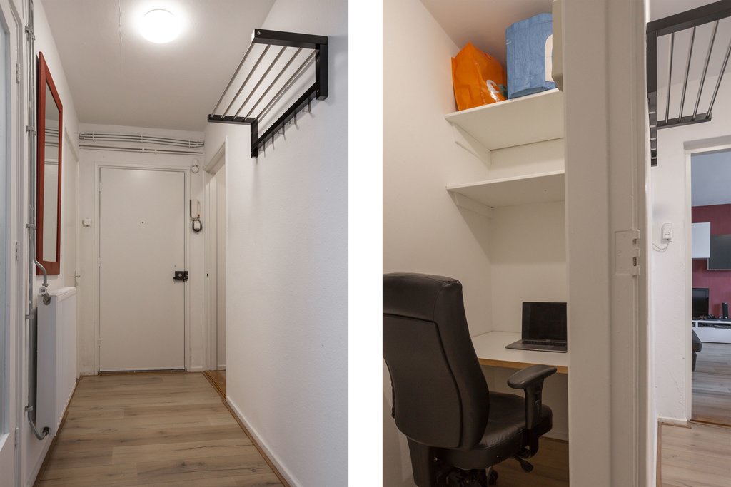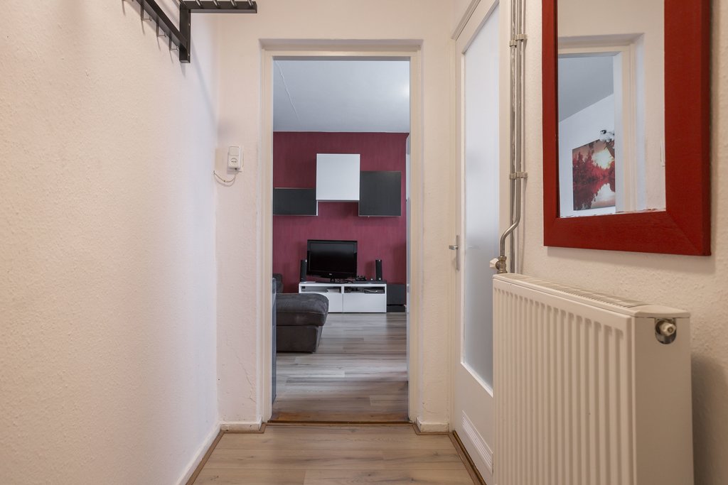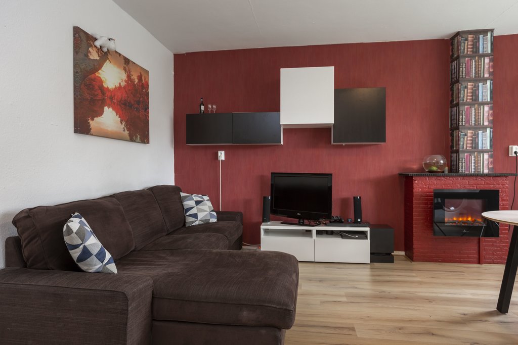 Je betreedt de woning via de gemeenschappelijke trapopgang van het wooncomplex. De voordeur geeft toegang tot een hal. Aan de hal bevindt zich een aparte ruimte die bijvoorbeeld gebruikt kan worden als werkkamer. Vanuit de hal kom je in de woonkamer, die ruim genoeg is voor meerdere meubels en een groot bankstel. De woonkamer heeft een sierhaard die licht en warmte biedt, wat de ruimte direct sfeervol maakt.