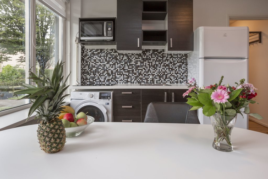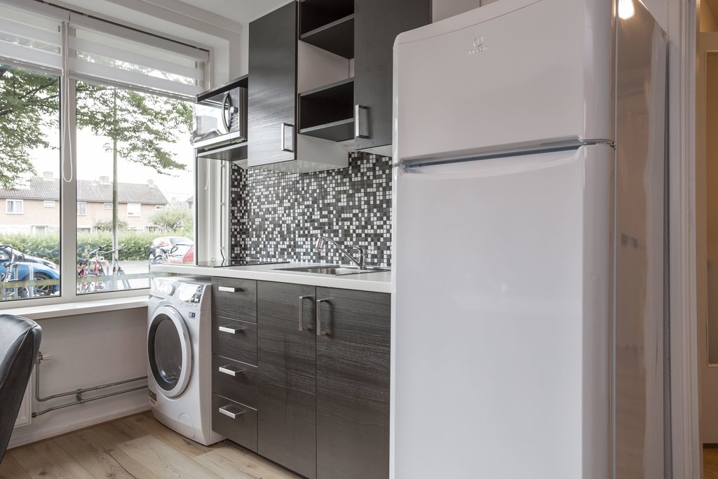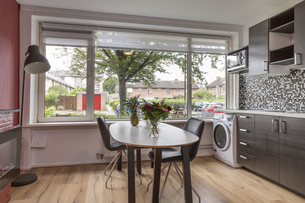 De keuken is vernieuwd en is uitgerust met een fraai betegelde achterwand, een inductiekookplaat, en een aansluiting voor een wasmachine. Er is genoeg ruimte voor een eettafel, waar je vanuit de keuken kunt genieten van uitzicht naar buiten. De gehele ruimte is voorzien van een stijlvolle laminaatvloer.