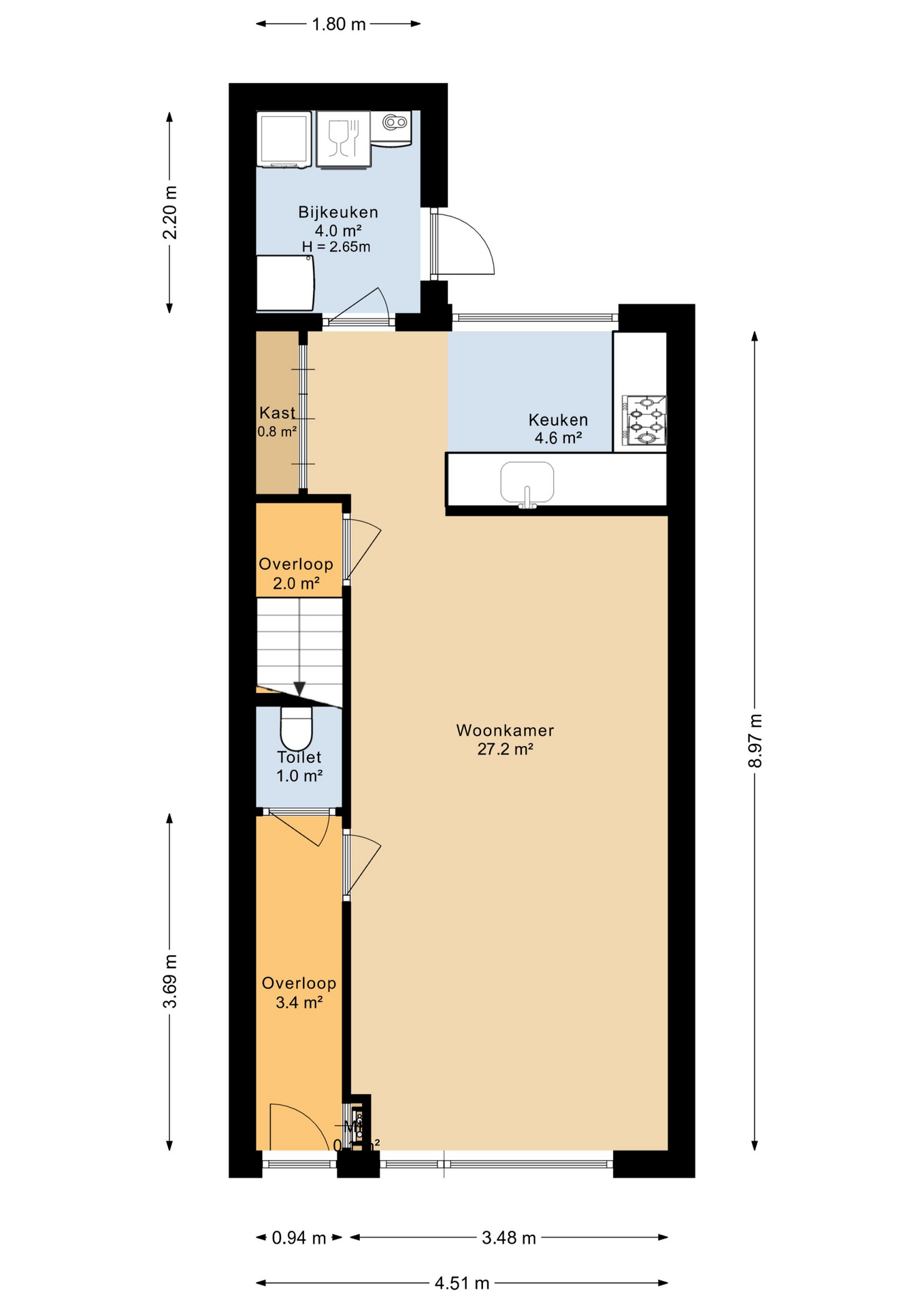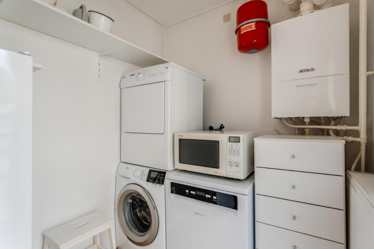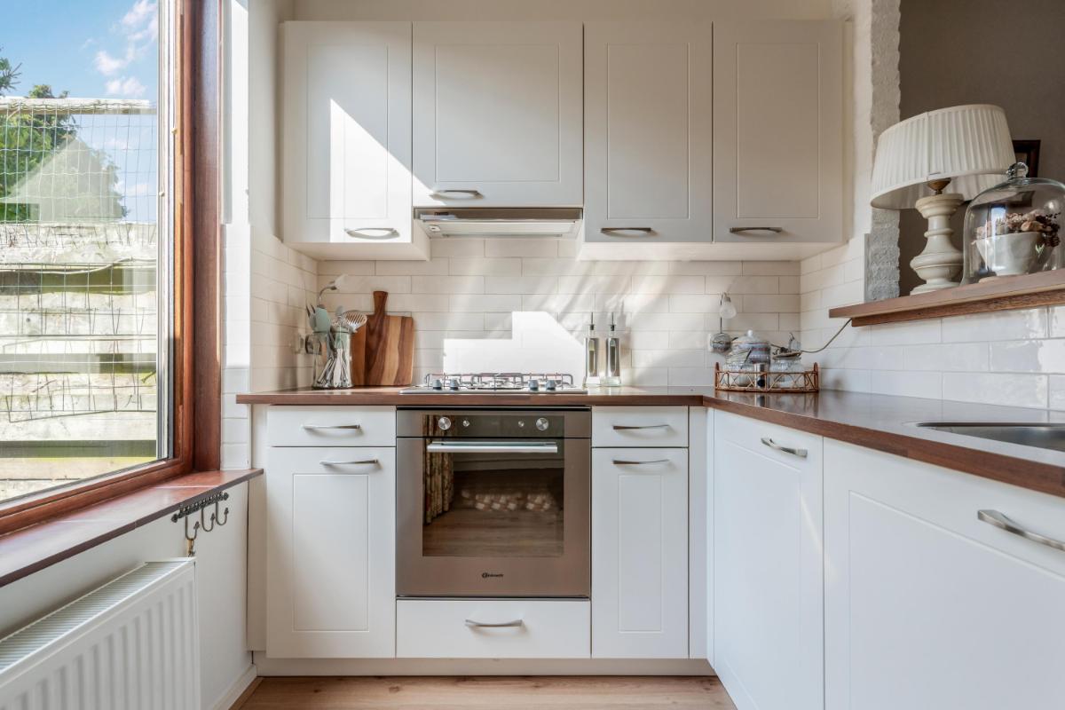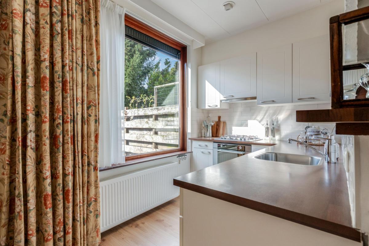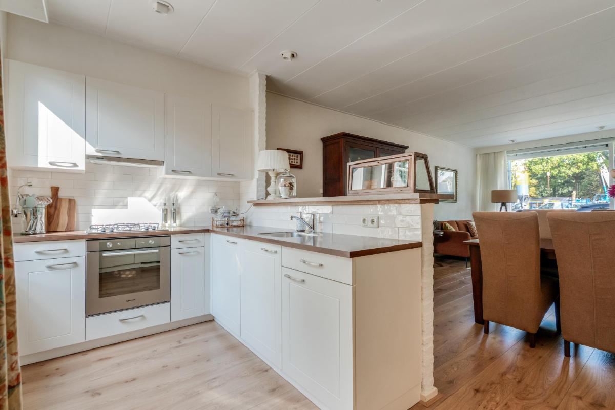 De open keuken bevindt zich aan de achterzijde van de woning en vormt één geheel met de woonkamer. De keuken is uitgevoerd in een praktische L-opstelling met witte fronten en beschikt over diverse inbouwapparatuur, waaronder een oven, fornuis en afzuigkap. Tevens is hier de wasmachine-aansluiting aanwezig. Vanuit de keuken stap je zo de achtertuin in, handig bij zomerse etentjes buiten of een snelle koffiepauze in de zon. Vanuit de woonkamer betreed je de trapopgang naar boven.