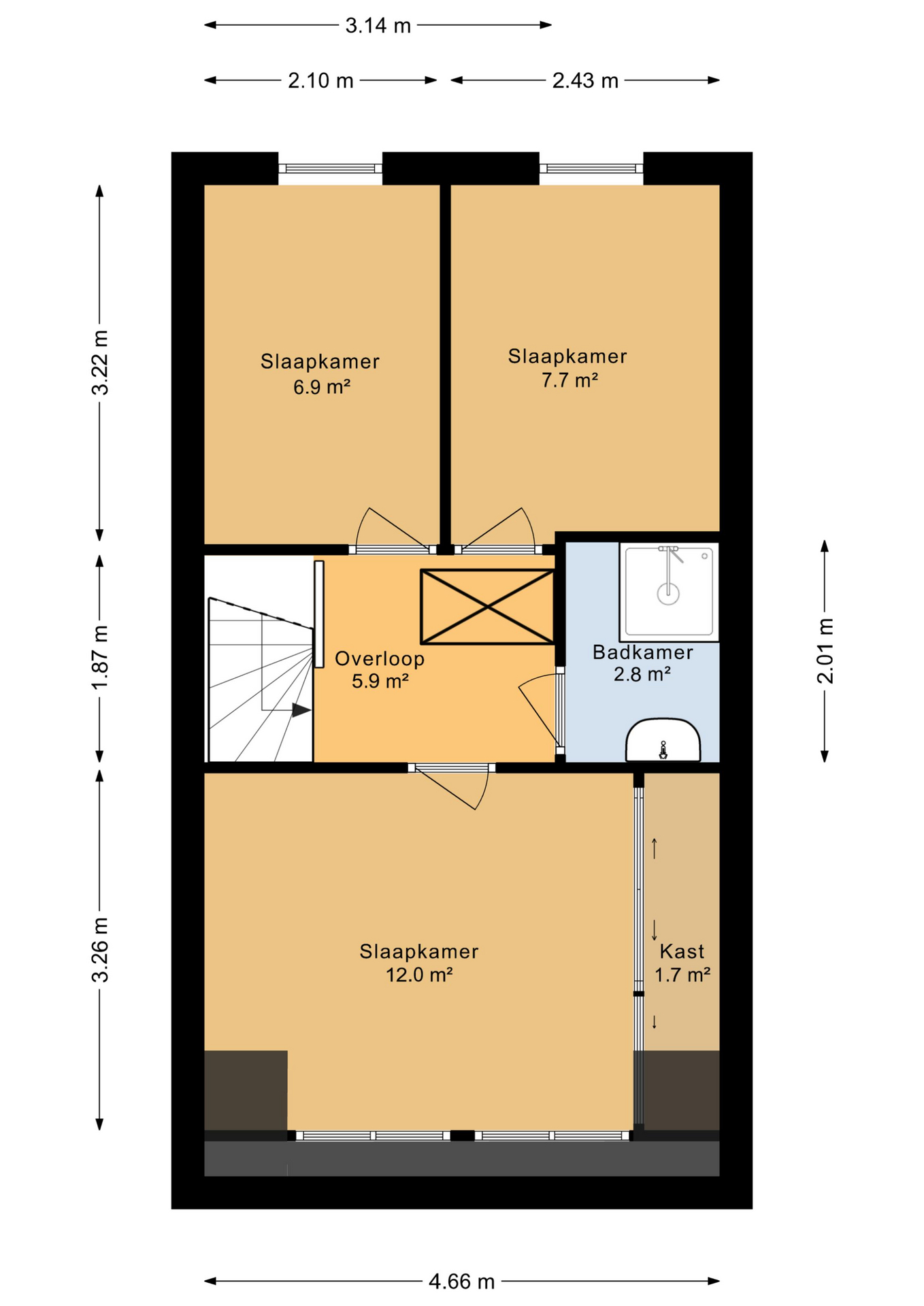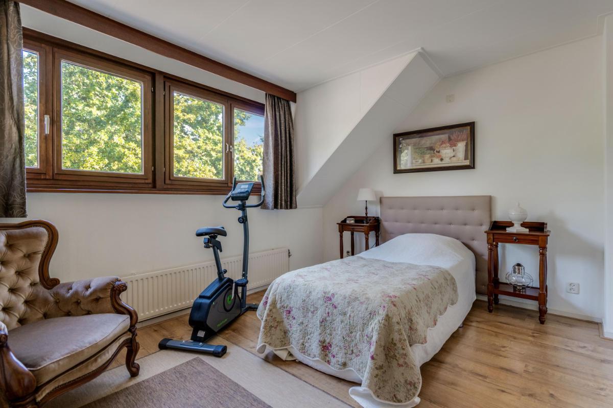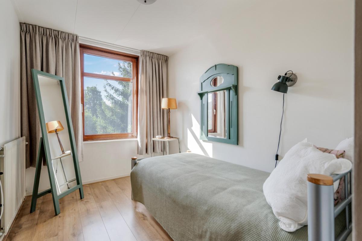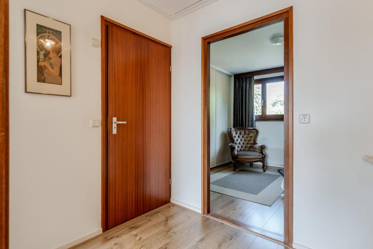 Eerste verdieping Op de eerste verdieping bevinden zich drie slaapkamers, elk met een eigen karakter en prettige lichtinval. De hoofdslaapkamer (ca. 12 m²) ligt aan de voorzijde en biedt voldoende ruimte voor een tweepersoonsbed en een kledingkast. De tweede (7,7 m²) en derde slaapkamer (6,9 m²) liggen aan de achterzijde en zijn ideaal als kinderkamer, logeerplek of thuiskantoor.