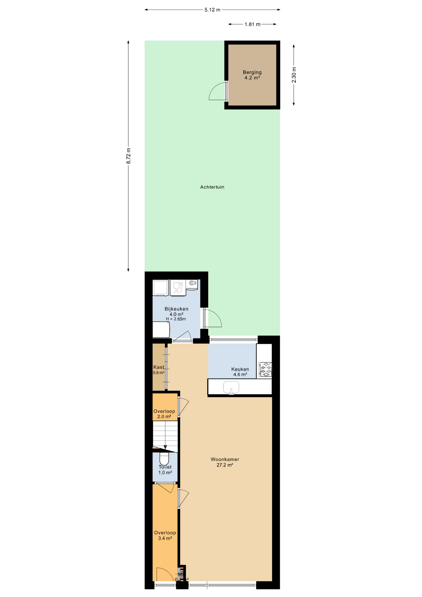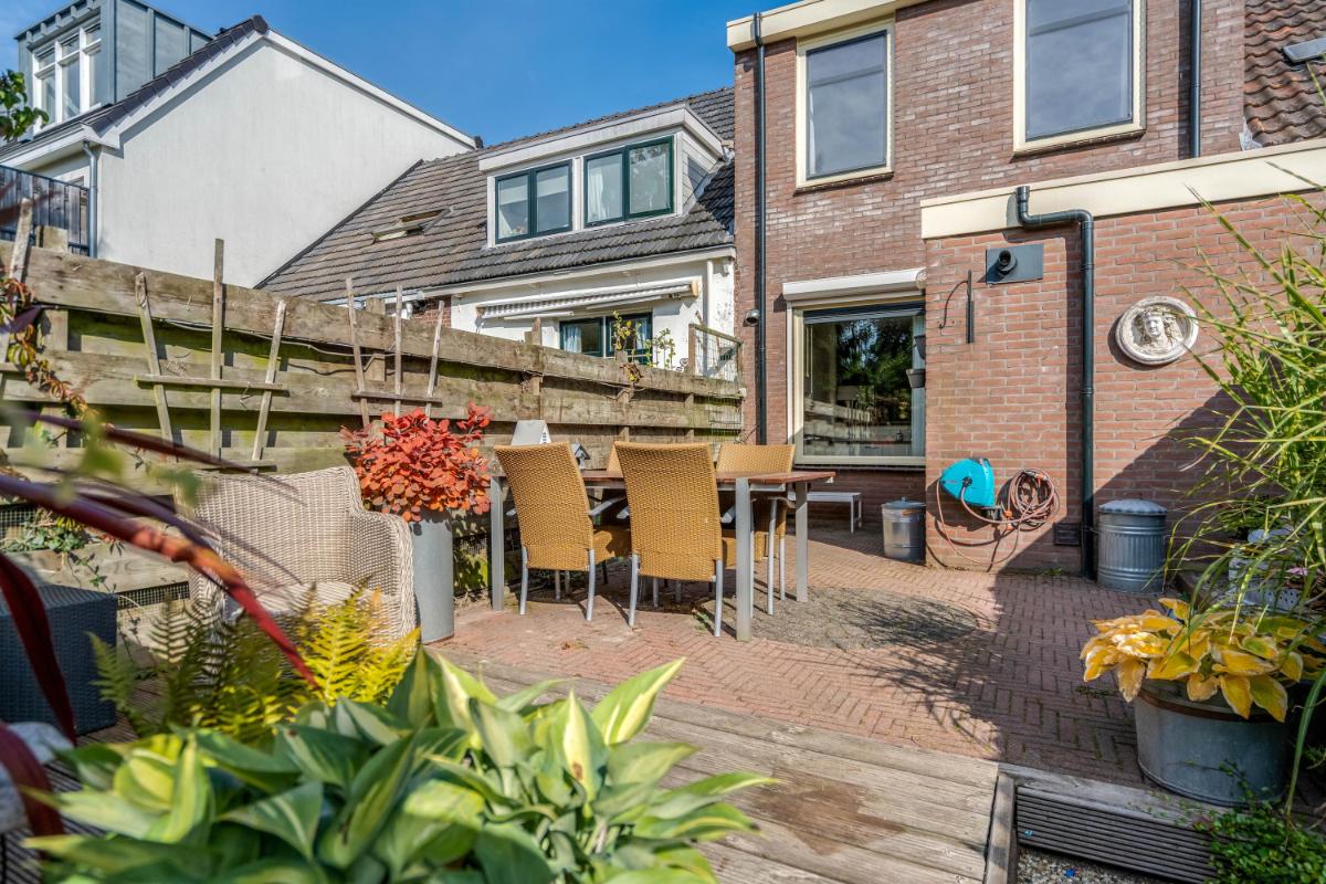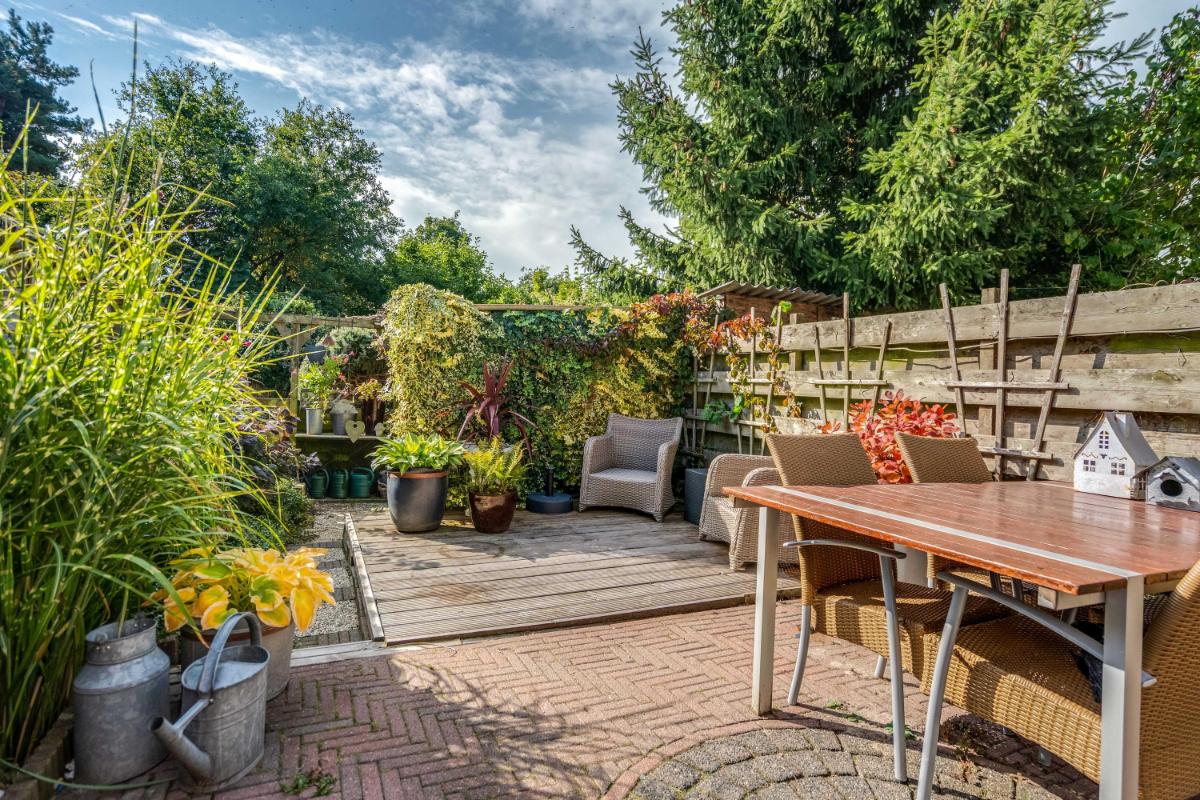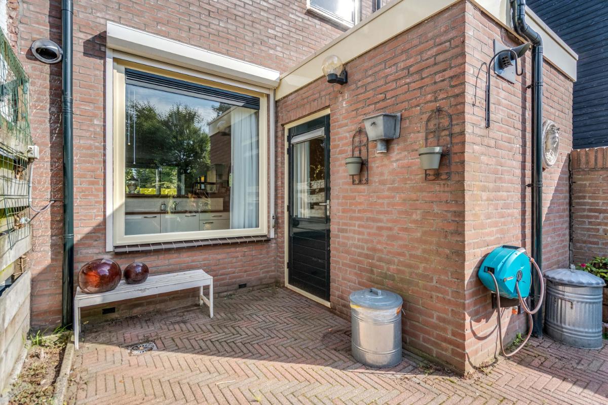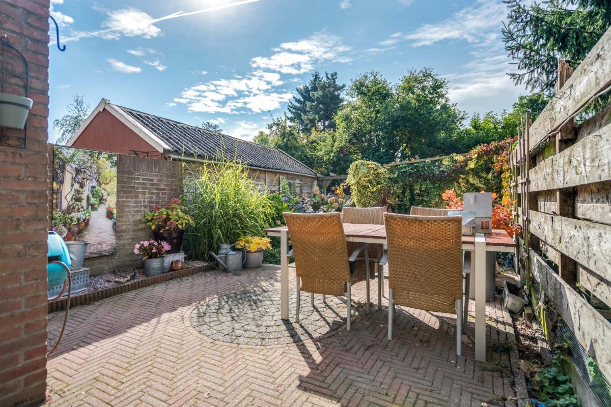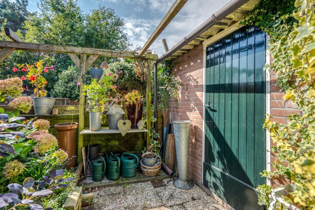 Tuin De achtertuin is verzorgd aangelegd en biedt verrassend veel privacy. Met een mix van sierbestrating, groen en een zonnig terras is het een fijne plek om te ontspannen of met vrienden te barbecueën. Achterin de tuin staat een vrijstaande stenen berging (ca. 4,2 m²) met plat dak – perfect voor fietsen, gereedschap of tuinmeubilair. De tuin is omsloten door een nette schutting.