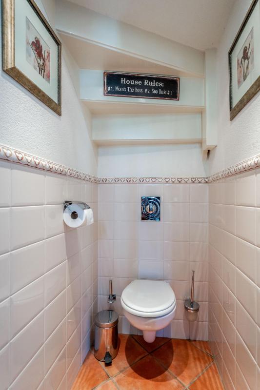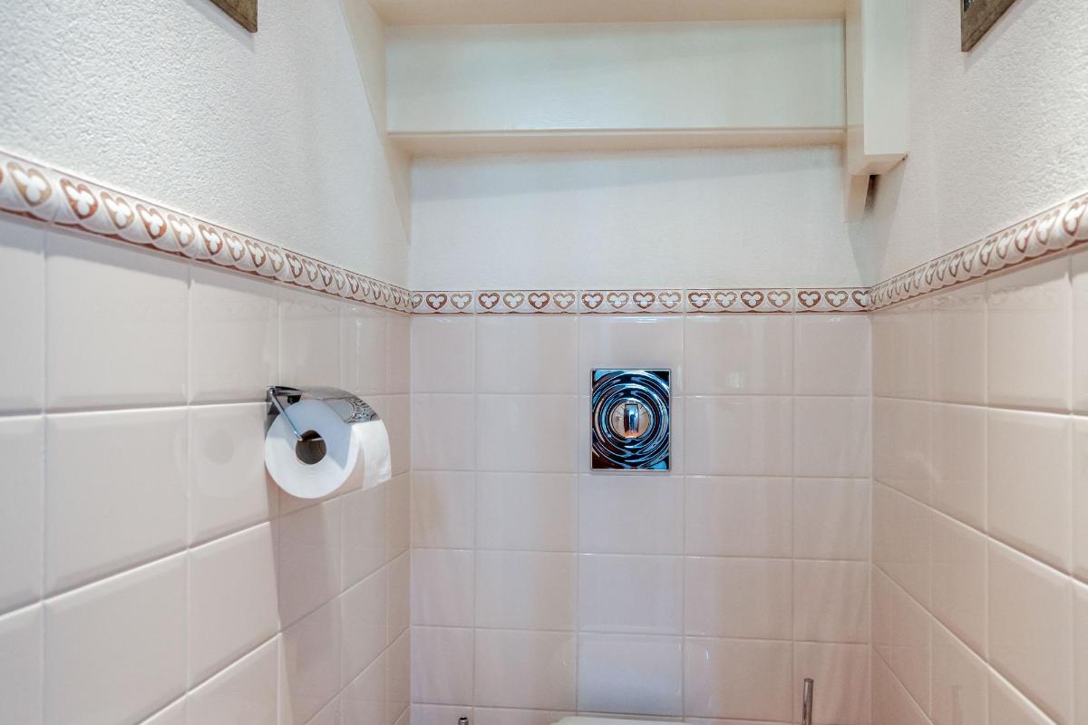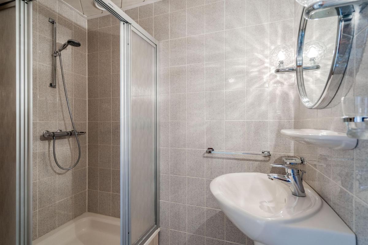 De badkamer is compact maar functioneel ingedeeld en voorzien van een douchecabine, wastafel met planchet en spiegel. De ruimte is netjes afgewerkt en goed onderhouden.