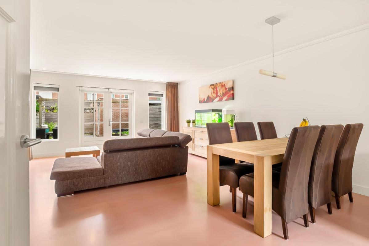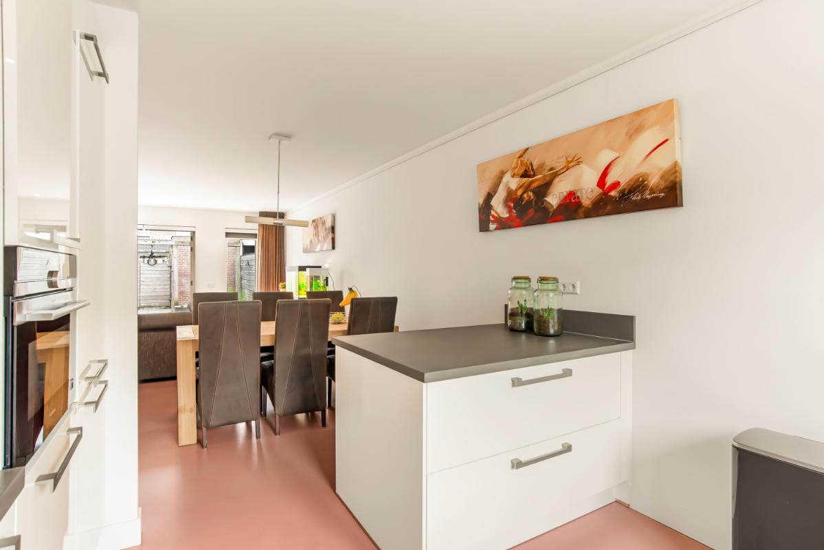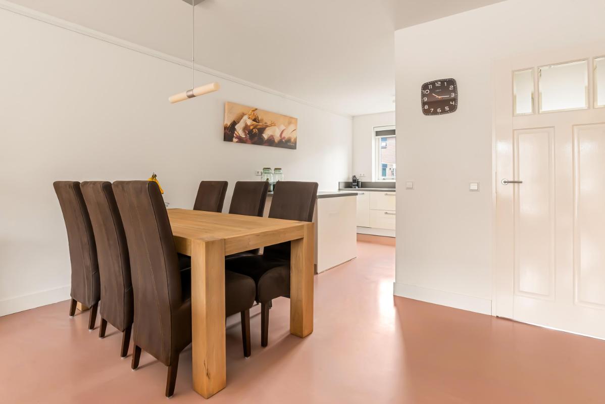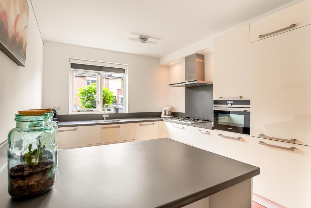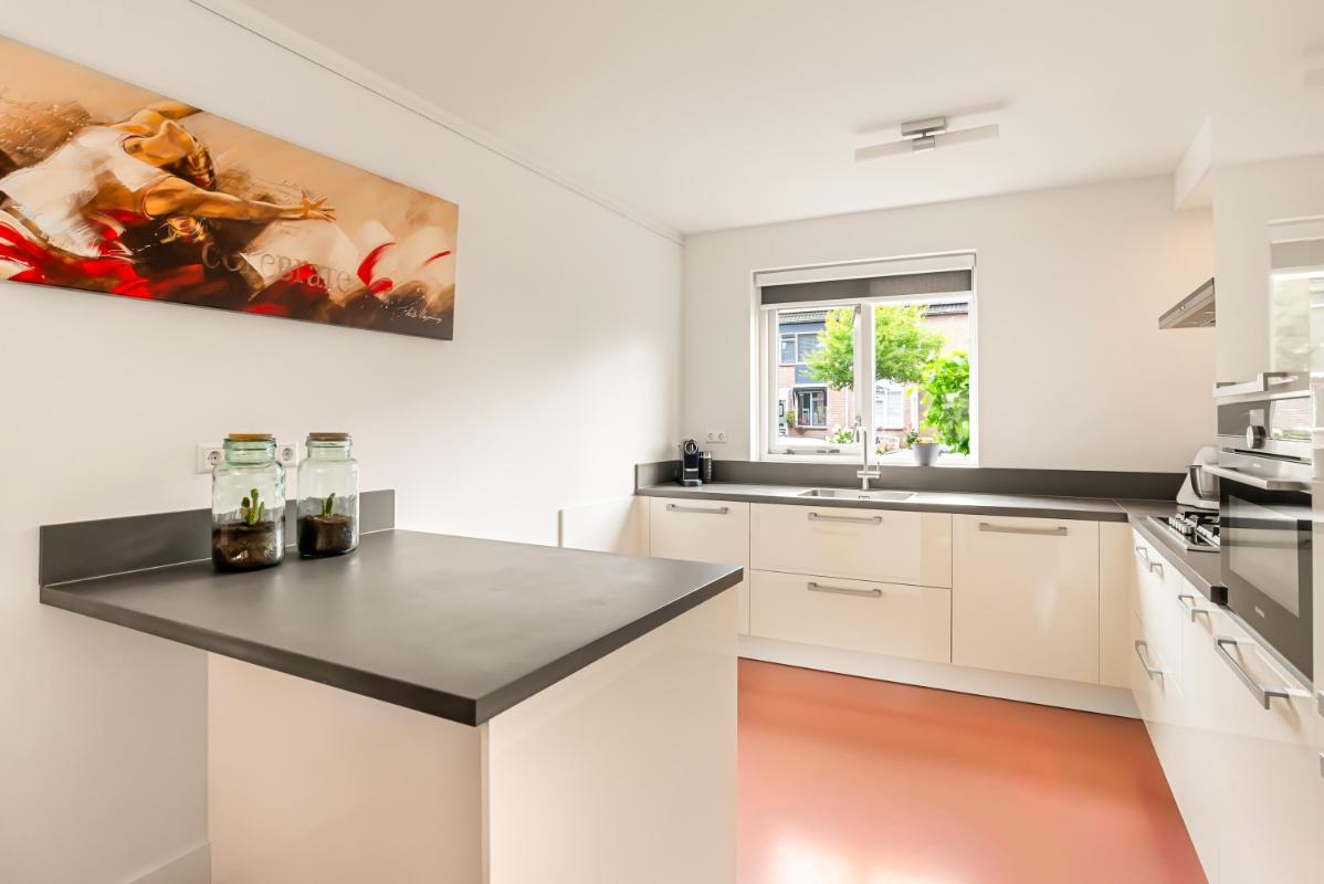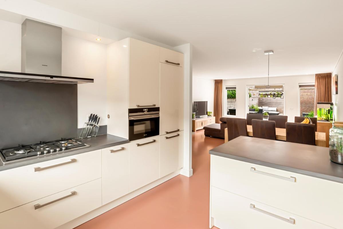 Bij binnenkomst via de entree komt u in een hal met een trapopgang naar de eerste verdieping. Vanuit de hal heeft u toegang tot het toilet, uitgerust met een wandcloset en een fonteintje. De tuingerichte woonkamer is voorzien van openslaande deuren die direct naar de achtertuin leiden. Aan de voorzijde van de woning bevindt zich de open keuken, geplaatst in een L-opstelling met een schiereiland. Het schiereiland beschikt aan één kant over een bargedeelte, wat de keuken een gezellige en praktische uitstraling geeft. De keuken is compleet uitgerust met een 5-pits gaskookplaat, vaatwasser, combimagnetron, koel-vriescombinatie en afzuigkap. De vloer op de begane grond is afgewerkt met een moderne gietvloer met vloerverwarming, wat zorgt voor extra comfort.
