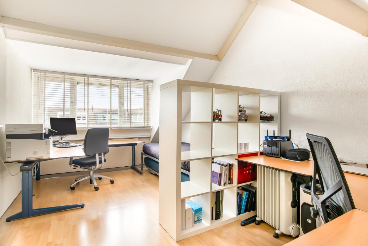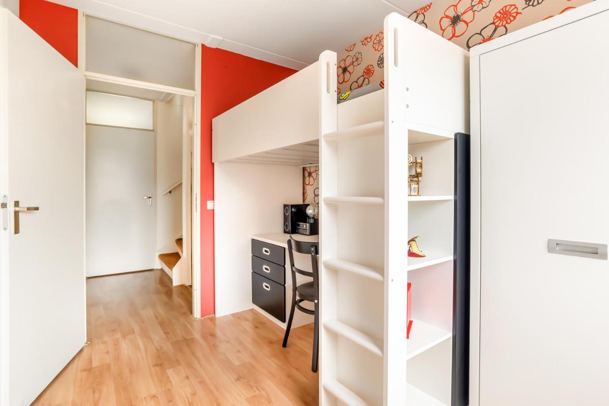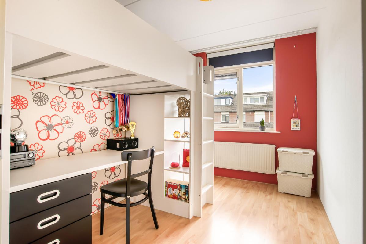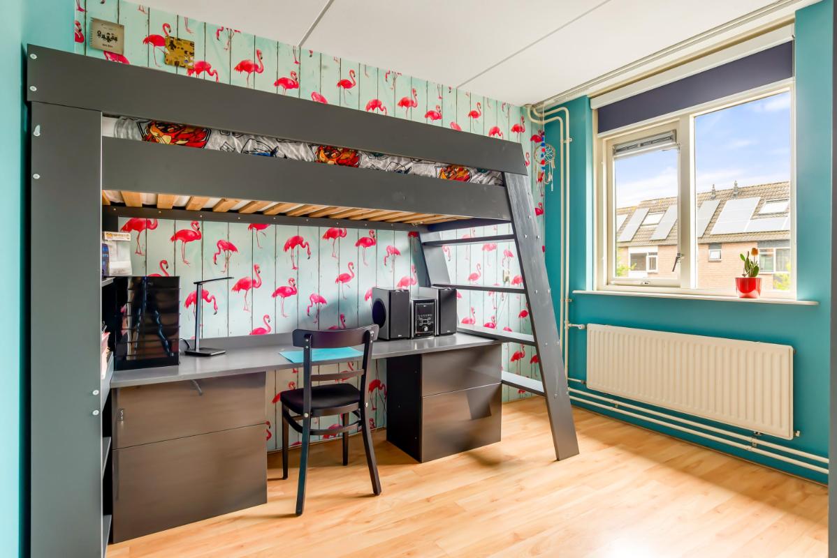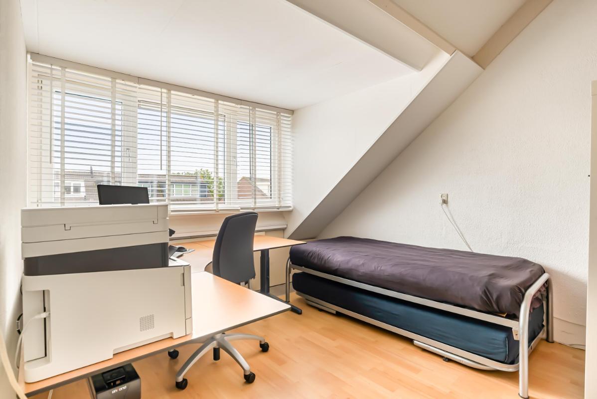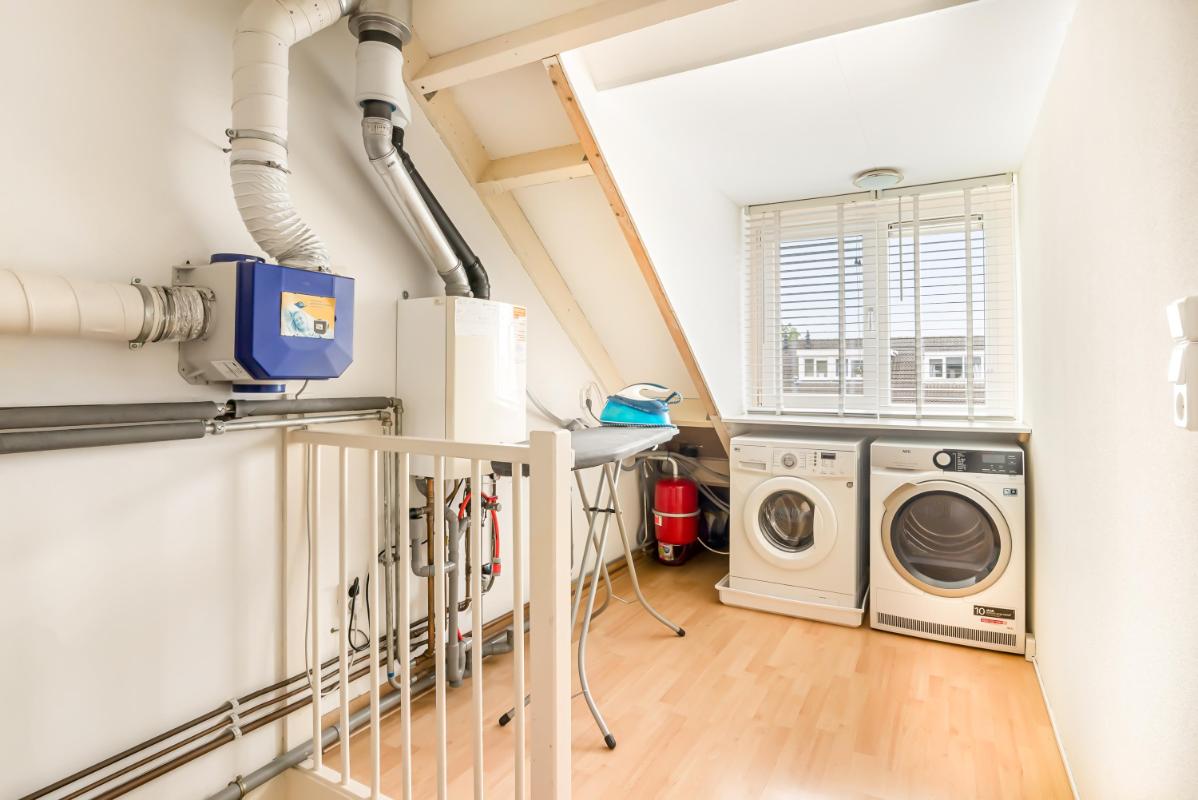Via een vaste trap is de tweede verdieping bereikbaar. Op de overloop bevinden zich de opstelling voor wasmachine, droger, mechanische ventilatiebox en de cv-ketel. Verder is er op deze verdieping een vierde ruime slaapkamer met een groot dakkapel aan de achterzijde, wat zorgt voor veel natuurlijk licht en extra ruimte.