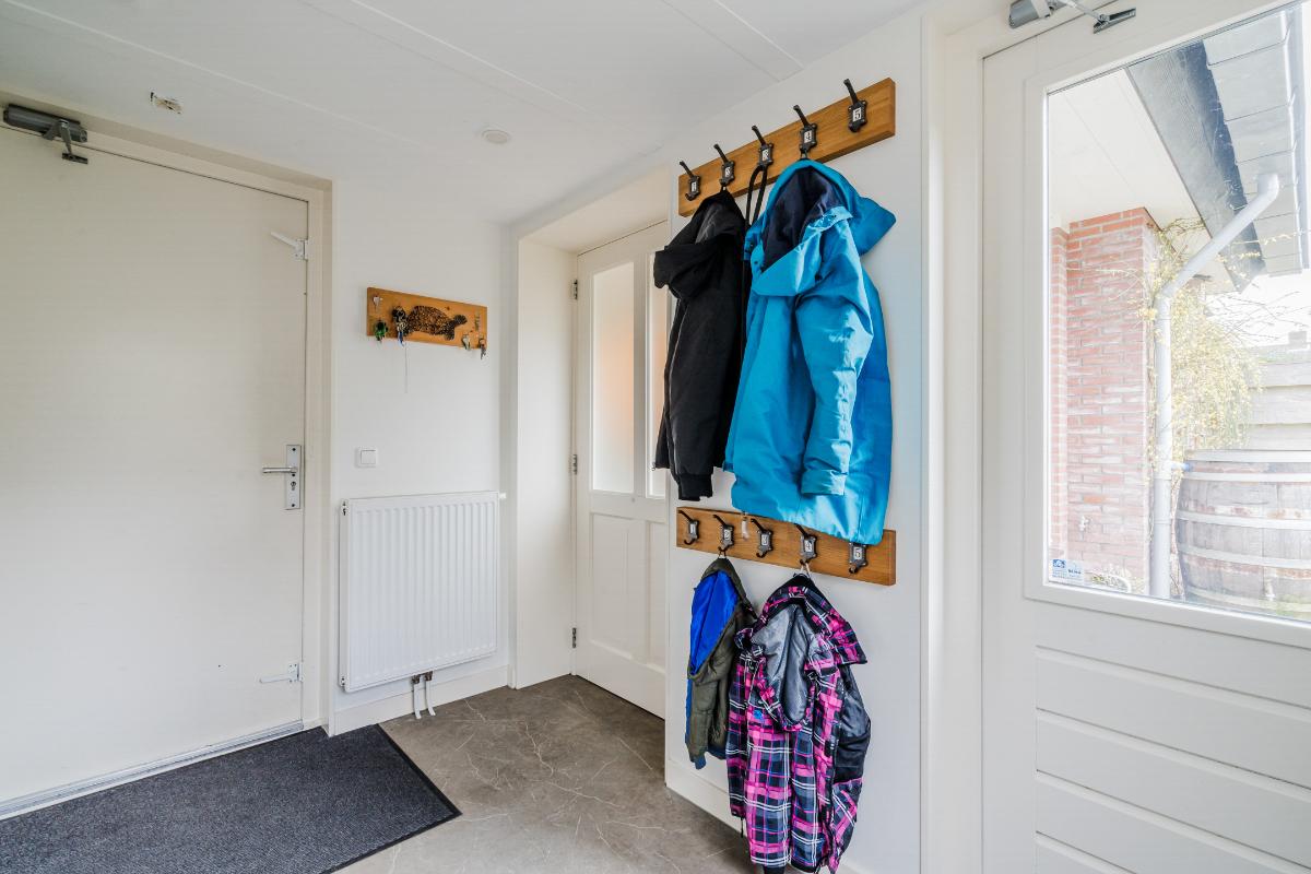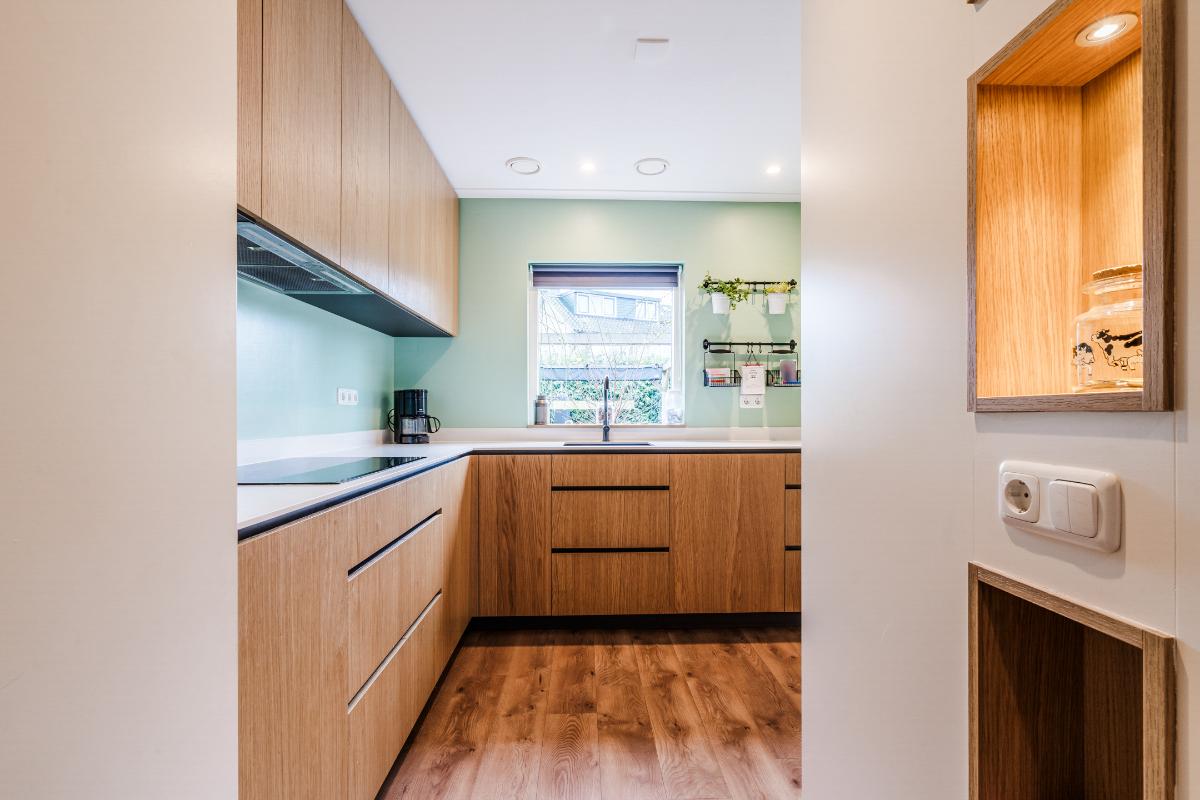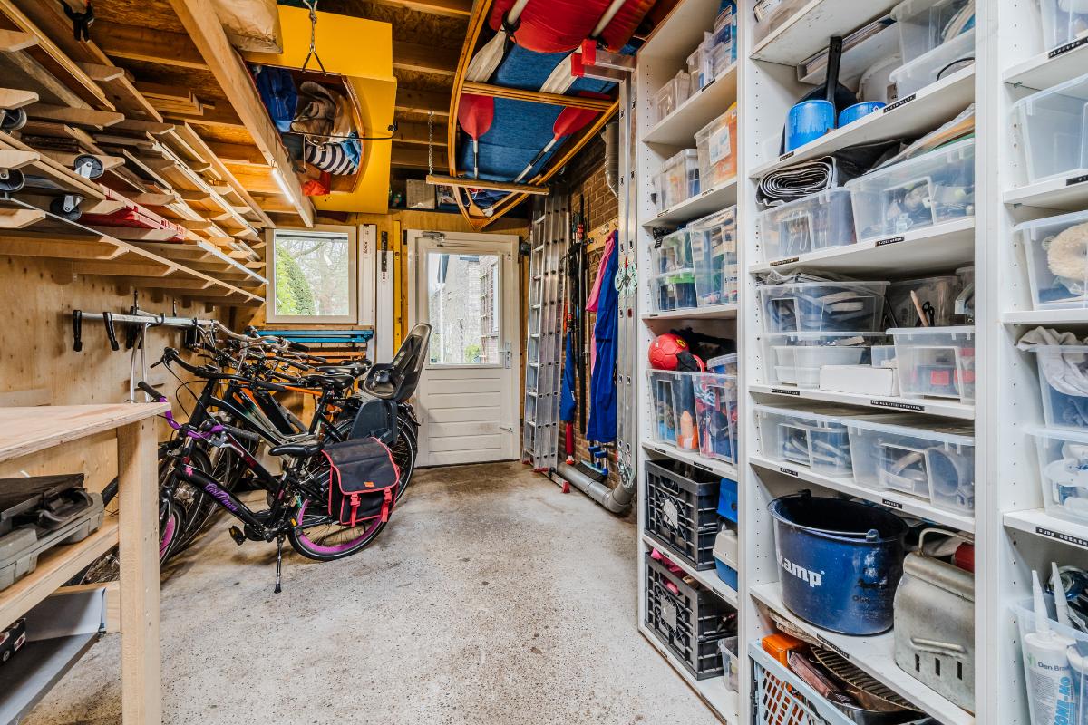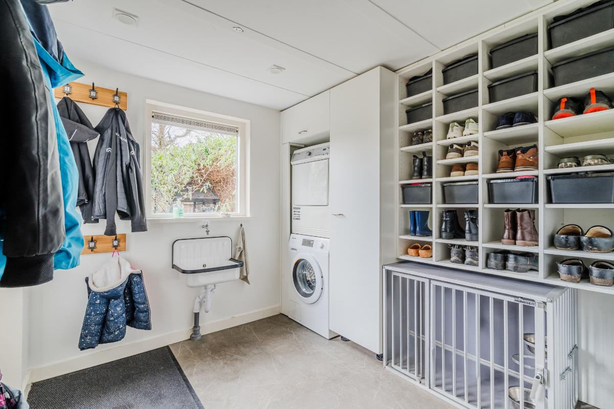 De praktische bijkeuken is voorzien van aansluitpunten voor wasapparatuur en geeft directe toegang tot de tuin en de grote bergruimte.
