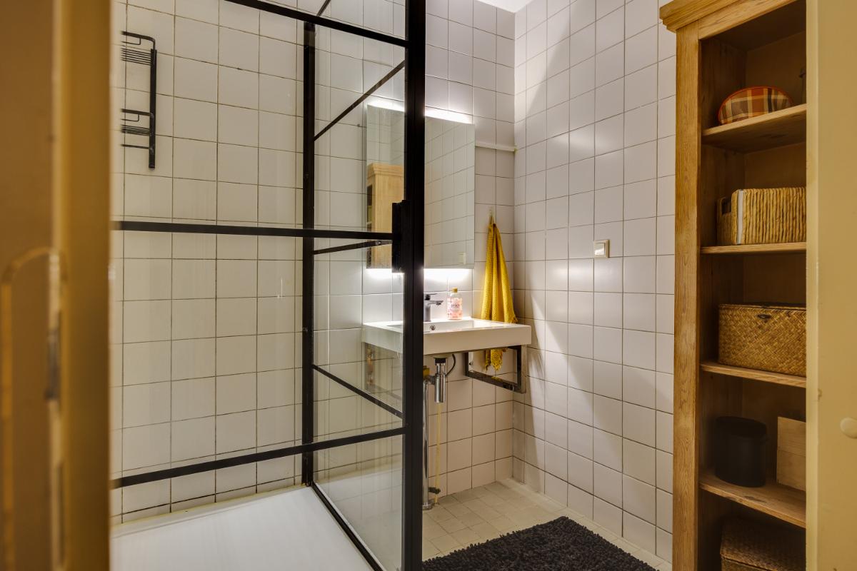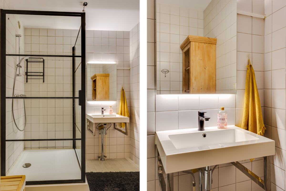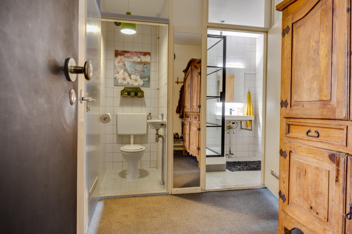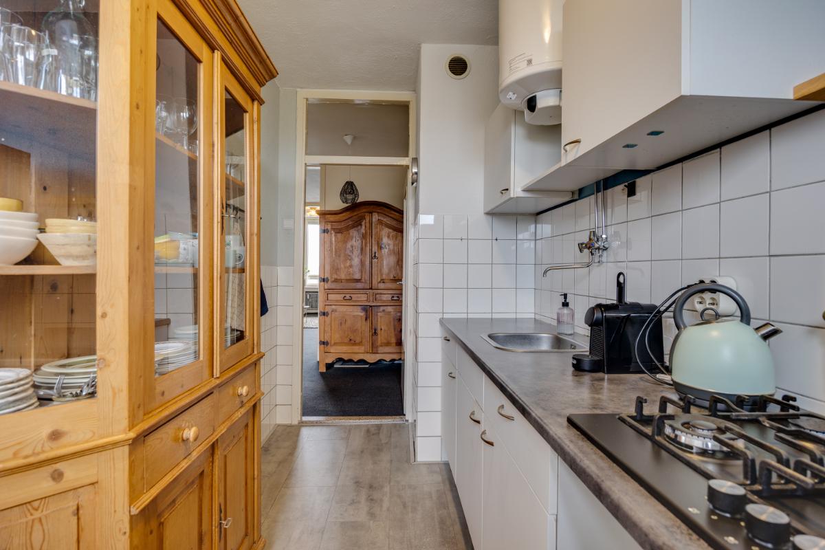 Aan de achterzijde bevindt zich de compacte keuken, voorzien van een elektrische boiler en aansluiting voor de wasmachine. Aansluitend ligt de slaapkamer, een rustige plek met voldoende ruimte voor een comfortabel bed en een royale kledingkast. Verder vind je hier het separate toilet met fonteintje en de verzorgde badkamer met douche en wastafel: praktisch en prettig in gebruik.