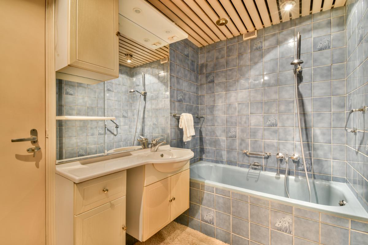 The bedroom is spacious and has a large built-in wardrobe. The adjacent bathroom is equipped with a bath with shower, a large bathroom cabinet with built-in spotlights, storage space, mirror and a washbasin. The adjacent toilet is in the same design as the bathroom.