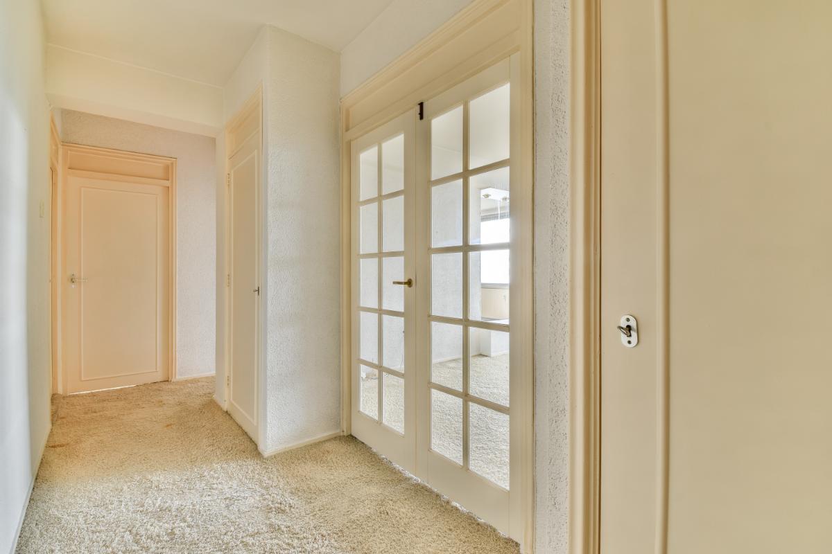The spacious living room is wonderfully light due to the large windows. The spacious balcony facing west is accessible via an entrance door and from here you have an unobstructed view of the Meanderpark. The living room has a high-pile, light carpet that continues throughout the apartment except for the kitchen and toilet. The dining room and kitchen are accessible from the living room. The layout of the apartment can be adjusted relatively easily and there is, for example, the possibility of creating a second bedroom.