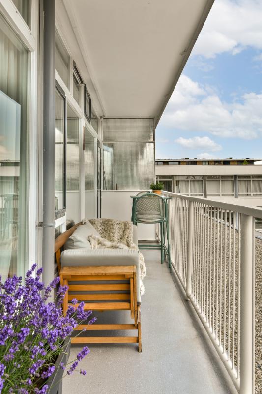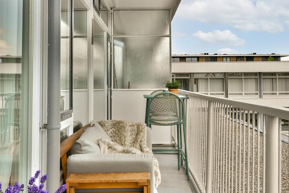 Het balkon ligt op het oosten en strekt zich uit over de gehele breedte van het appartement.