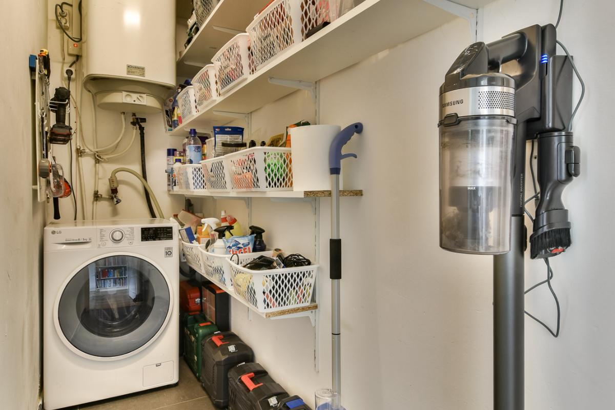 Naast de slaapkamer is een berging aanwezig met hierin de boiler, aansluiting voor de wasmachine en planken voor provisie. Ook is er nog een bergkast naast de keuken met ruimte voor een extra koelkast/vriezer.