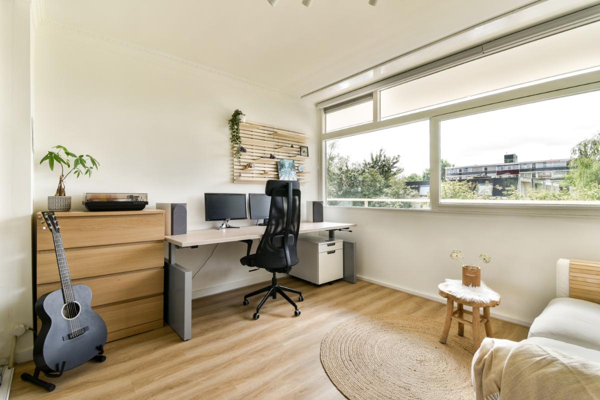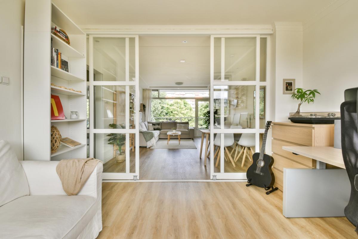 Het appartement heeft een heerlijk royale, lichte woonkamer. De woonkamer is voorzien van glad gestucte wanden en plafonds met inbouwspots. Aan de galerijzijde van de woning is een ruime werkkamer gecreëerd welke d.m.v. sfeervolle glazen schuifdeuren is afgescheiden van de woonkamer. Deze kamer was voorheen een slaapkamer en is vrij eenvoudig weer tot slaapkamer te verbouwen. Vanuit de woonkamer is ook het balkon te bereiken.