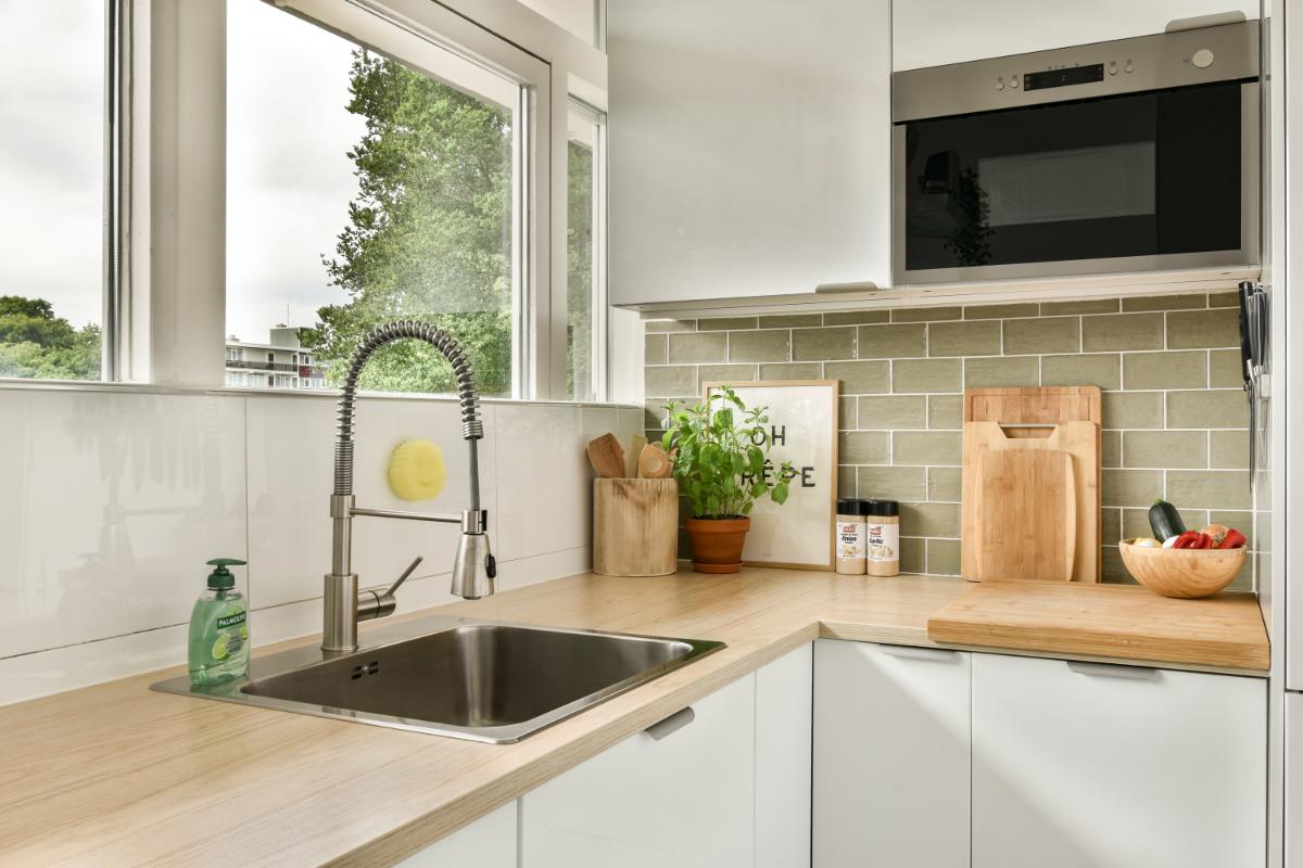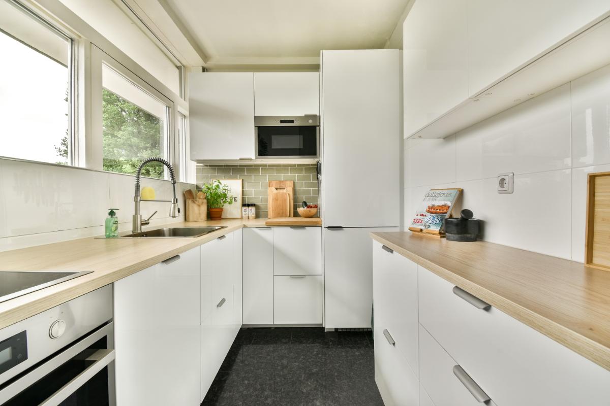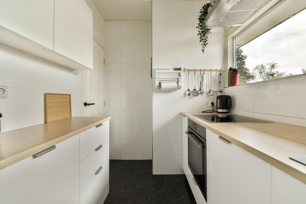 De dichte keuken, vernieuwd in 2022, bevindt zich aan de galerijzijde. De moderne keuken is praktisch ingericht met veel kastruimte en het keukenblok is voorzien van een inductie kookplaat, een afzuigkap, een oven, een magnetron, een koel-/vriescombinatie en een vaatwasmachine.