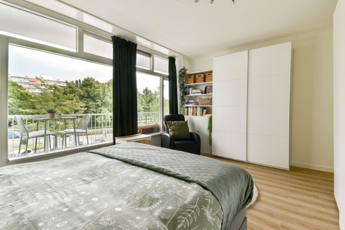 Naast de woonkamer bevindt zich de slaapkamer. Deze slaapkamer biedt ook toegang tot het balkon. De ruime kamer is heerlijk licht door de grote raampartij, de wanden zijn voorzien van stucwerk.