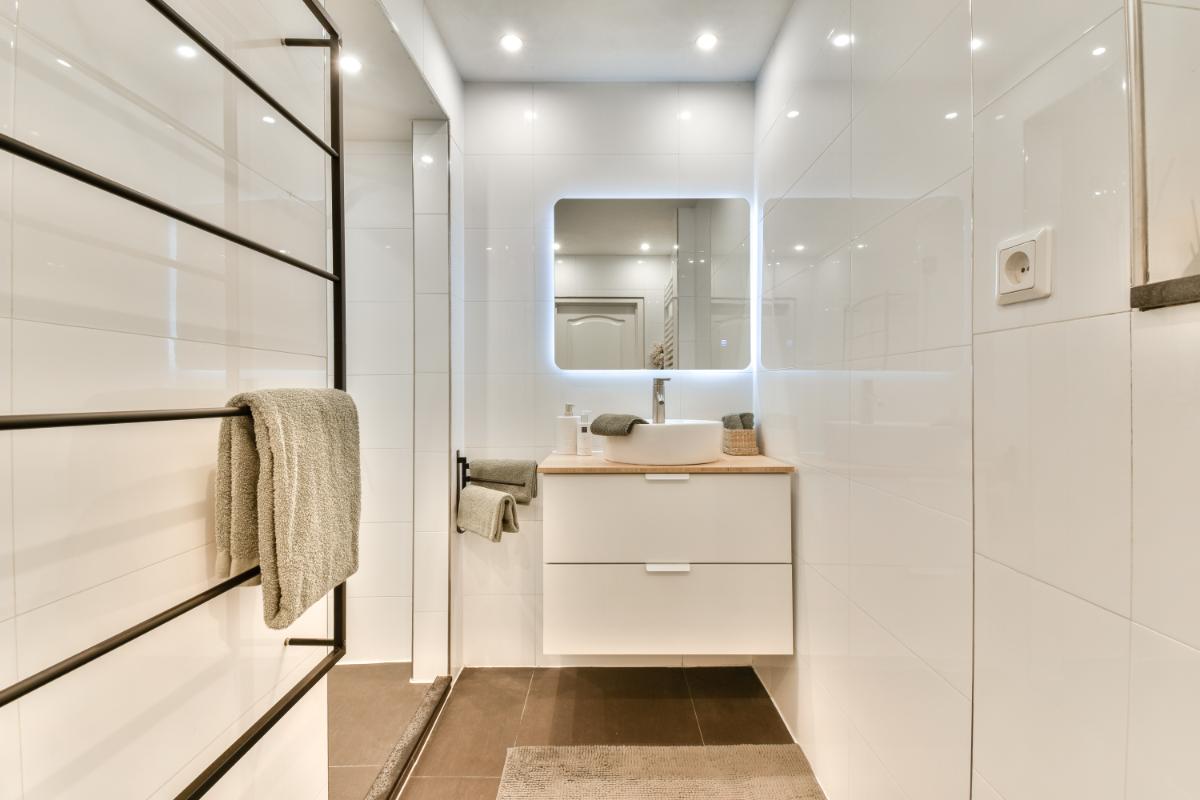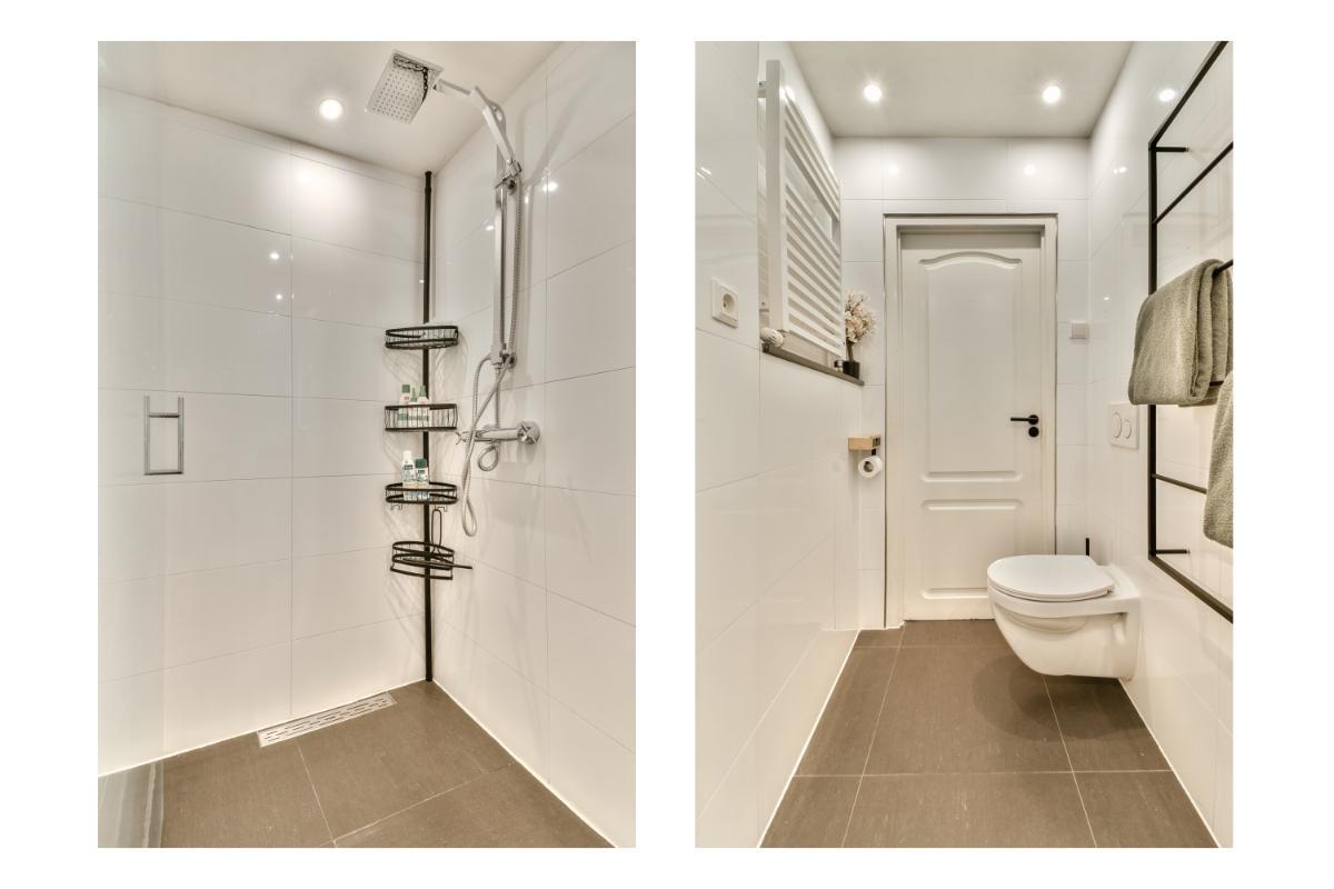 De moderne badkamer is in 2022 gedeeltelijk vernieuwd en voorzien van een wastafel met meubel een spiegel met verlichting, een inloopdouche, een designradiator en een toilet.