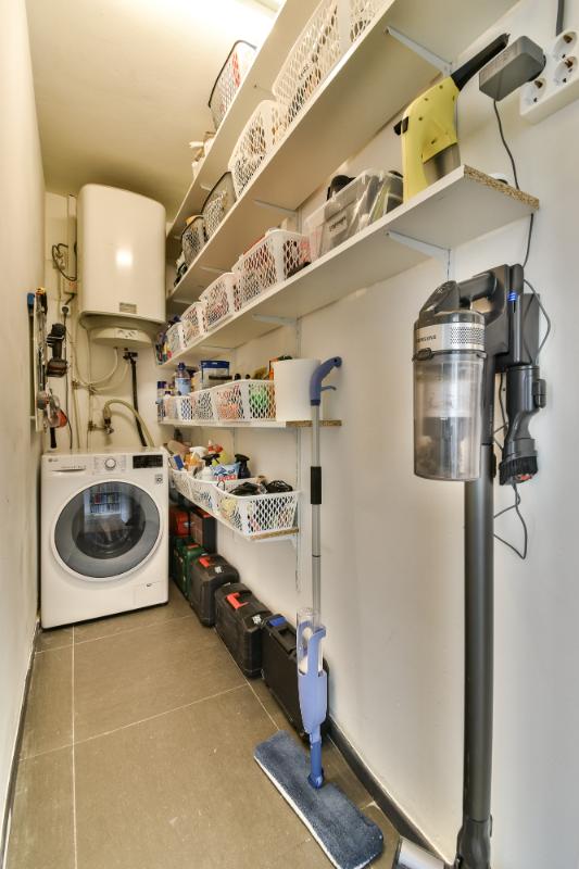 Next to the bedroom is a storage room with the boiler, connection for the washing machine and shelves for provisions. There is also a storage cupboard next to the kitchen with space for an extra fridge/freezer.