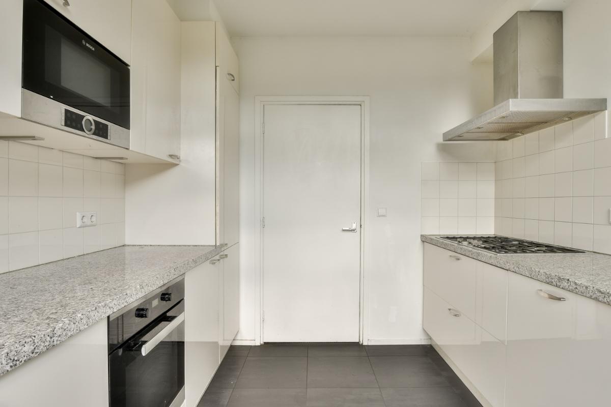 De keuken beschikt aan twee kanten over een keukenblok met veel opbergruimte en een kunststof werkblad. Aan een kant zijn ook bovenkasten aanwezig. De keuken heeft diverse inbouwapparatuur, zoals een heteluchtoven, een 5 pits-gaskookplaat met afzuigkap, een magnetron, een koel-/vriescombinatie en een vaatwasser. Er is een toegangsdeur naar de achtertuin aanwezig.