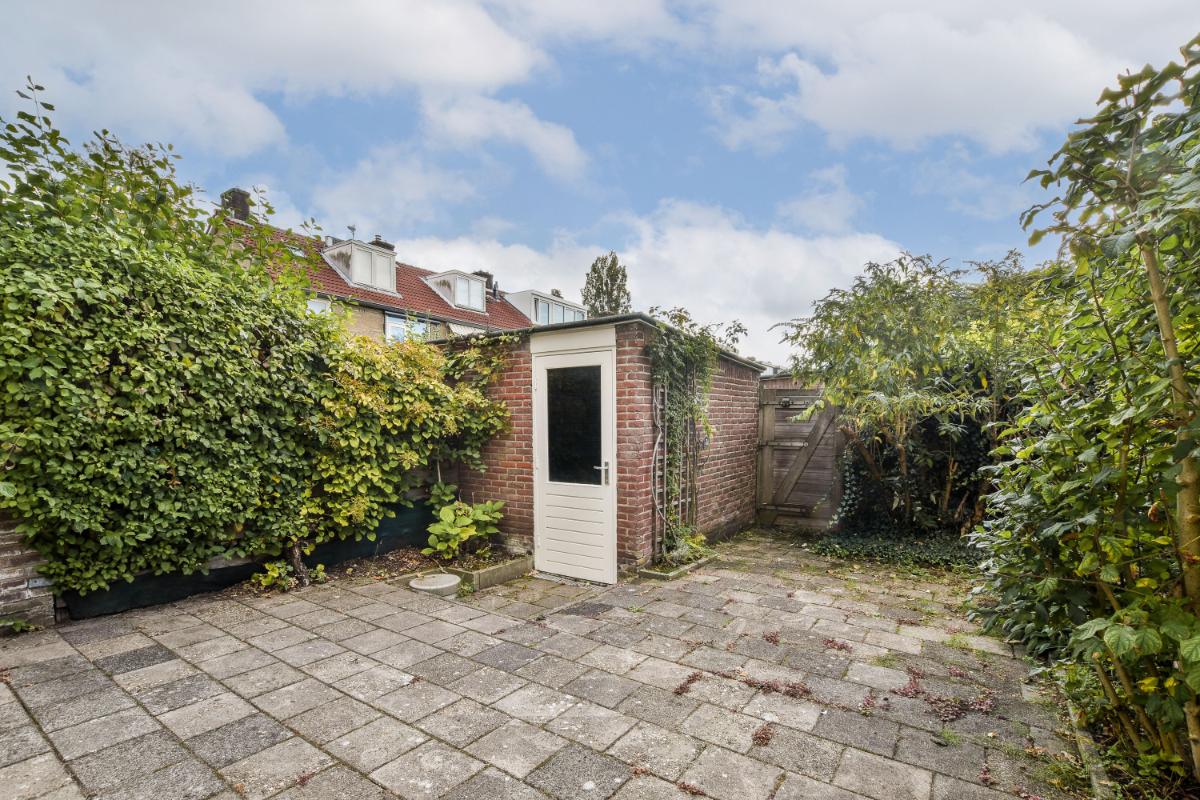 De zonnige achtertuin ligt op het zuiden en is voorzien van bestrating en borders met vaste beplanting. Achter in de tuin staat een vrijstaande stenen berging en er is ook een achterom. Door het ontbreken van bebouwing achter het perceel biedt ook de achtertuin veel privacy.