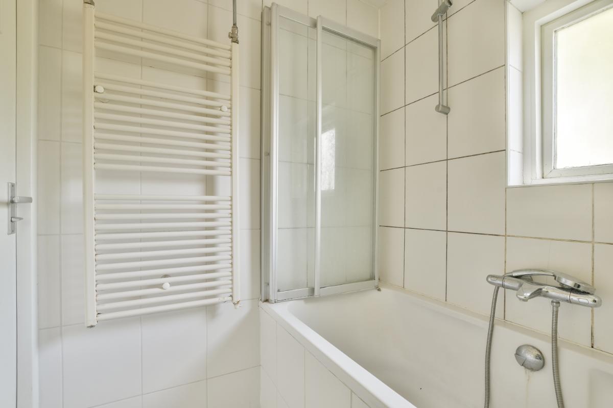 The bathroom features white tiling, a bathtub with shower attachment and splashback, a sink, and a designer radiator. There is also a window for natural light and ventilation.