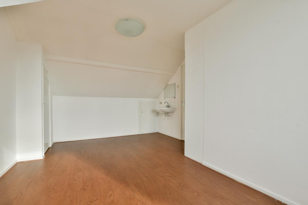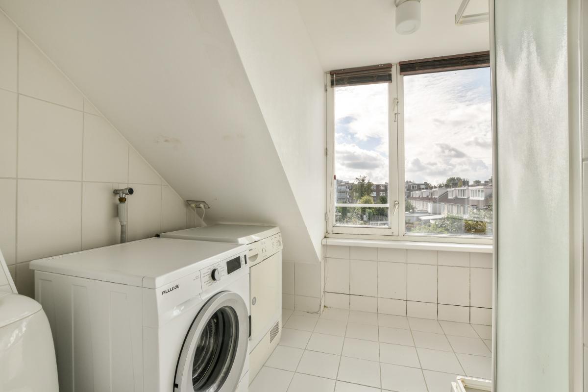 De 2e verdieping is bereikbaar via een vaste trap. De overloop biedt toegang tot een grote slaapkamer en de tweede badkamer. De badkamer is ingedeeld met een toilet, een douchecabine en een badkamermeubel met wastafel, spiegel en kastruimte. Hier zijn ook de aansluitingen voor wasmachine en droger aanwezig. De slaapkamer beschikt over twee ingebouwde kasten en veel extra bergruimte achter de knieschotten. In één van de kasten bevindt zich de cv-installatie. De tweede verdieping is aan de achterzijde voorzien van een brede dakkapel.