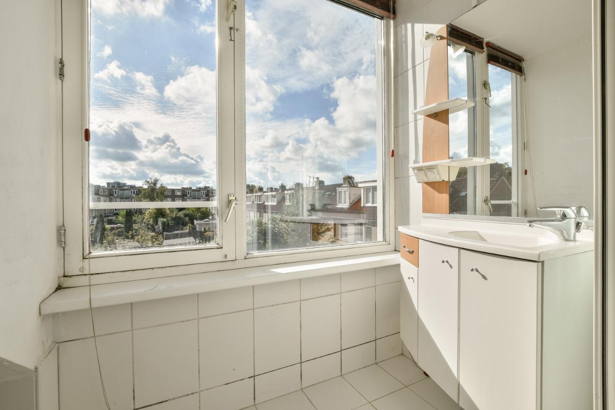 De badkamer is voorzien van witte betegeling, een ligbad met douchegelegenheid en spatscherm, een wastafel en een designradiator. Ook is er een raam aanwezig voor daglicht en natuurlijke ventilatie.