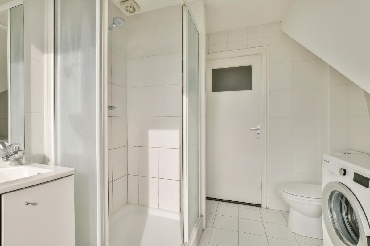 The second floor is accessible via a fixed staircase. The landing provides access to a large bedroom and the second bathroom. The bathroom is equipped with a toilet, a shower stall, and a vanity with a sink, mirror, and storage. Connections for a washing machine and dryer are also located here. The bedroom has two built-in wardrobes and ample additional storage space behind the knee walls. The central heating system is located in one of the wardrobes. The second floor has a wide dormer window at the rear.