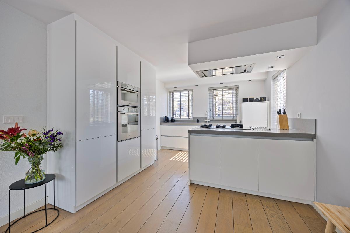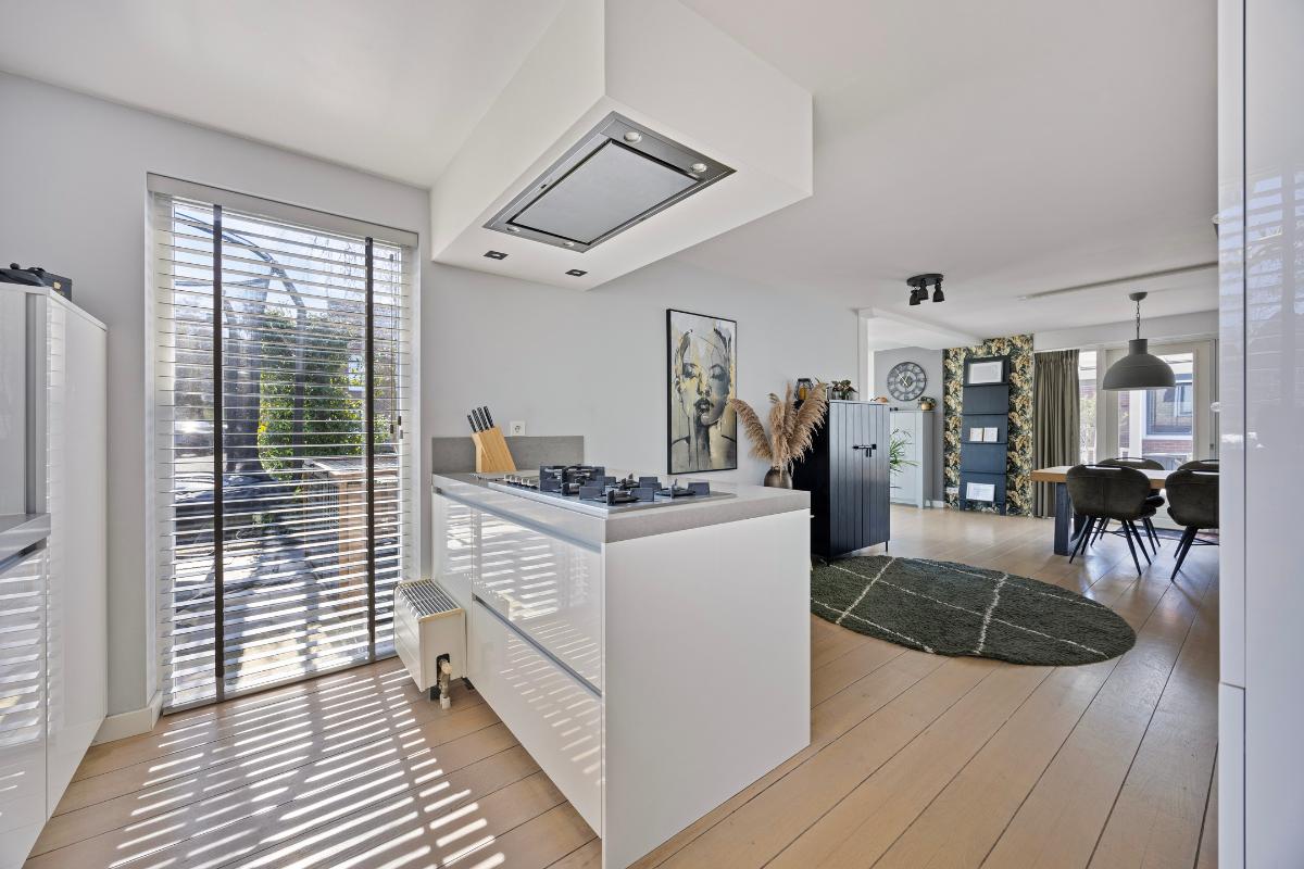 Indeling Begane grond: entree, hal, meterkast, toilet met fontein, trapopgang, toegang naar de royale woonkamer, provisie/trapkast, open keuken met schiereiland en kastenwand v.v. inbouwapparatuur, toegang naar de achtertuin met veranda middels openslaande deuren (2x).