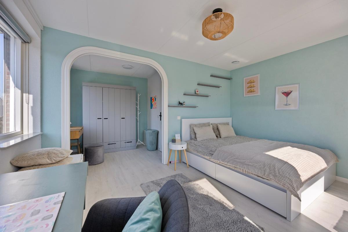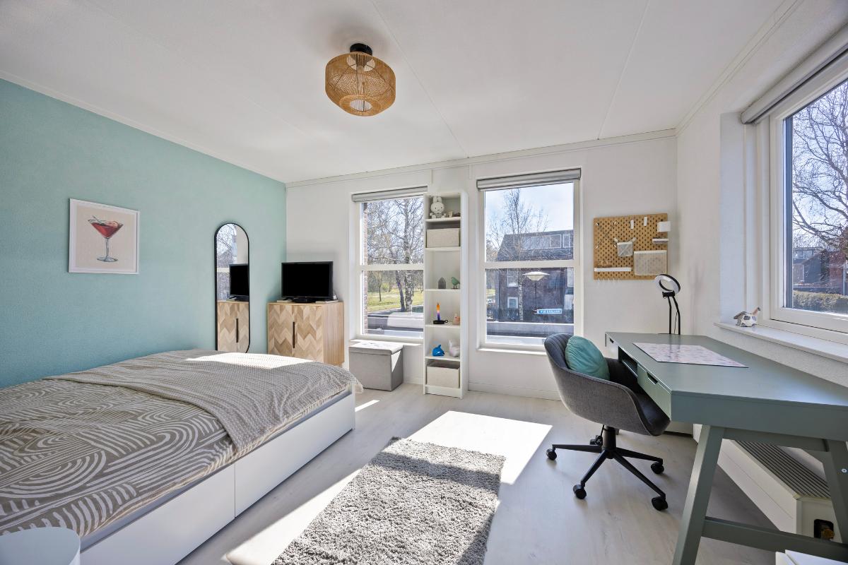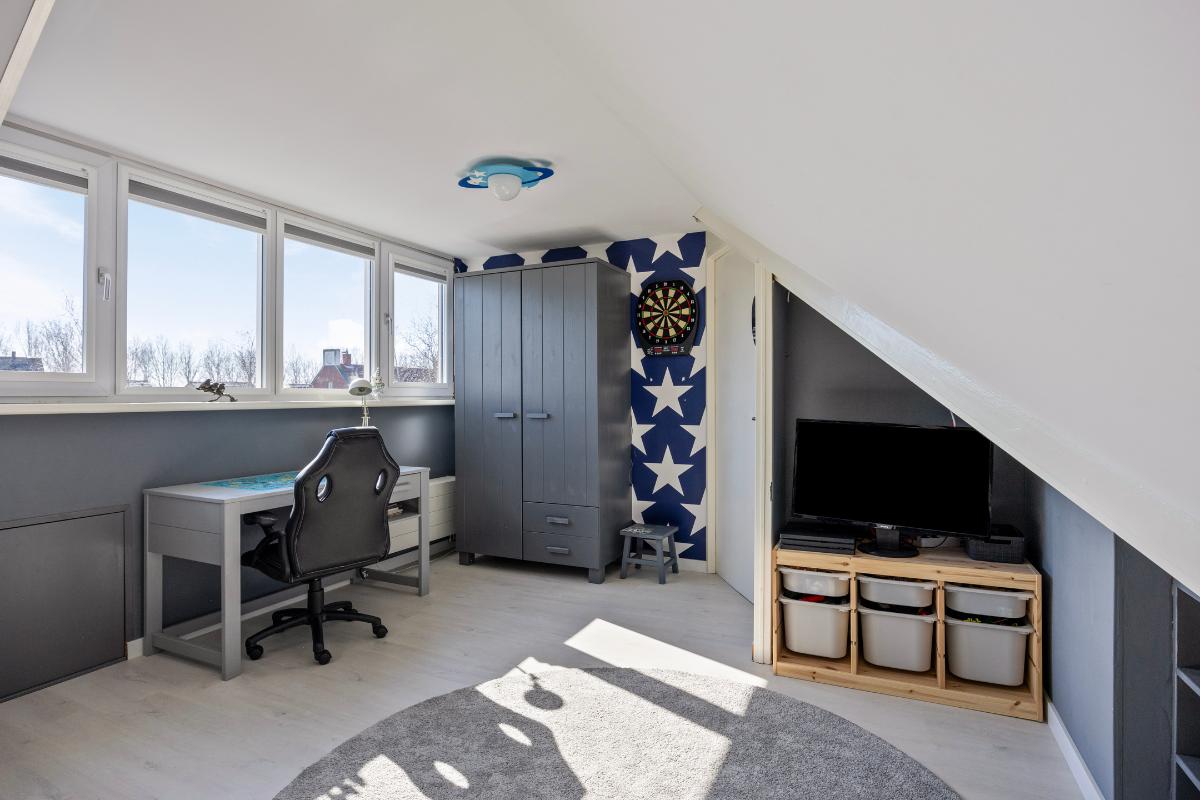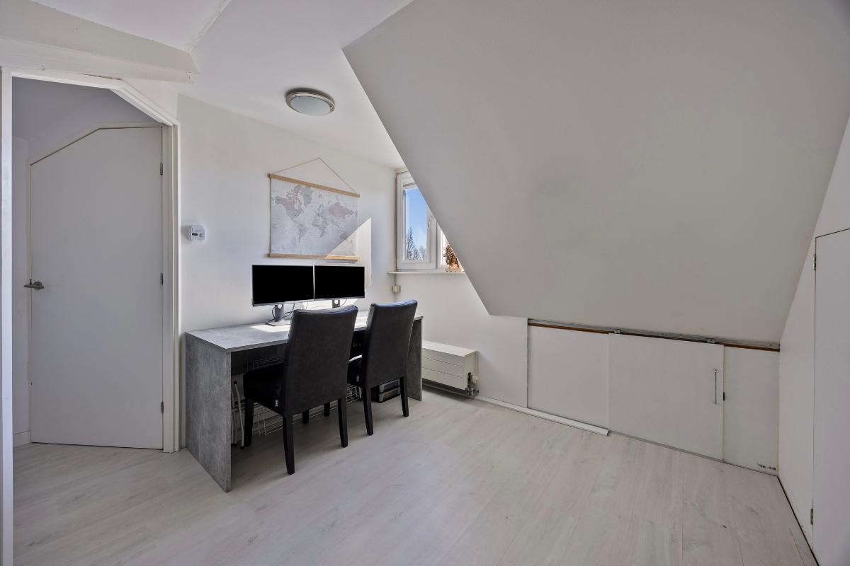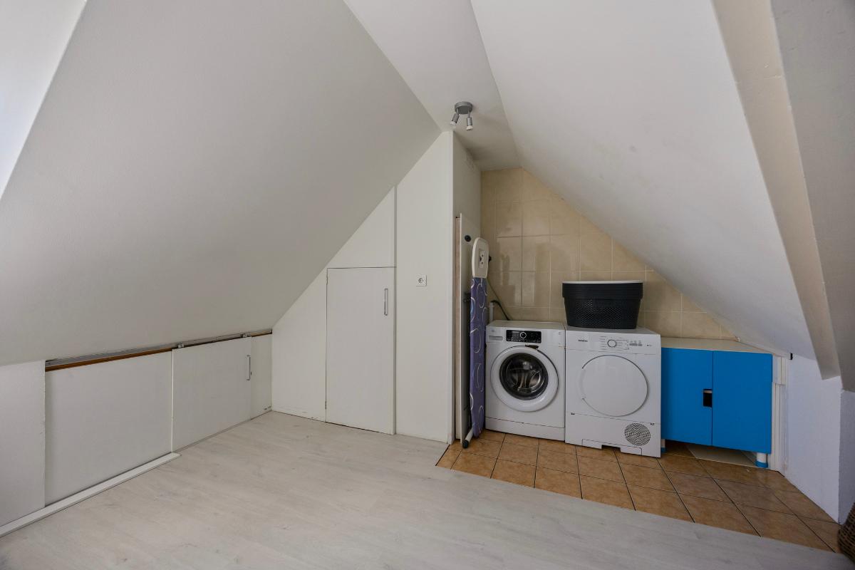 Tweede verdieping: middels vaste trap naar overloop, ruime slaapkamer met dakkapel, berging en tweede kamer met opstelling/aansluiting wasmachine/droger, cv-ketel en WTW.