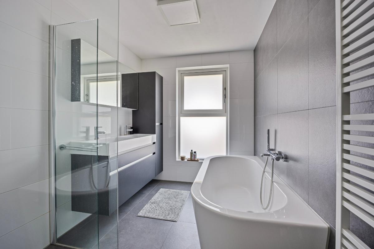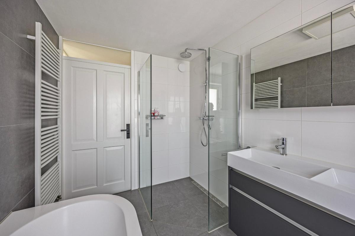 Eerste verdieping: overloop, twee (voorheen drie) ruime slaapkamers, separaat toilet en een luxe badkamer v.v. inloopdouche, dubbele wastafel met meubel en ligbad.
