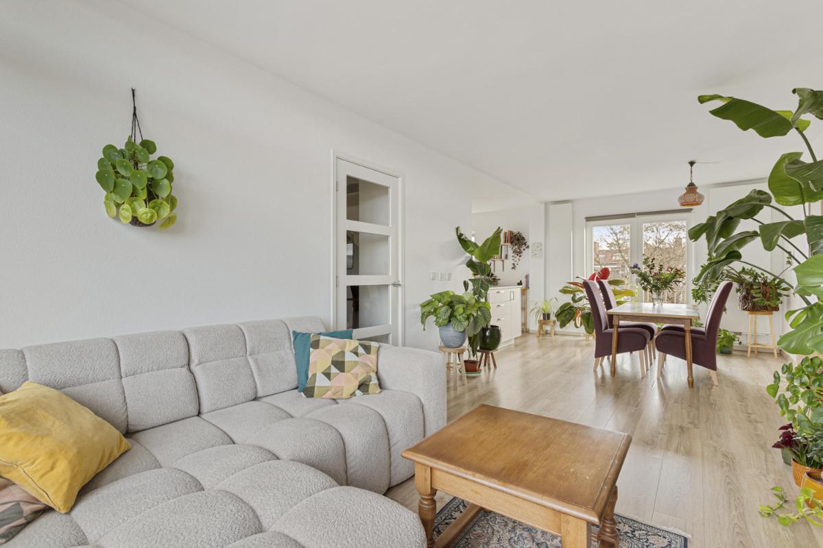 WOONKAMER De lichte woonkamer (ca. 8.03 x 3.43m) is voorzien van een fraaie laminaatvloer en strakke wand- en plafondafwerking. De woonkamer geniet enorm veel lichtinval middels de vele kozijnen en staat aan de voorzijde in verbinding met het balkon (met bergkast) en aan de achterzijde in open verbinding met de keuken en het frans balkon.