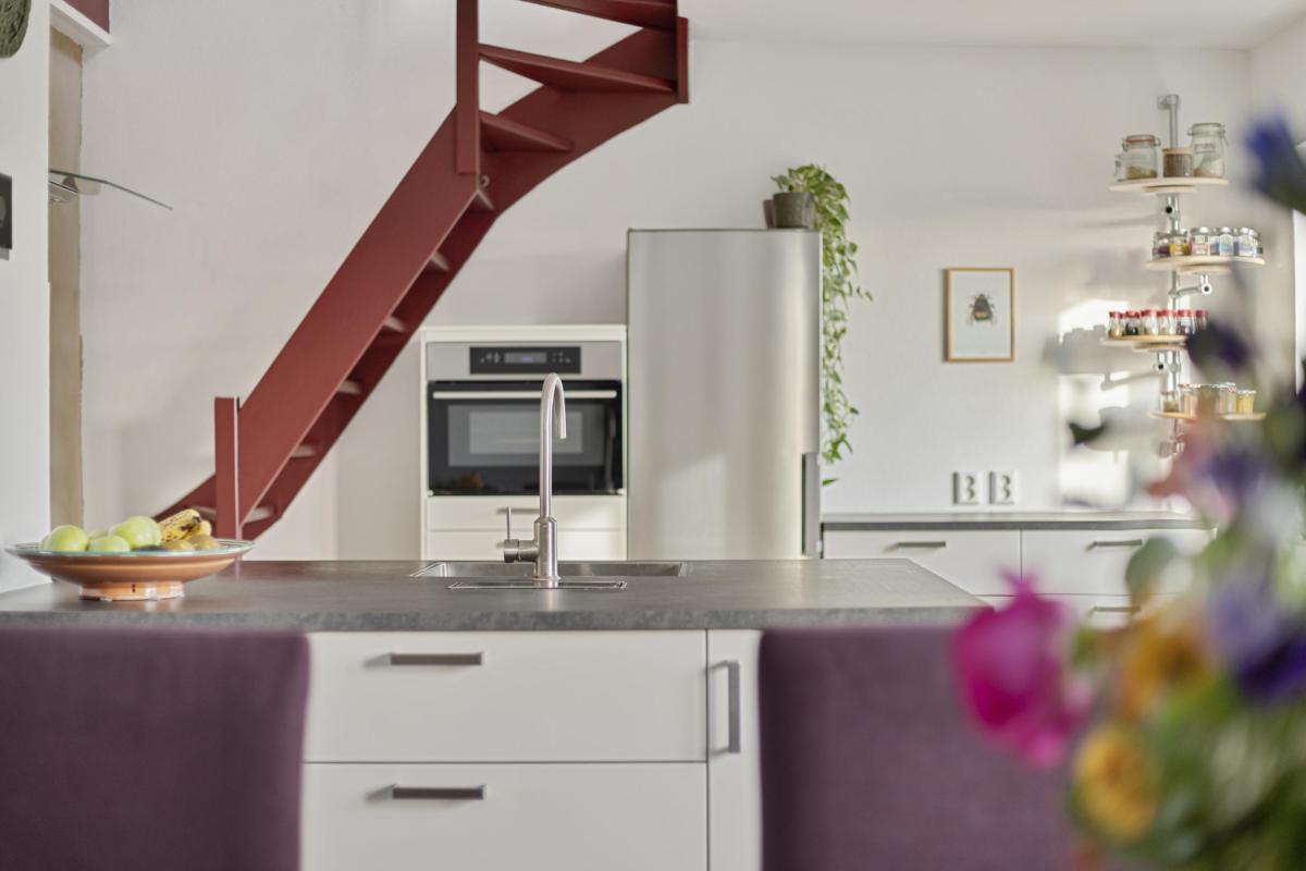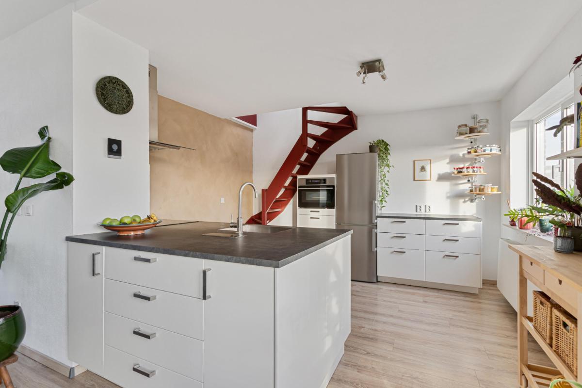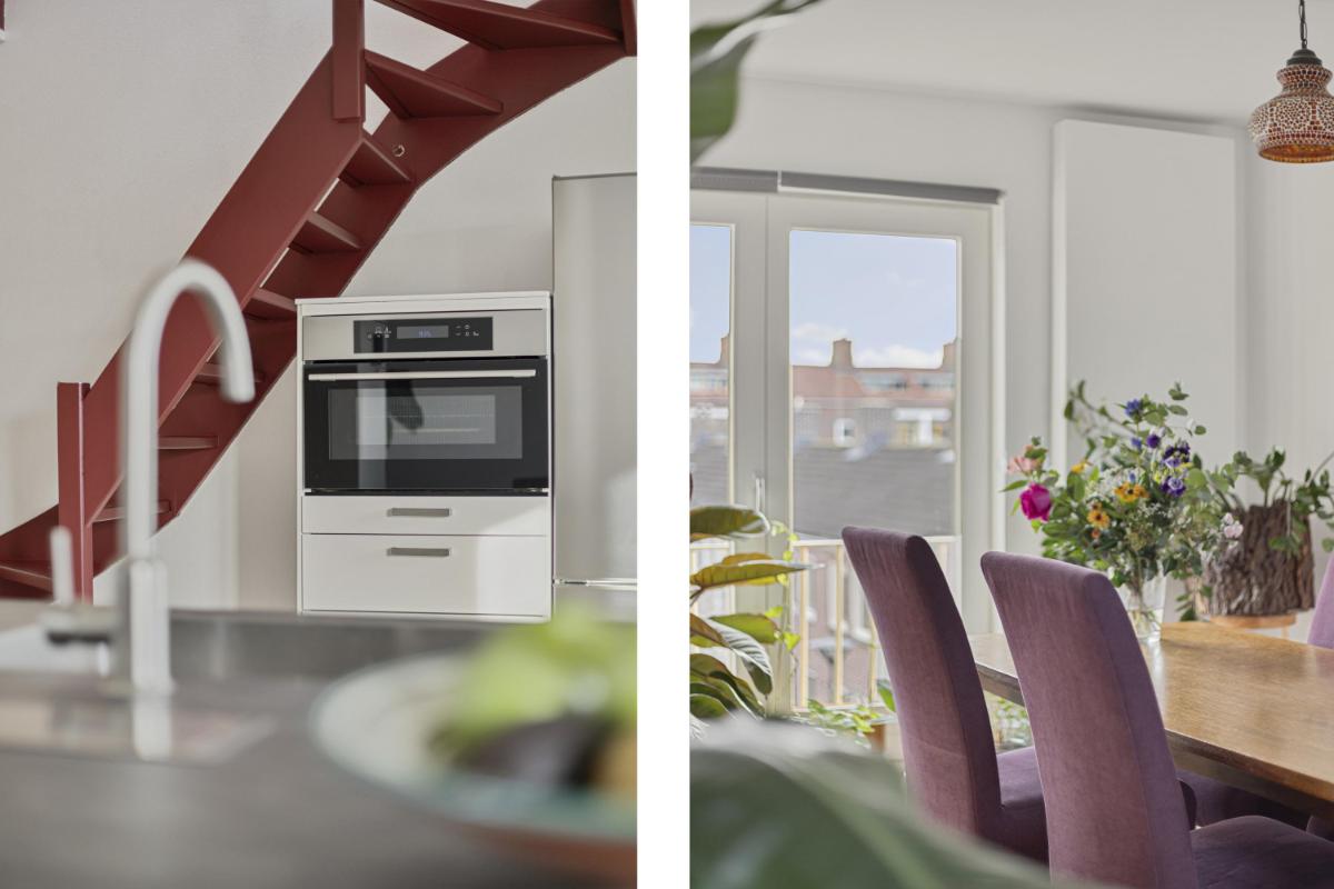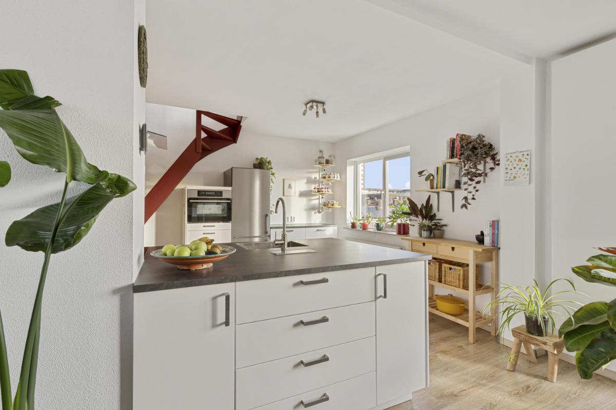 KEUKEN De royale open leefkeuken (ca. 3.96 x 3.50m.) is uitgerust met een praktisch schiereiland, voorzien van zowel een spoelgedeelte als een kookgedeelte en biedt veel opbergruimte. Daarnaast beschikt de keuken over moderne inbouwapparatuur, waaronder een 4-pits inductiekookplaat, een afzuigkap, een vaatwasser en een combi-oven. Via de keuken is middels een vaste trap toegang de bovengelegen etage.