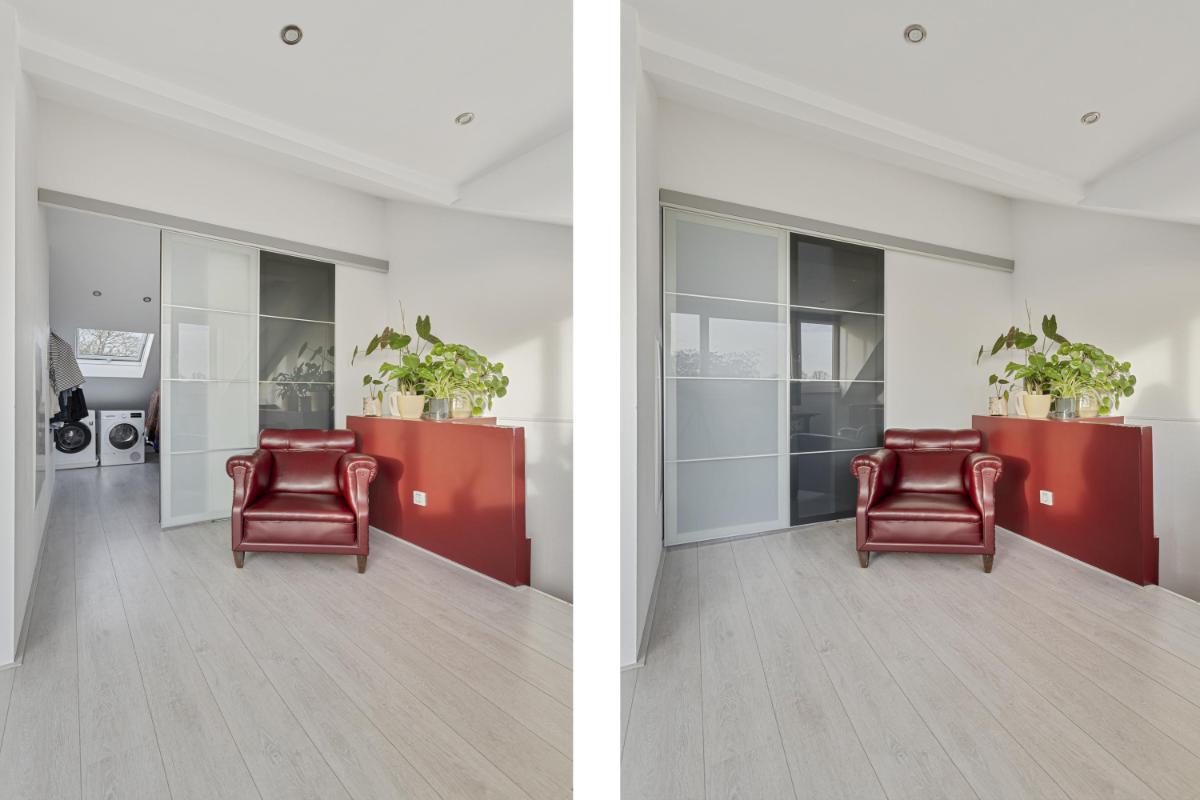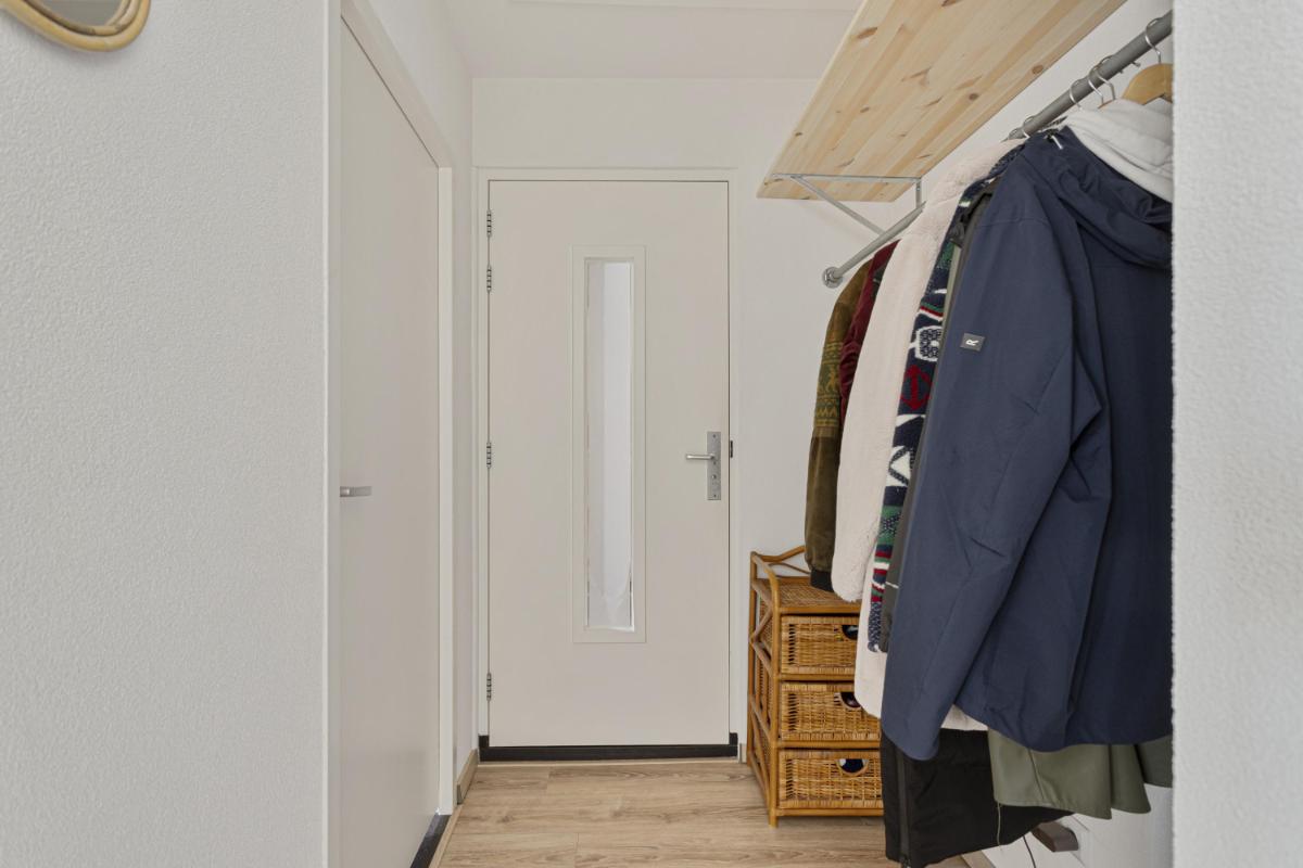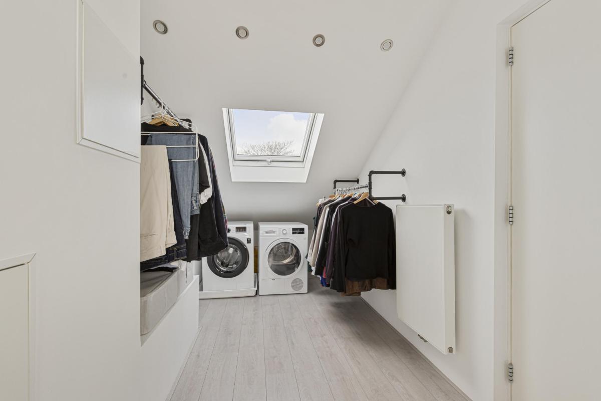 WASRUIMTE Via een schuifdeur vanuit de slaapkamer is de multifunctionele wasruimte te bereiken. In deze ruimte bevinden zich de aansluitingen ten behoeve van de wasapparatuur. Deze ruimte is voorzien van een dakraam en een tweede buitendeur naar het trappenhuis voor extra toegangsmogelijkheden.