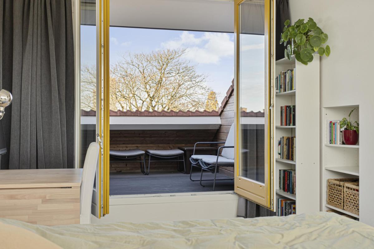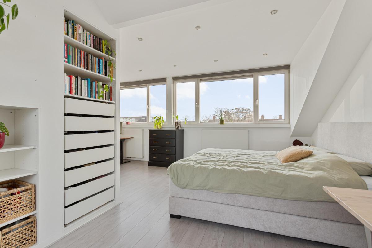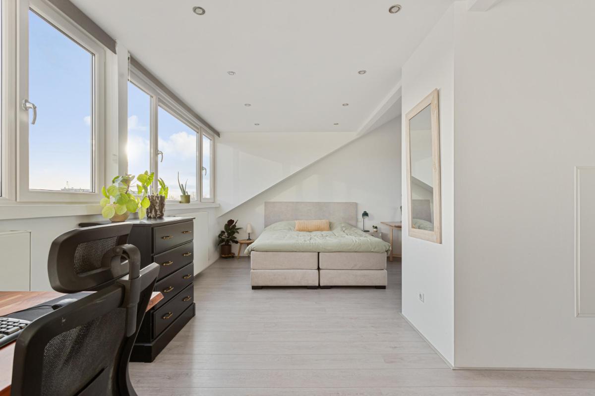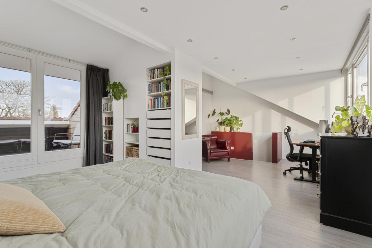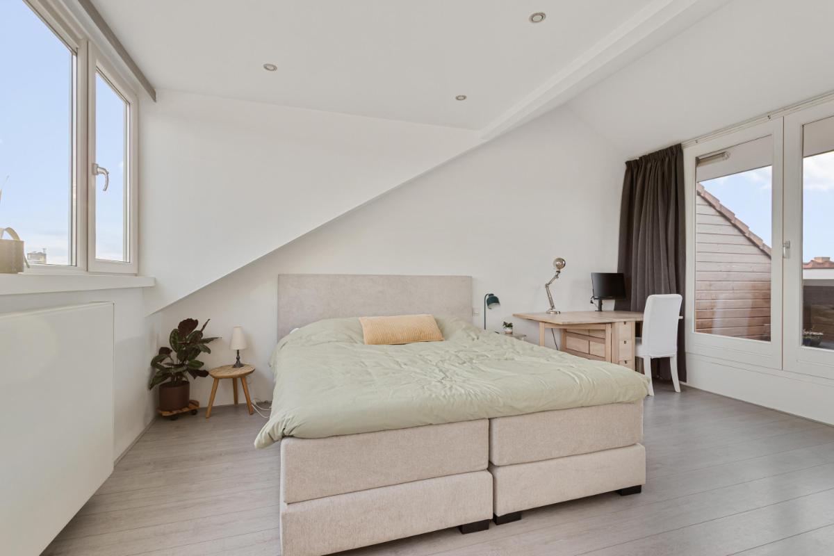 SLAAPKAMER De zeer ruime (ouder)slaapkamer (ca. 6.93 x 5.03/3.98m) is gelegen aan de achterzijde en voorzien van een dakkapel over de gehele breedte van het appartement. Deze slaapkamer biedt voldoende opbergruimte dankzij twee ingebouwde kasten met hierin o.a. de opstelplaats van de CV-ketel en de mechanische ventilatie-unit. Vanuit de slaapkamer is het dakterras aan de voorzijde bereikbaar.
