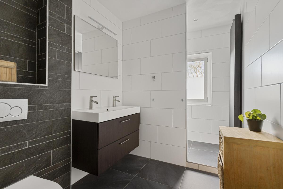BADKAMER De geheel betegelde badkamer (ca. 3.18 x 2.01m.) beschikt over een ruime inloop (regen)douche met inbouwkranen en separate handdouche, dubbele wastafel met meubel, inbouwspots, mechanische ventilatie en een vrijhangend closet.