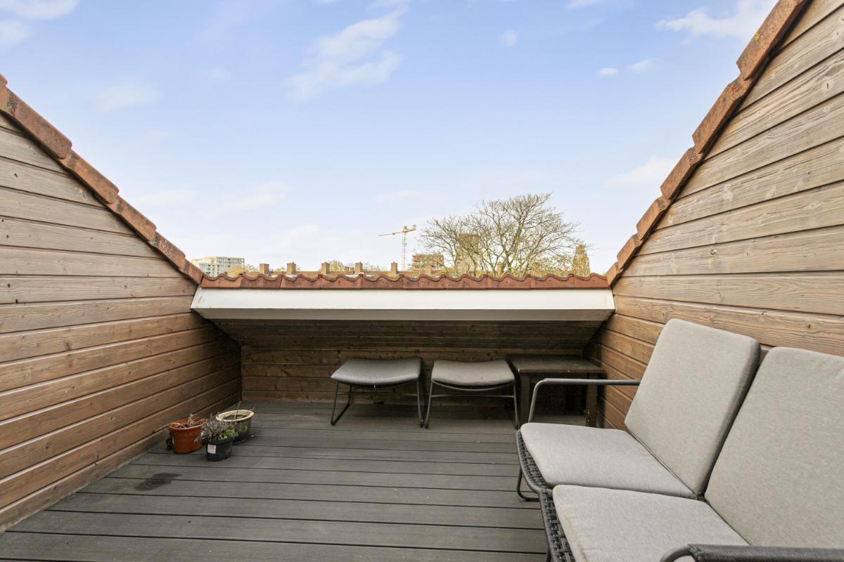 DAKTERRAS Vanaf de 3e en bovenste woonlaag biedt het dakterras (ca. 3.15 x 2.98m) gesitueerd op het zonnige zuidwesten een heerlijk vrij uitzicht en optimale rust en privacy.