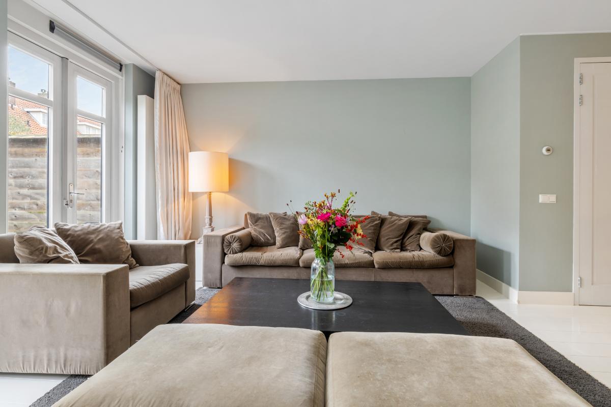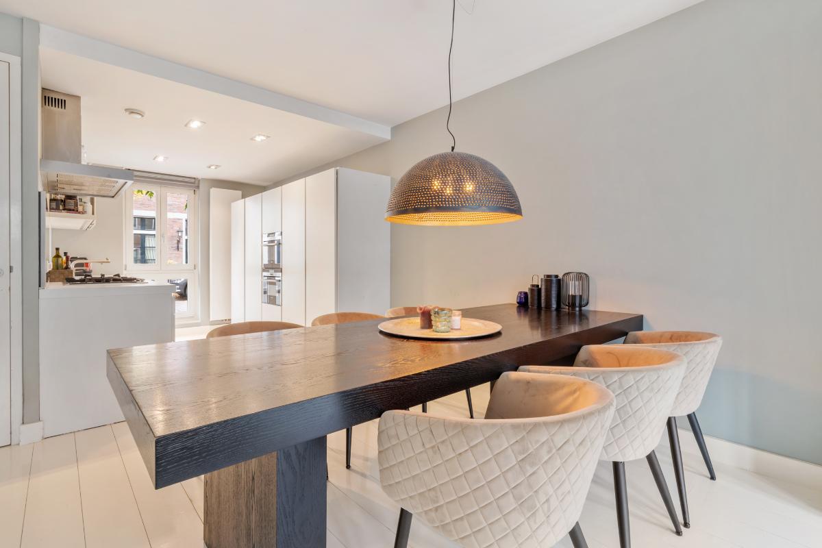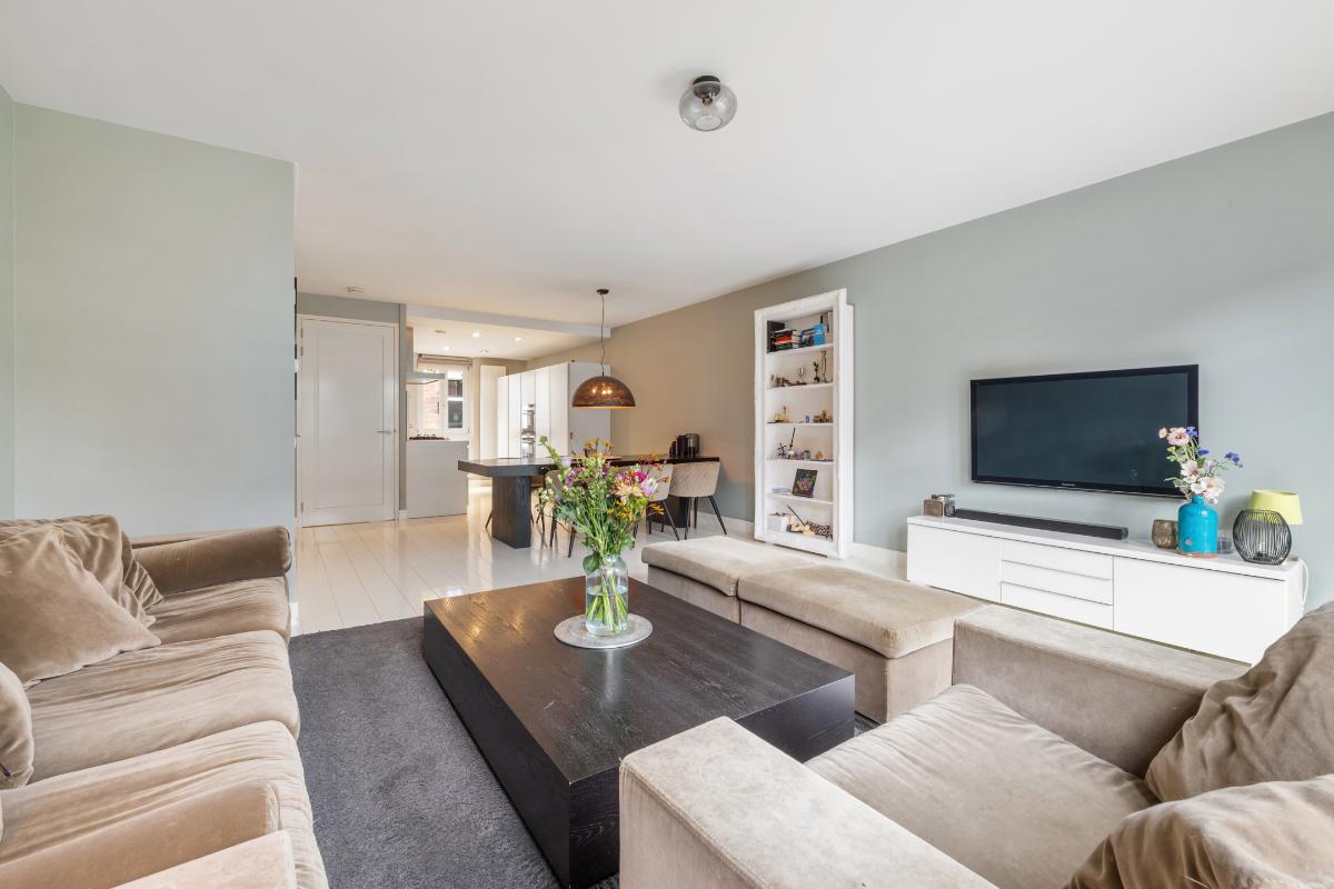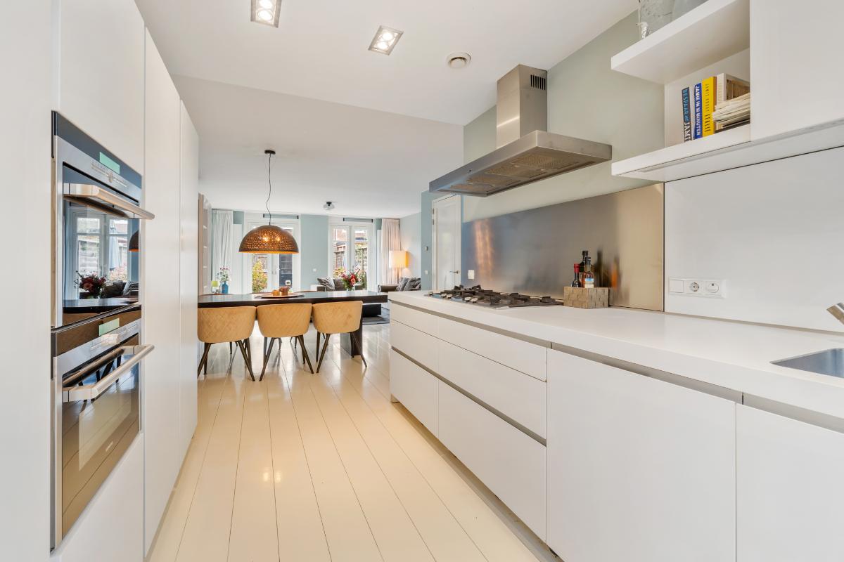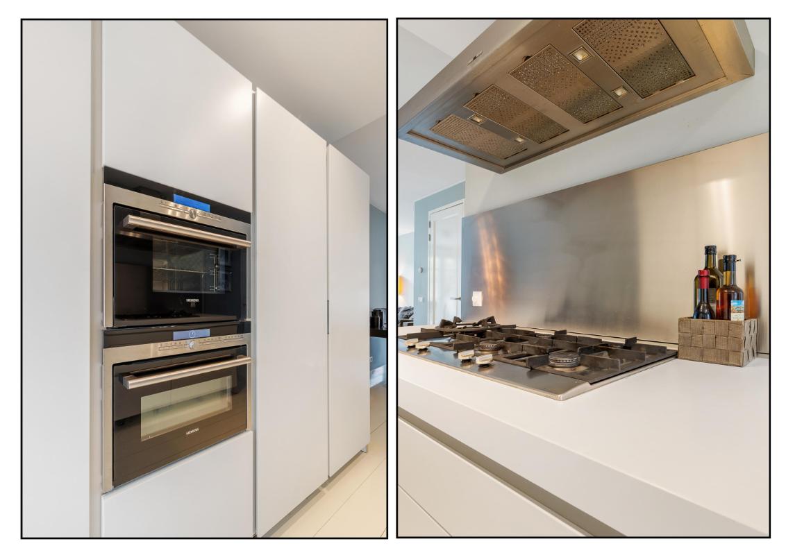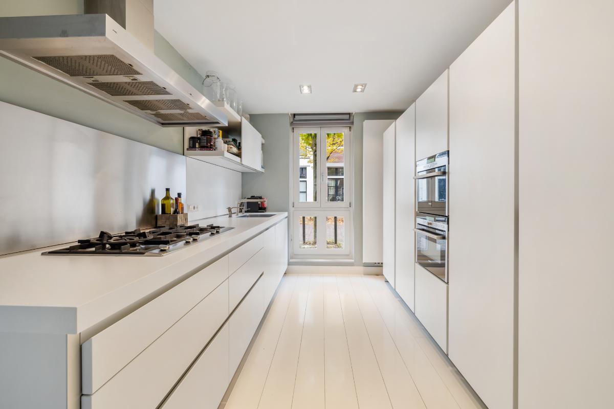 Begane grond: Entree, hal, garderobe, meterkast, toilet met fontein. Royale living met open keuken aan de voorzijde en dubbele openslaande deuren aan de achterzijde. De begane grond is voorzien van een wit gelakte eiken delen vloer. De moderne en luxe keuken is een Bulthaup keuken die is voorzien van alle gemakken en van alle benodigde apparatuur zoals: een koel-vriescombinatie, kookplaat, afzuigkap, Combi-oven, combi-stoomoven, vaatwasser en een Quooker. Alle wanden en het plafond zijn glad gestuukt.