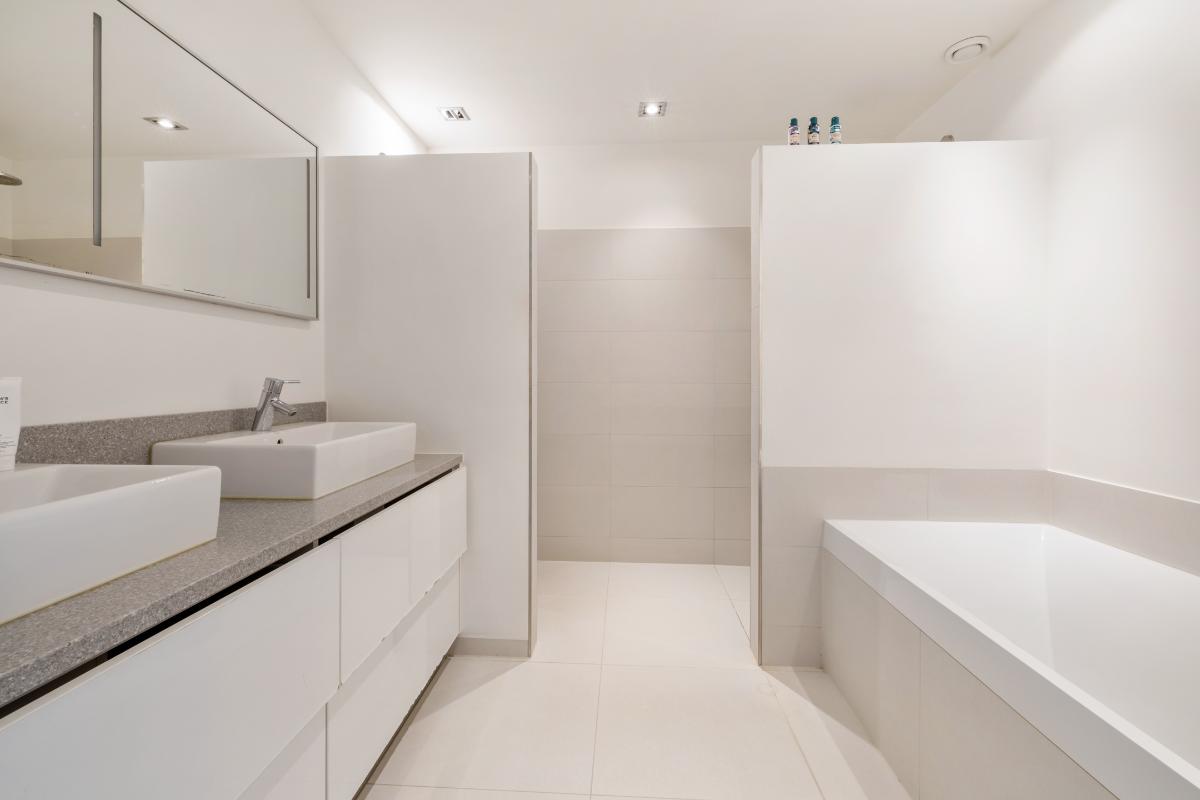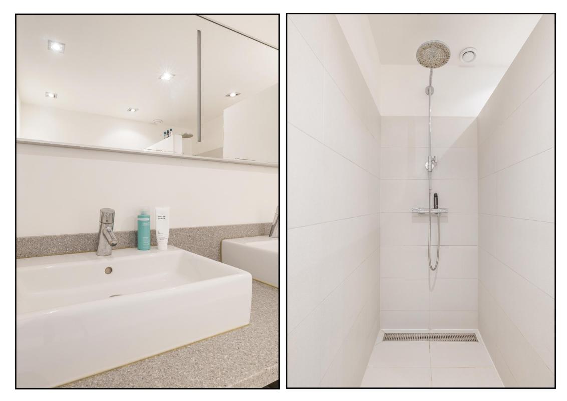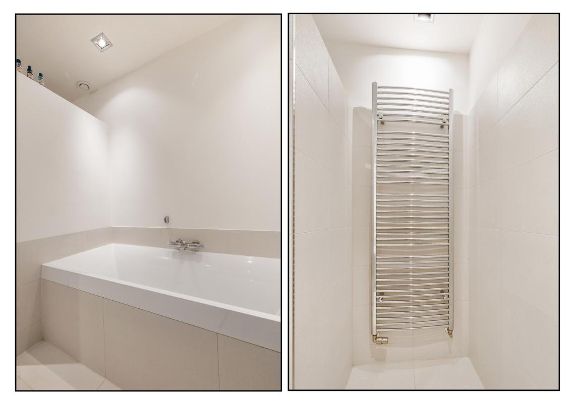 1e verdieping: Overloop, royale slaapkamer aan de voorzijde, Tweede zeer royale slaapkamer en een derde kleinere slaapkamer aan de achterzijde. Luxe badkamer voorzien van vloerverwarming, grote inloopdouche met regendouche, ligbad, dubbele wastafel en een apart toilet met fontein dat tevens is voorzien van vloerverwarming. Ook de 1e verdieping is voorzien van een wit gelakte eiken delen vloer.