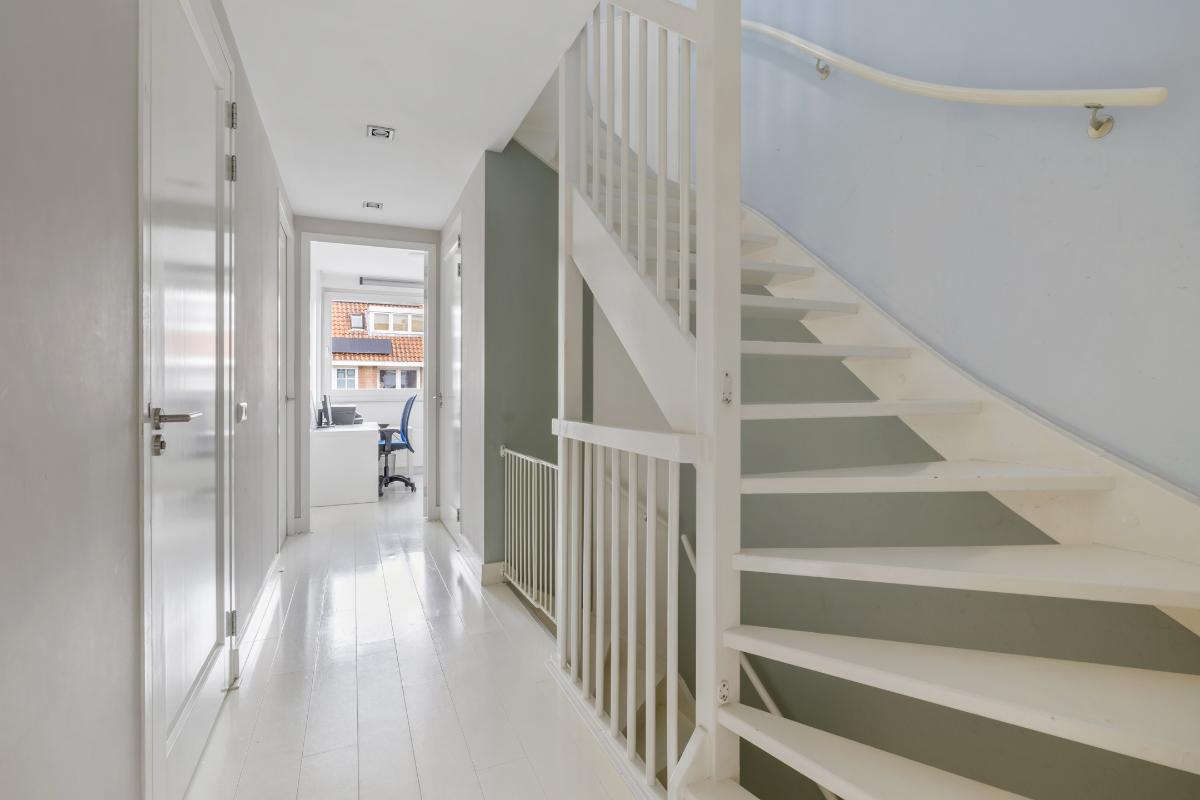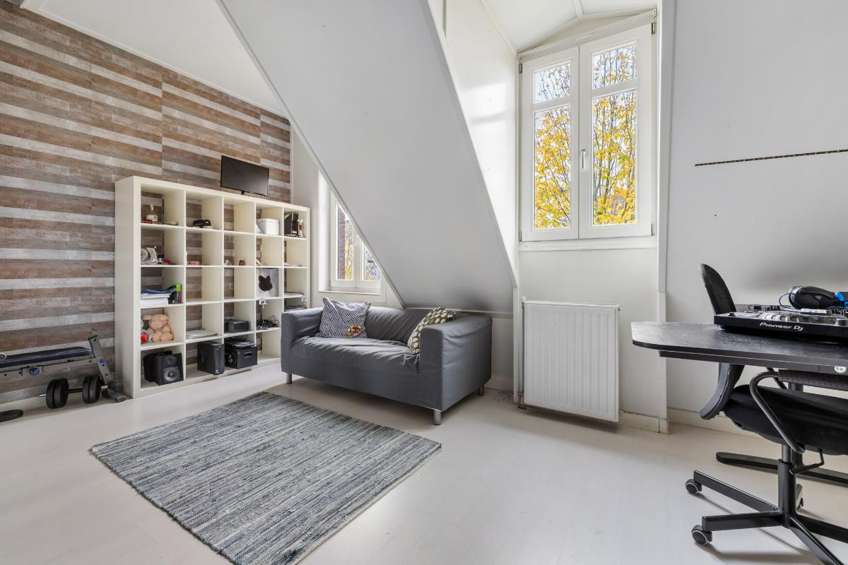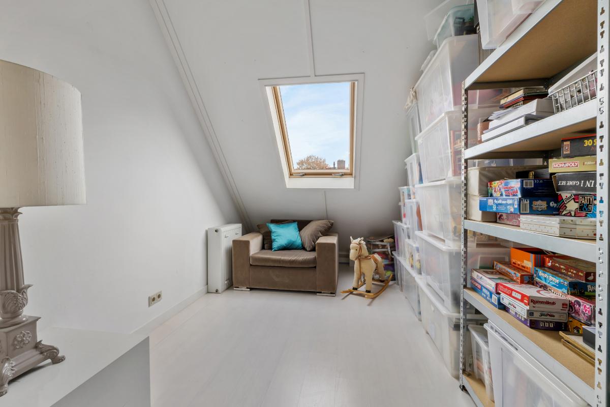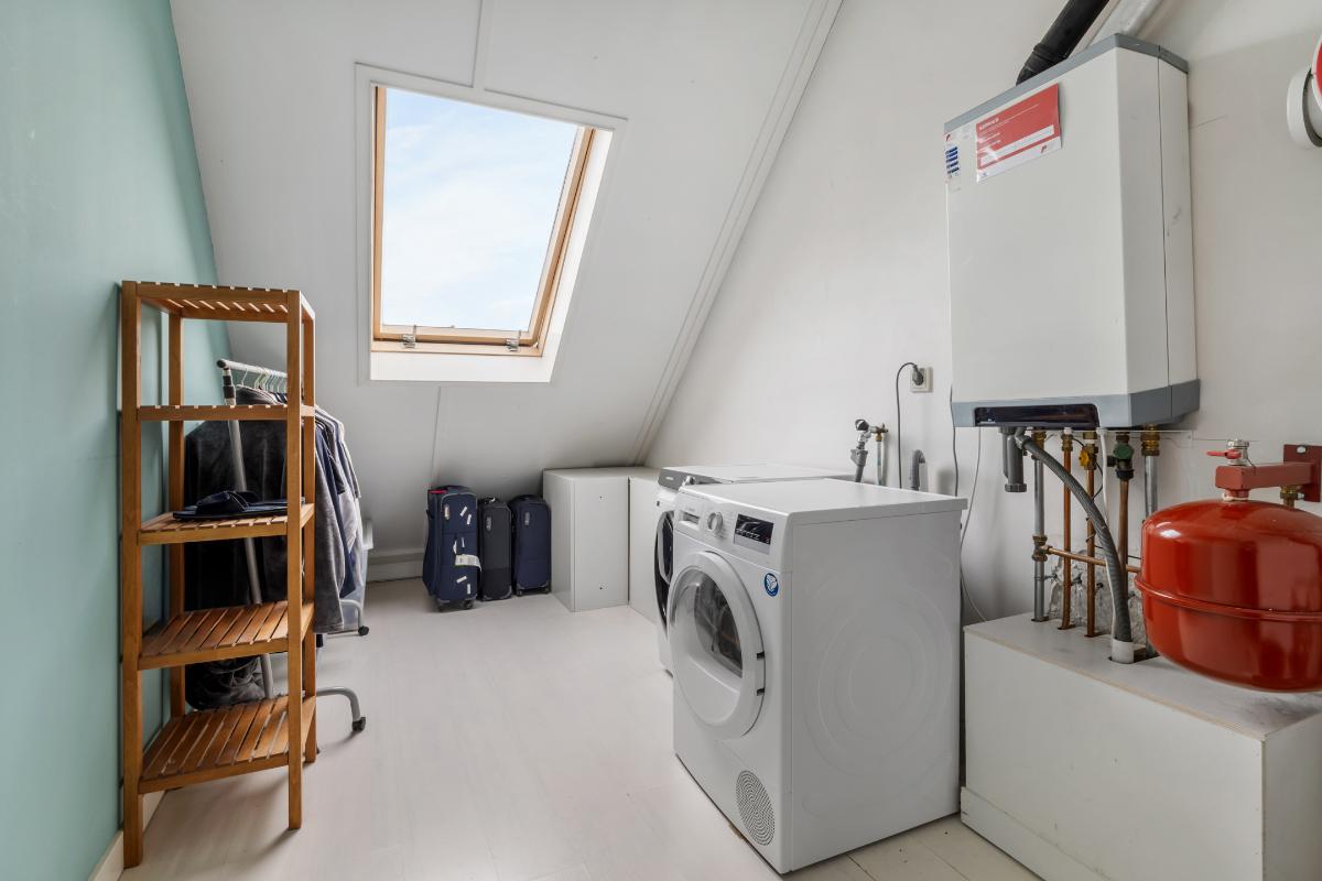 2e verdieping: Via vaste trap bereikbare zeer royale zolderetage met overloop. De zolder heeft 2 ruime slaapkamers en een technische ruimte met de aansluitingen voor wasmachine, droger, c.v. ketel en mechanische ventilatie. In deze ruimte kan desgewenst nog een 2e badkamer worden aangebracht. De zolderverdieping heeft mooie hoge plafonds.