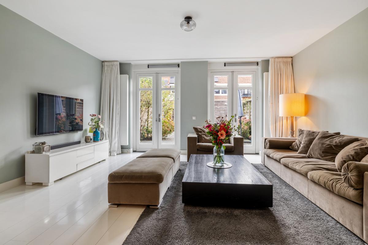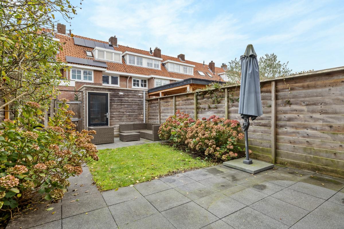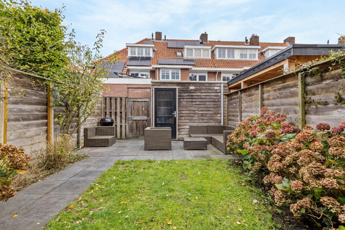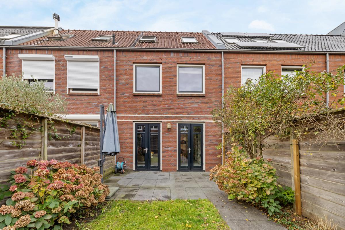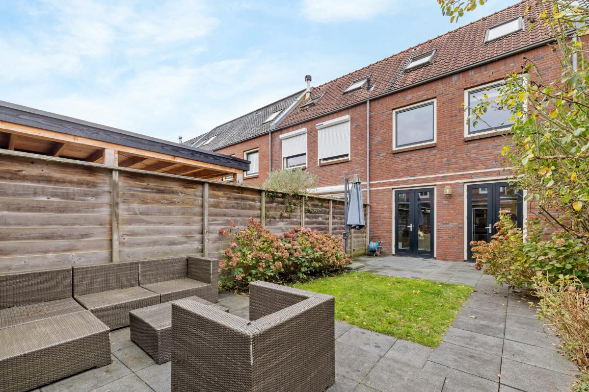 Tuin: De achtertuin is op het oosten gesitueerd en fungeert als een verlenging van de woonkamer en sluit hier met dubbel openslaande deuren mooi op aan. Er is een schuur die is voorzien van elektra en er is een achterom.